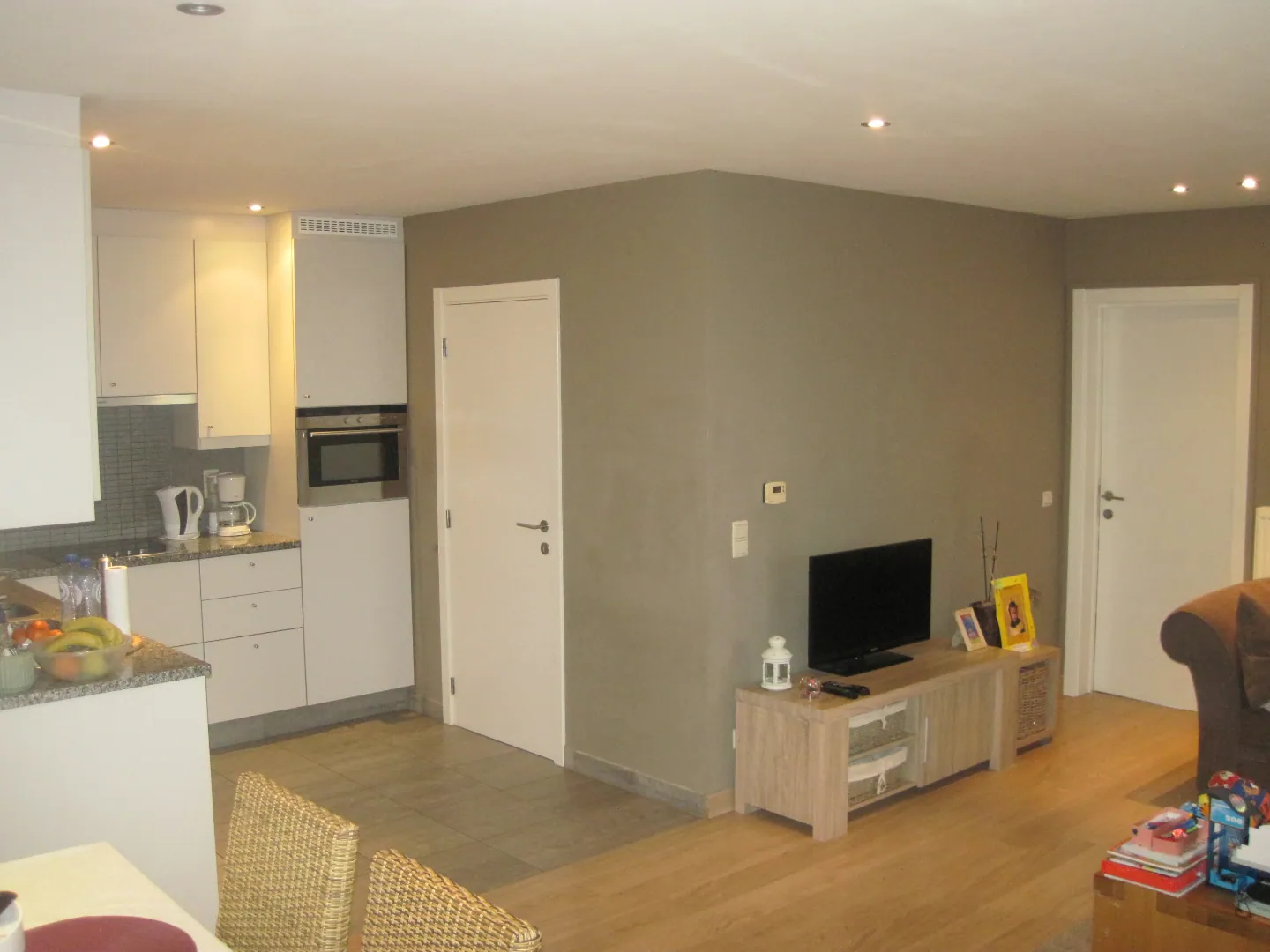 De aangename leefruimte sluit aan op een open keuken, met een afzonderlijke praktische berging.