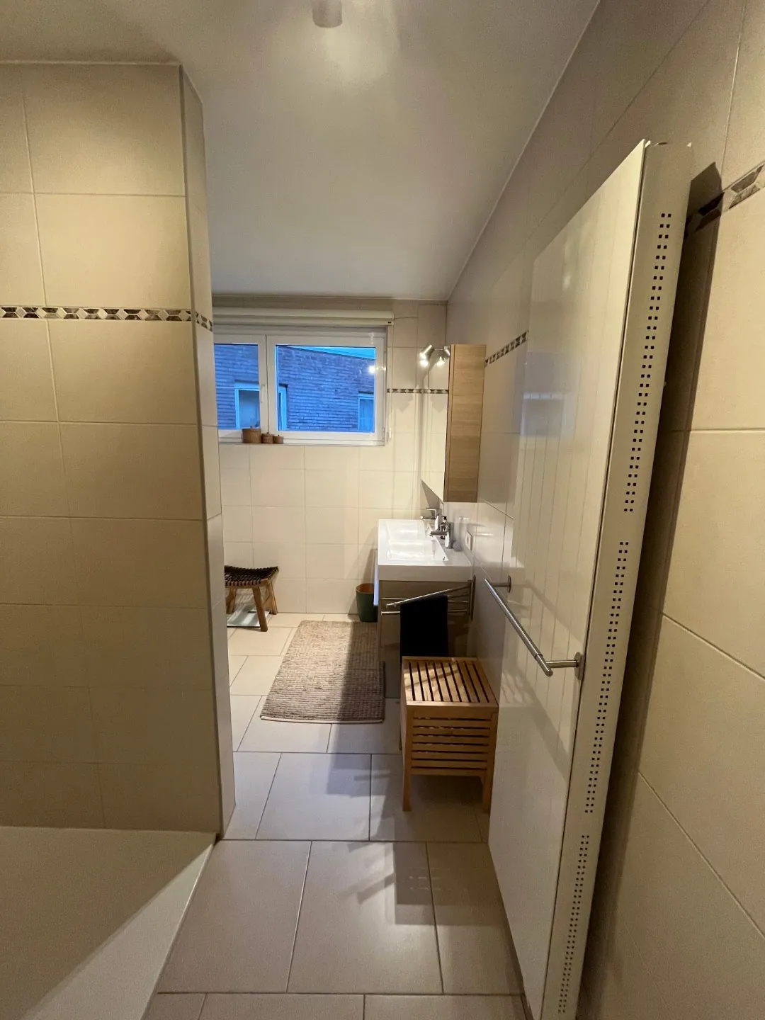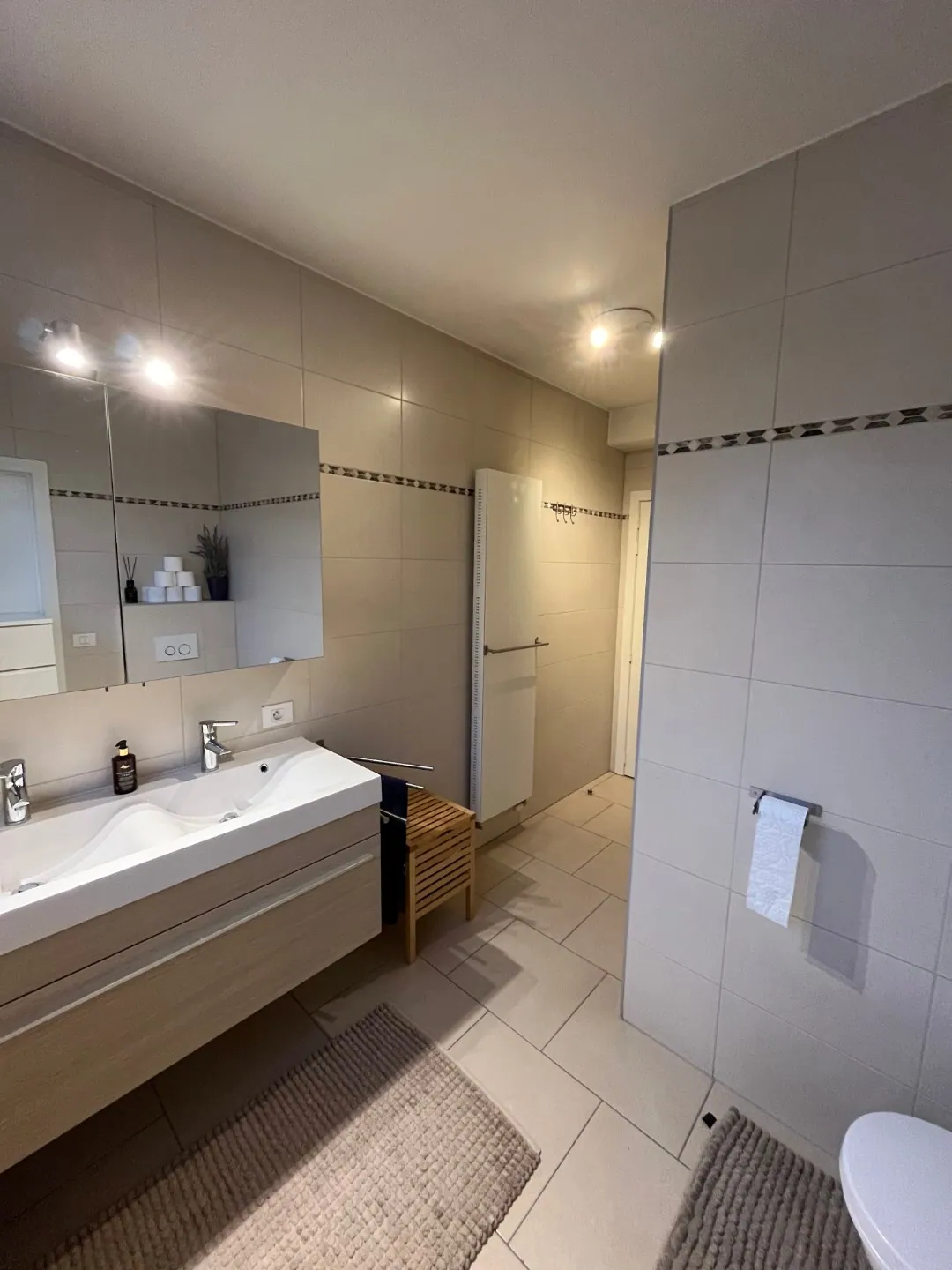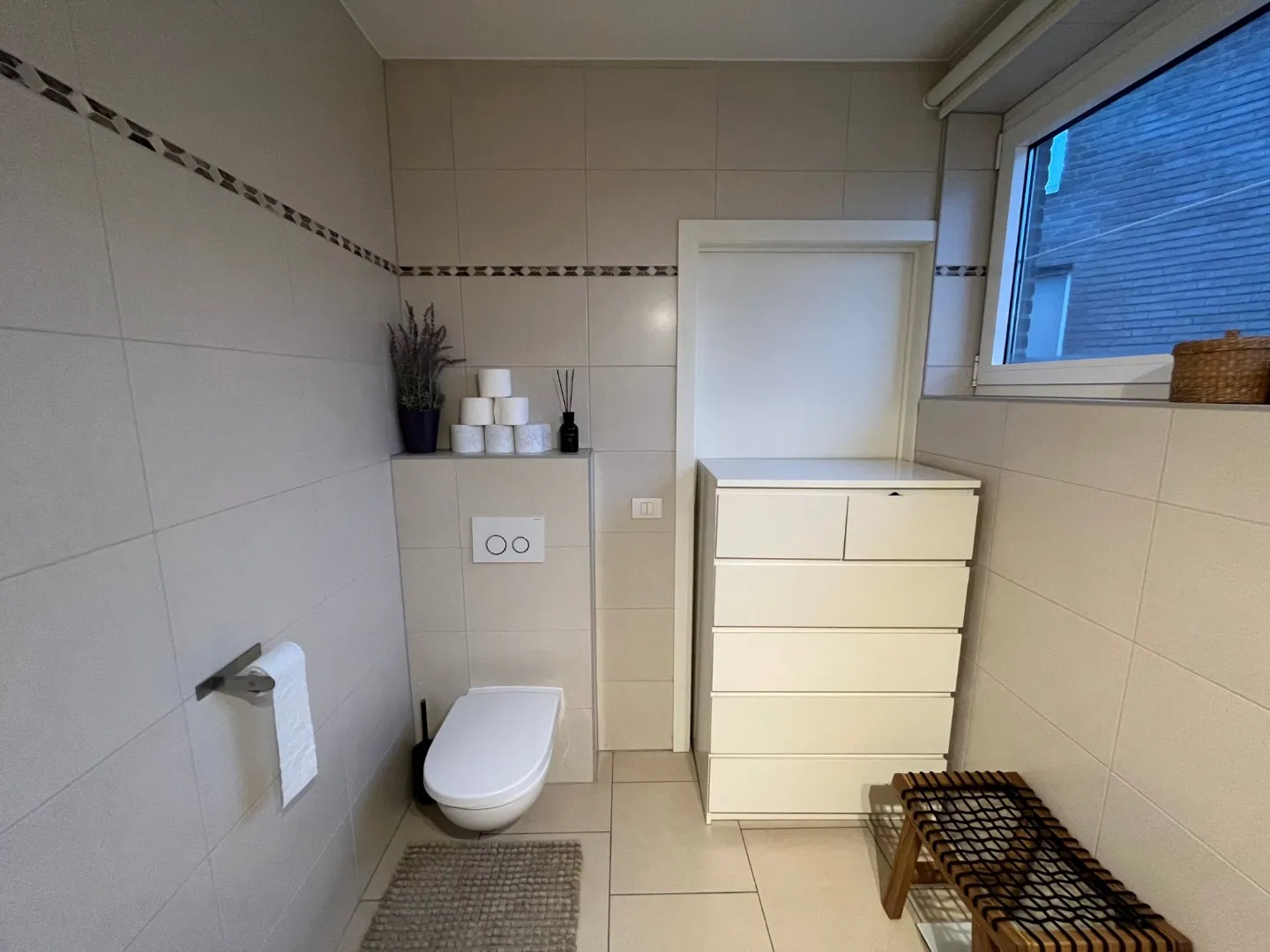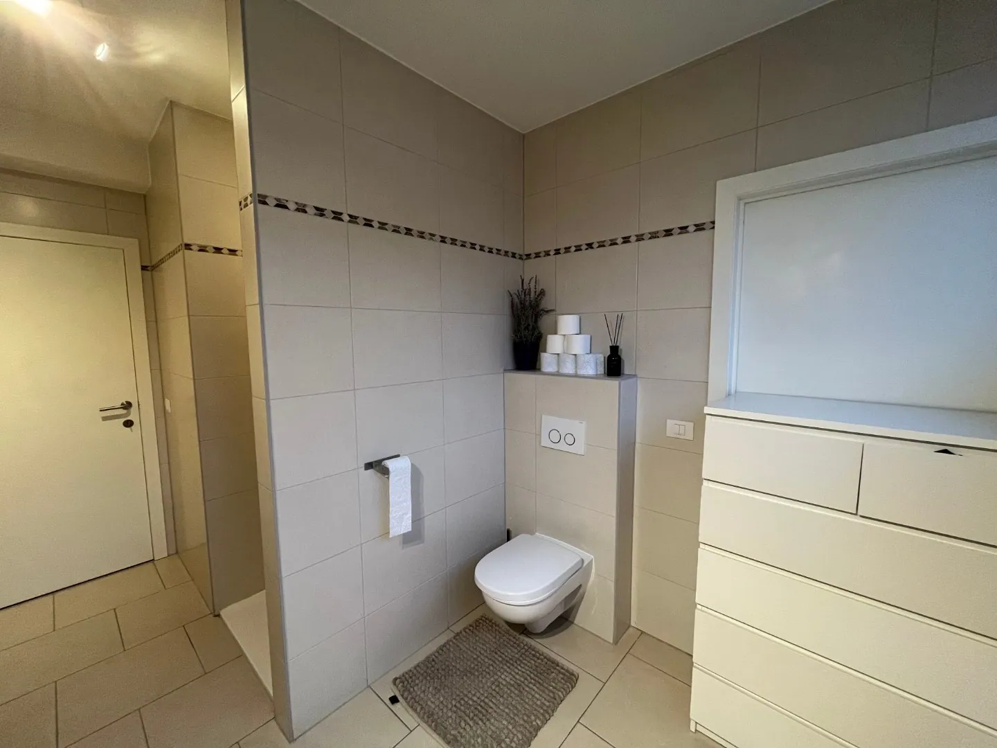 Dit hedendaagse appartement is voorzien van een inkom met gastentoilet, ruime leefruimte met open (volledige uitgeruste) keuken, 2 slaapkamers met aangename parketvloer, praktische badkamer (met dubbele lavabo en regendouche) en 2 bergruimtes.