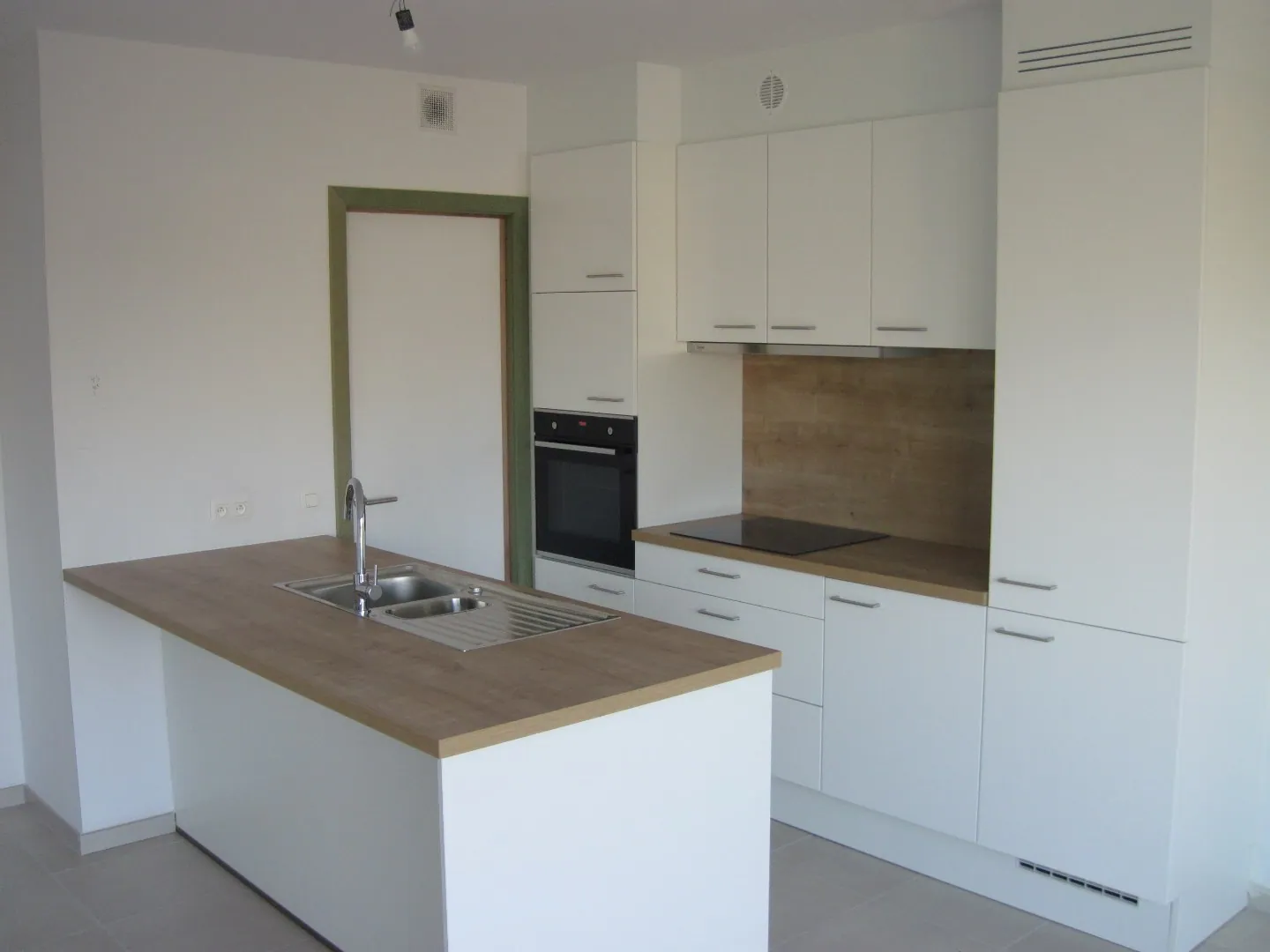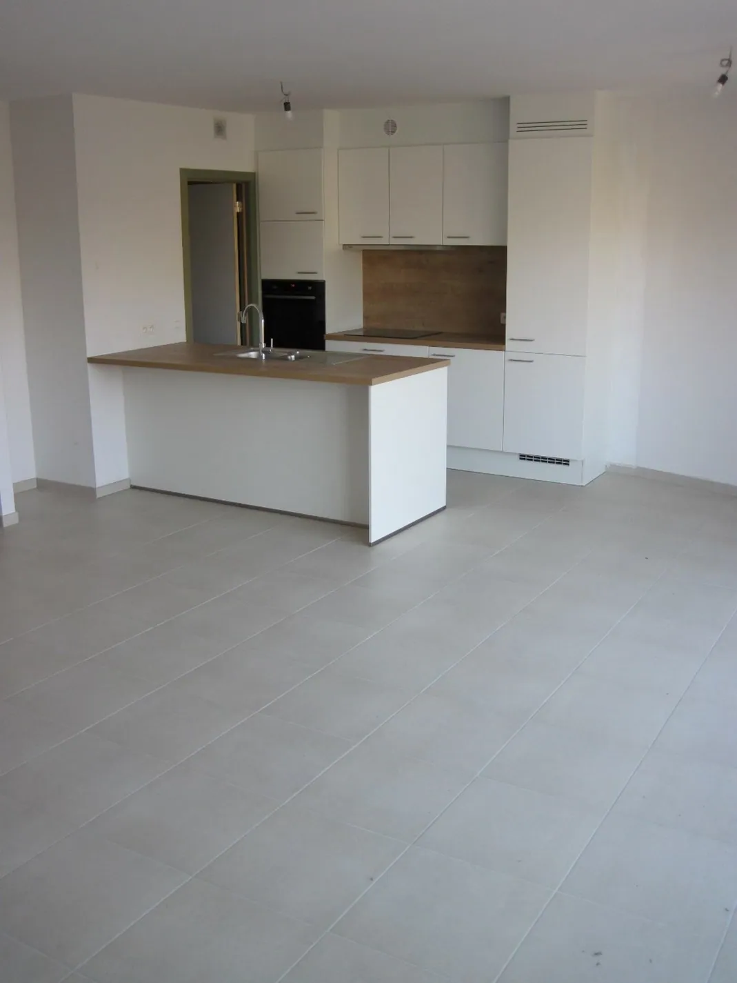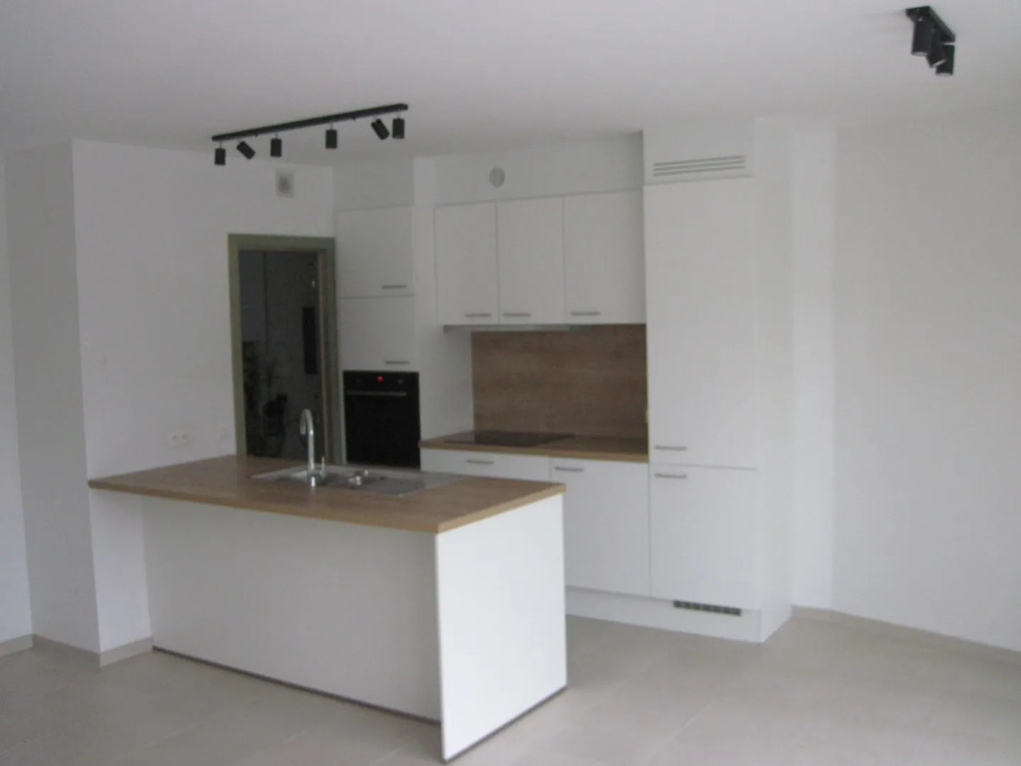 De inkomhal brengt ons in de leefruimte van dit appartement. De - zeer ruime en lichtrijke -leefruimte sluit aan op de moderne open keuken. Naast de keuken situeert zich eveneens een praktische berging.