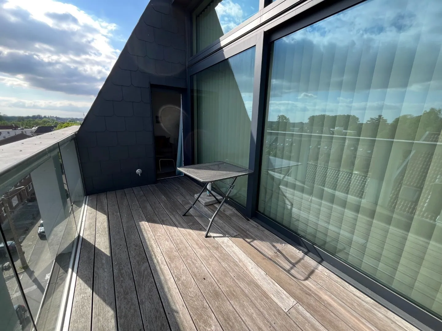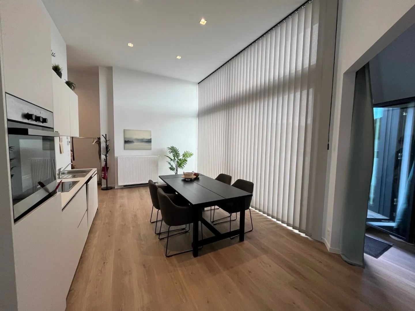 Lichtrijke leef- en eetruimte met ingerichte open keuken (koelkast, vaatwasser, oven, inductiekookplaat), met directe toegang tot het ruime terras. De hoge plafonds zorgen voor een aangenaam loftgevoel.
