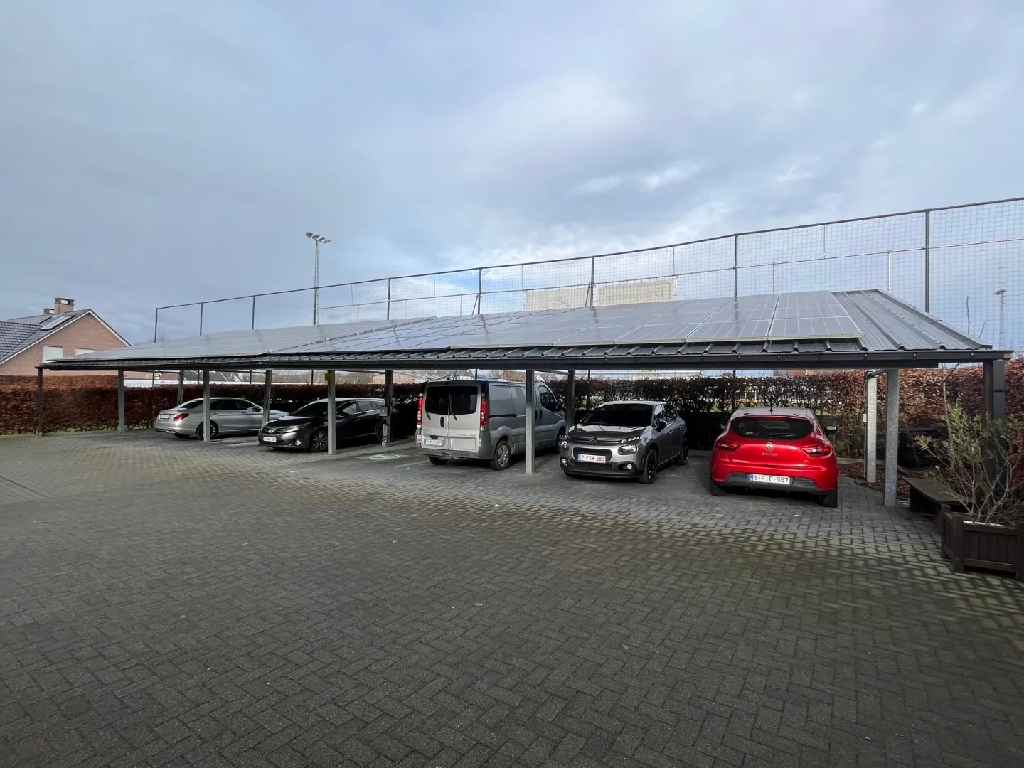Er is voldoende plaats op het terrein, zowel onder de carport als vooraan (nr. 65 en 67) om vrij te parkeren. Bovendien zijn er publiek toegankelijke snelladers Smappee van 22 KW onder de carport en vooraan.