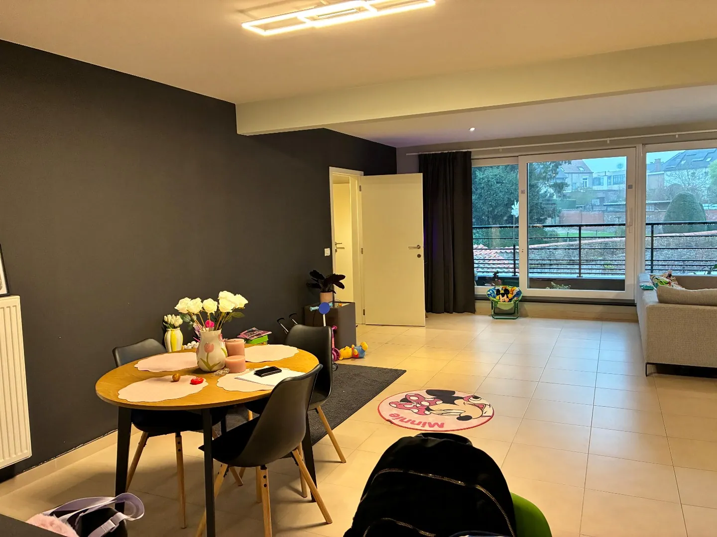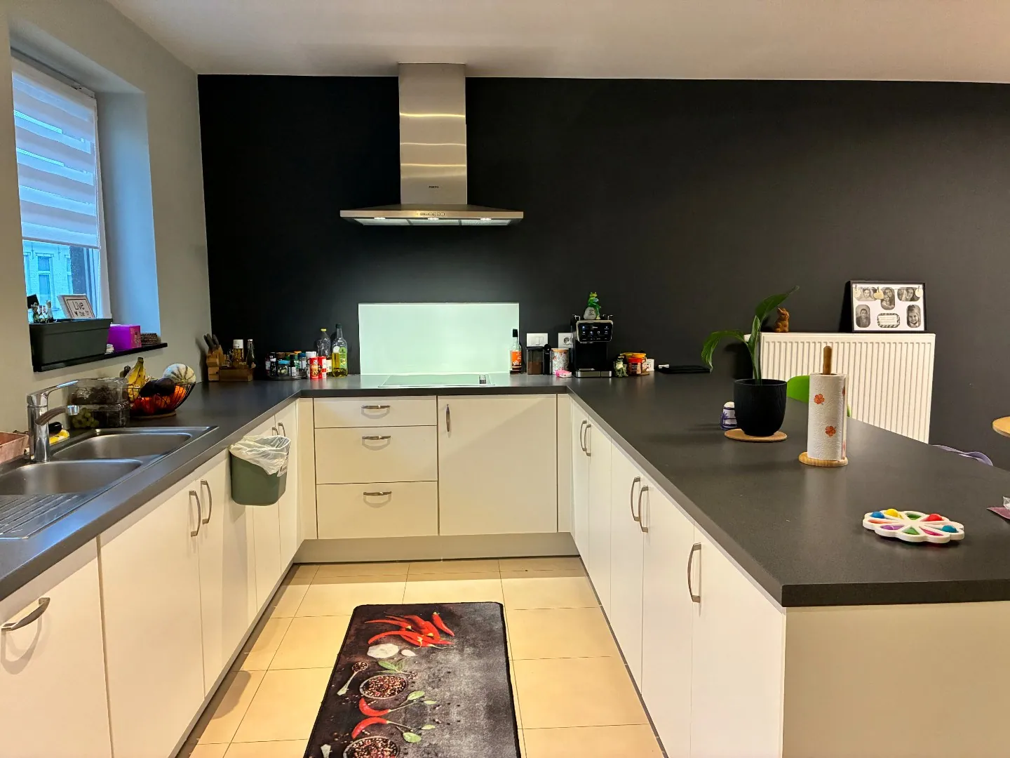 Via de privatieve inkom komt u in de lichtrijke leefruimte, waarin de eigentijdse keuken geïntegreerd werd.