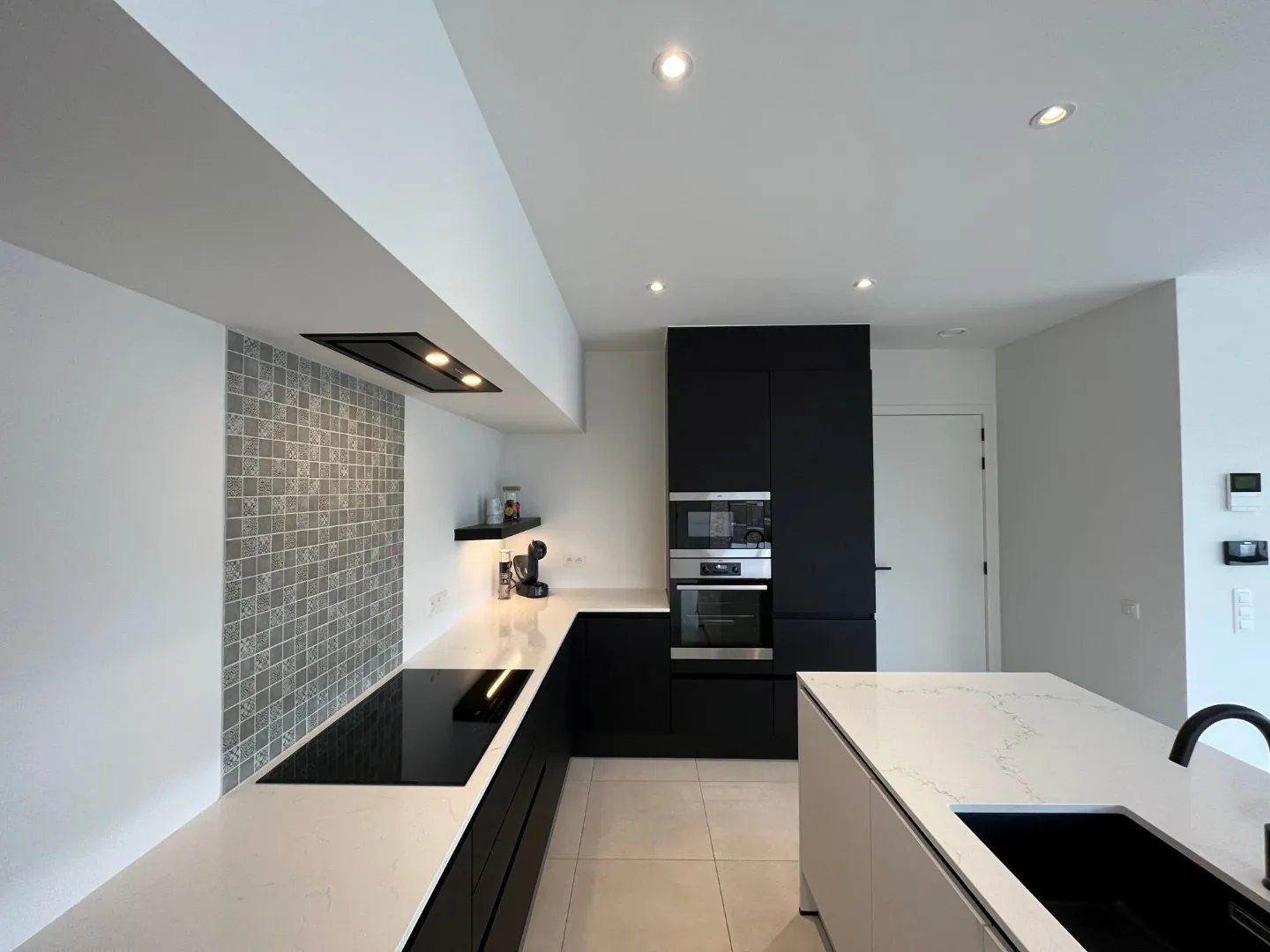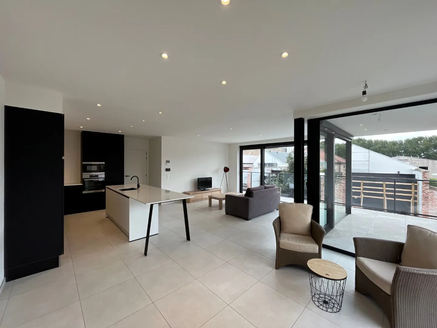 De ruime en lichtrijke leefruimte is uitgerust met een moderne open keuken met centraal kookeiland. De keuken is voorzien van alle hedendaagse toestellen, waaronder o.a. een microgolfoven, oven, vaatwasser en koelkast, en beschikt over voldoende kastruimte. Vanuit de leefruimte geniet u van veel natuurlijk licht en directe toegang tot het aangename zuidwest georiënteerde terras.