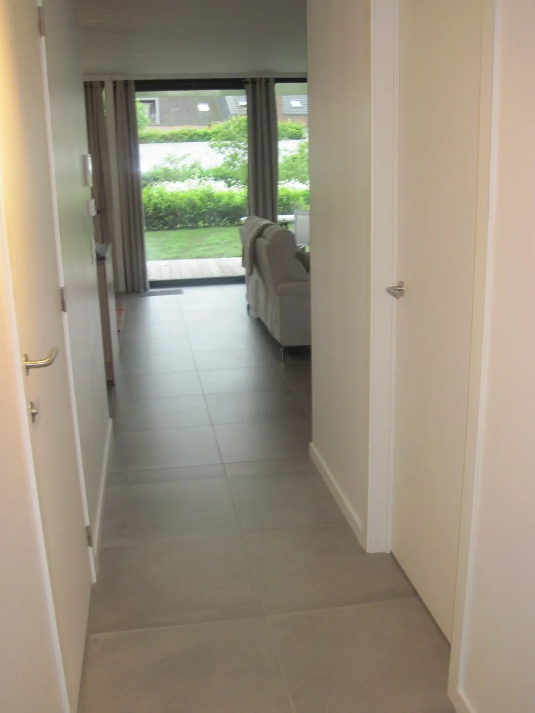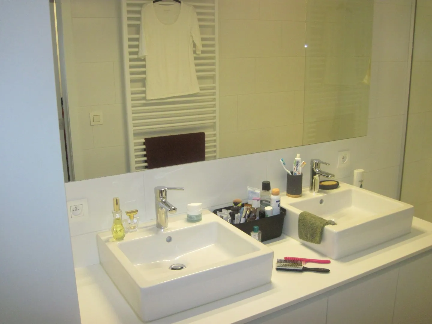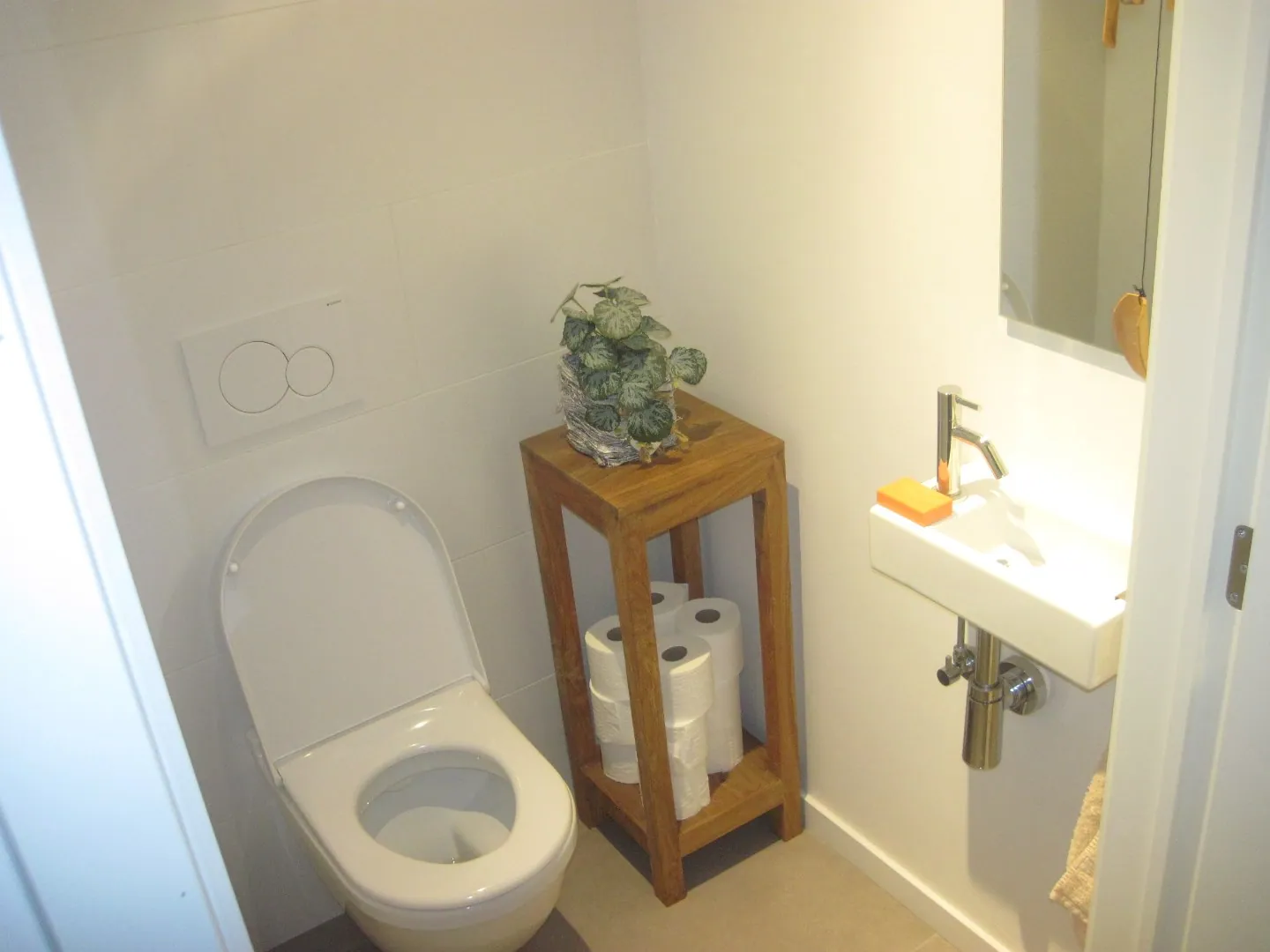 Binnen vinden we naast de grote slaapkamer een afzonderlijke badkamer, en een afzonderlijk gastentoilet terug.
