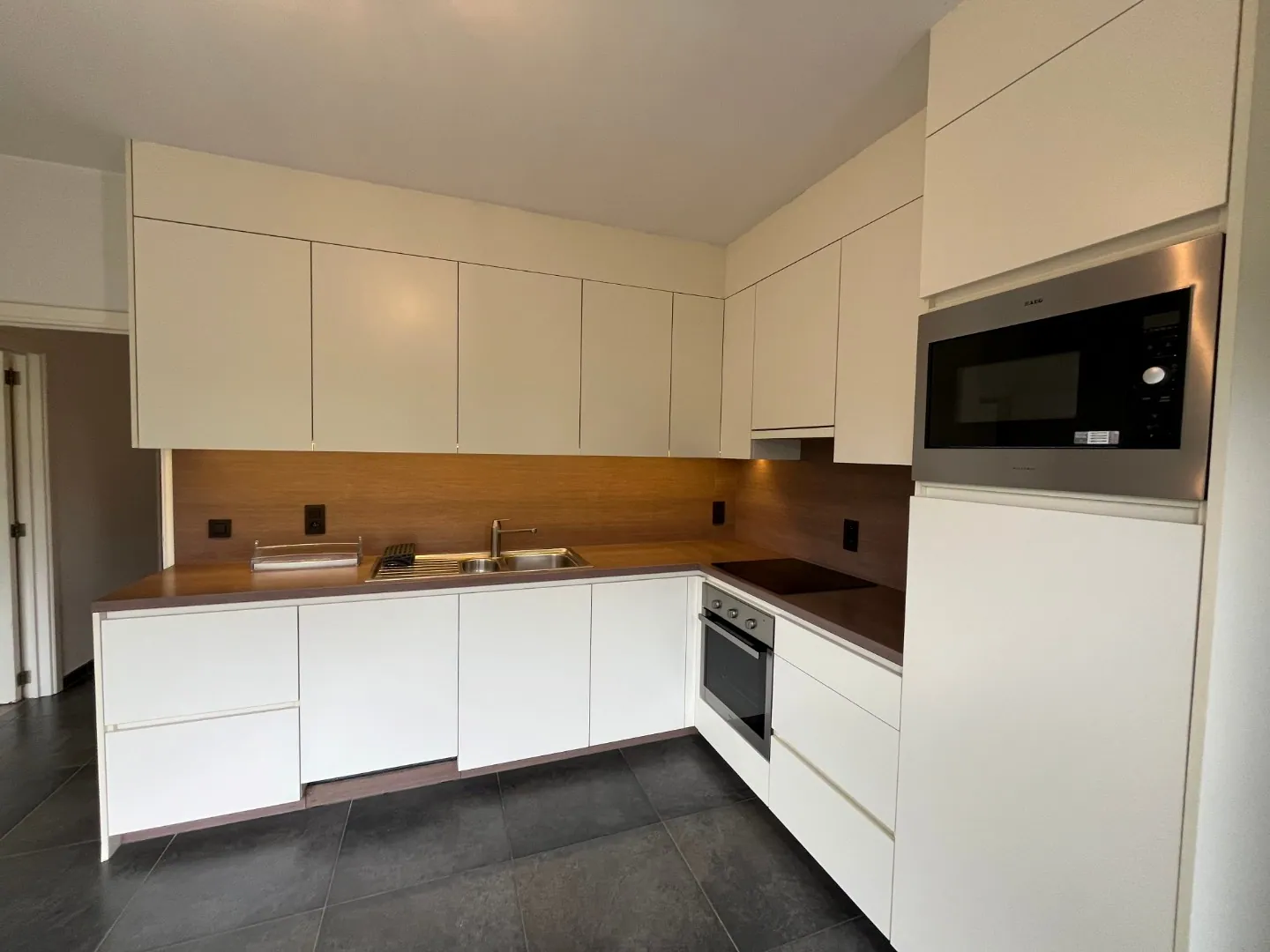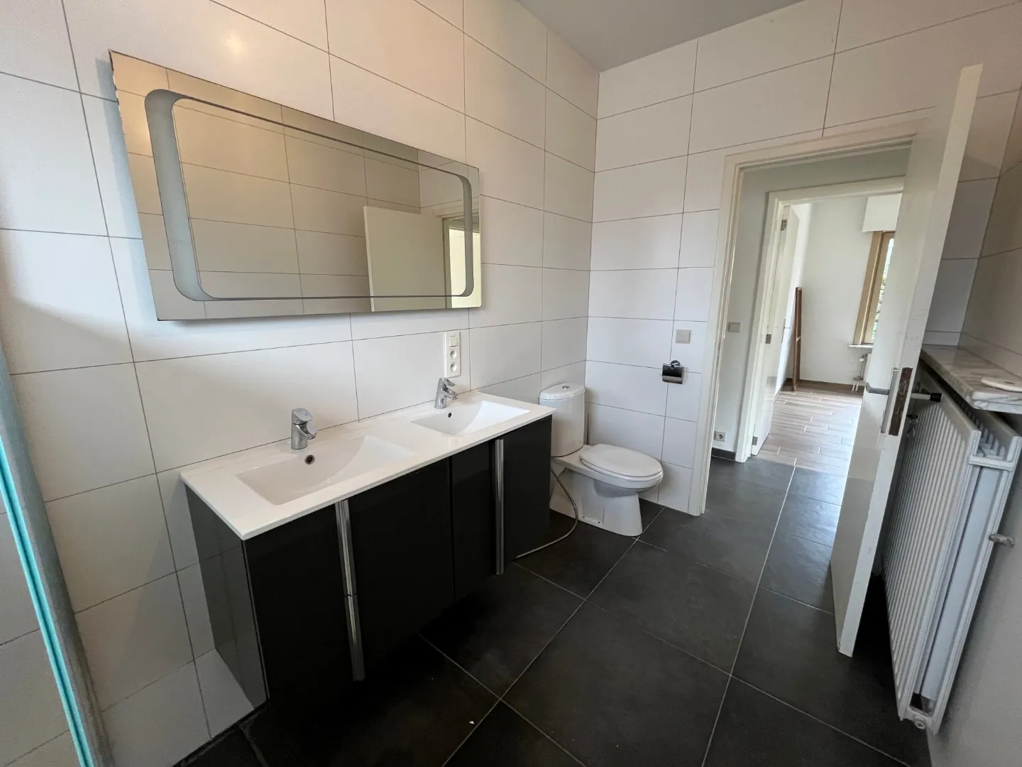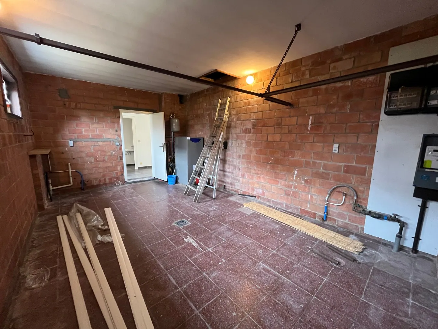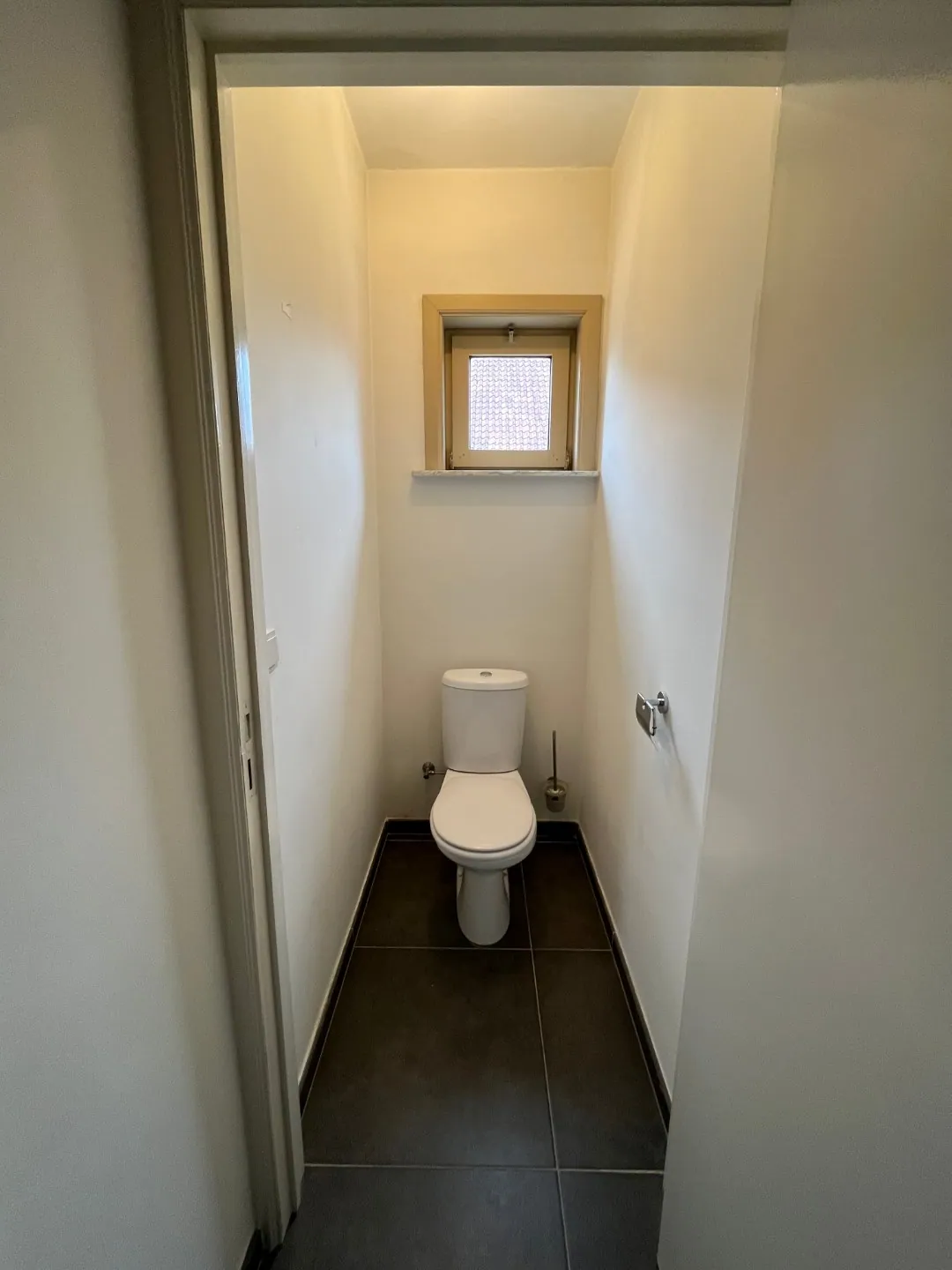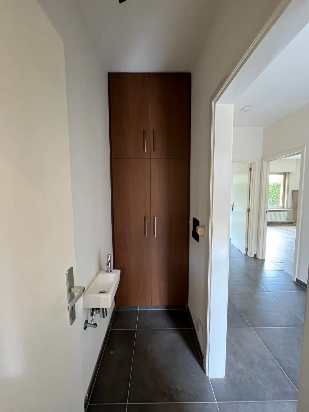Bij binnenkomst vind je een inkomhal met vestiaire en afzonderlijk toilet. De ruime en lichtrijke leefruimte sluit aan op de volledig ingerichte keuken (vaatwasser, oven, microgolf en keramische kookplaat) met aanpalende kelderberging. Vanuit de keuken is er directe toegang naar het terras en de tuin.