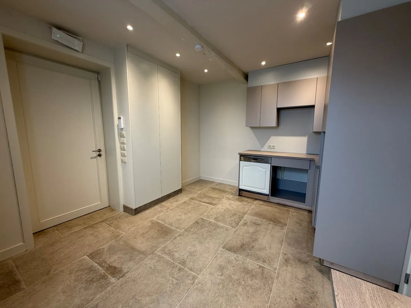 Daarnaast is er een sanitair aanwezig met twee toiletten en een lavabo, wat extra comfort biedt voor zowel personeel als bezoekers. Verder is er een aparte ruimte met kitchenette, die eveneens mogelijkheden biedt voor extra stockage of praktische ondersteuning van de activiteiten.