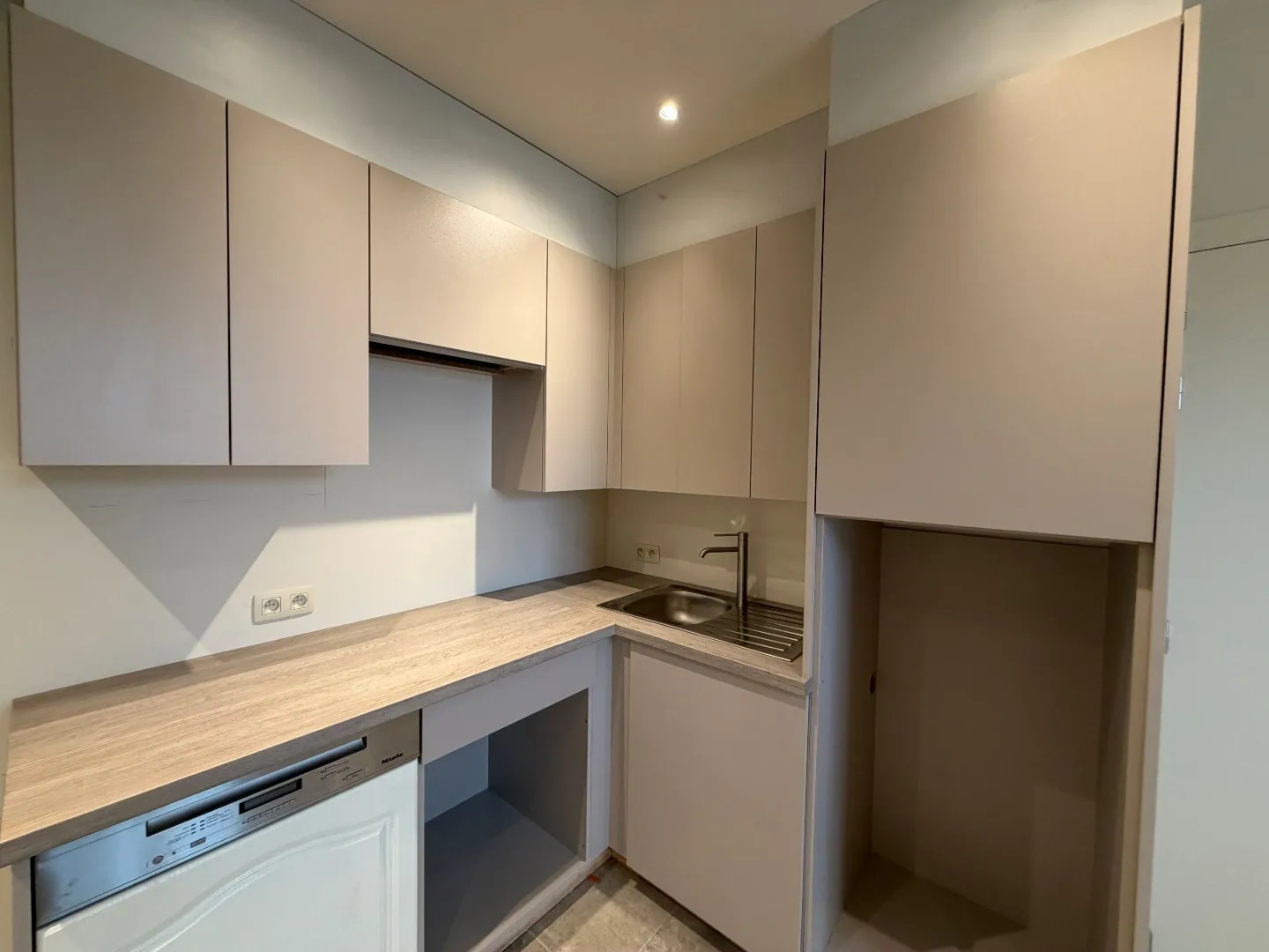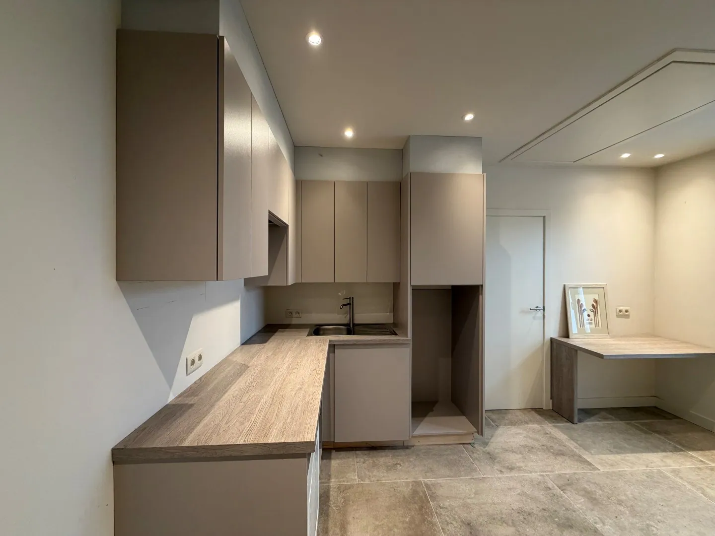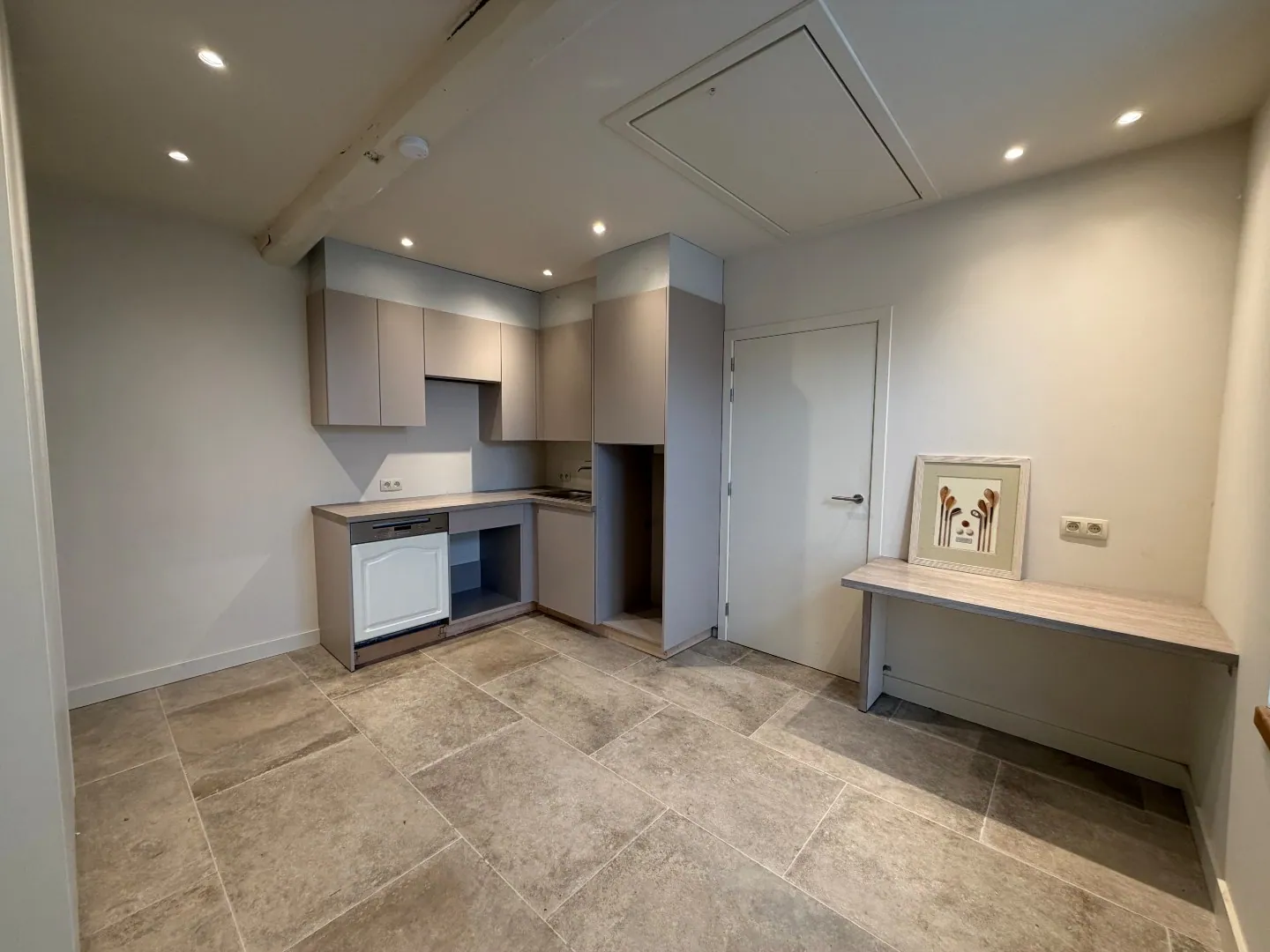 Daarnaast is er een sanitair aanwezig met twee toiletten en een lavabo, wat extra comfort biedt voor zowel personeel als bezoekers. Verder is er een aparte ruimte met kitchenette, die eveneens mogelijkheden biedt voor extra stockage of praktische ondersteuning van de activiteiten.