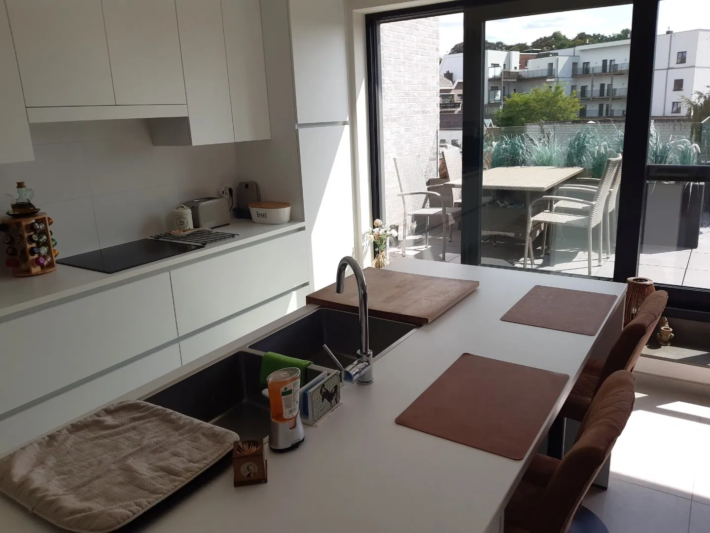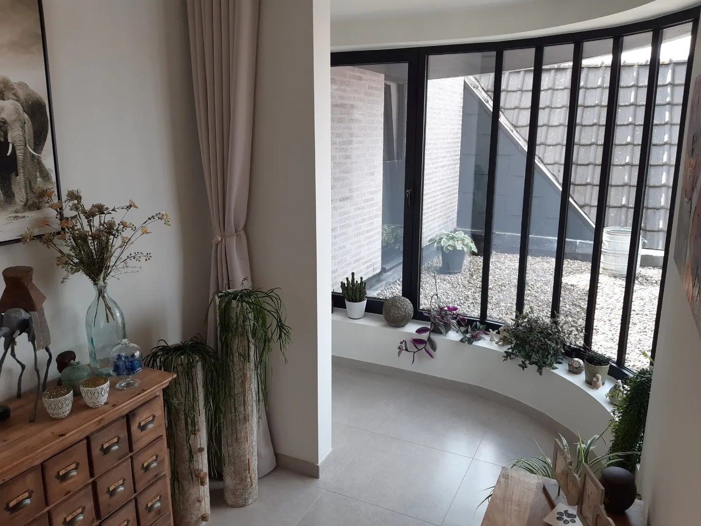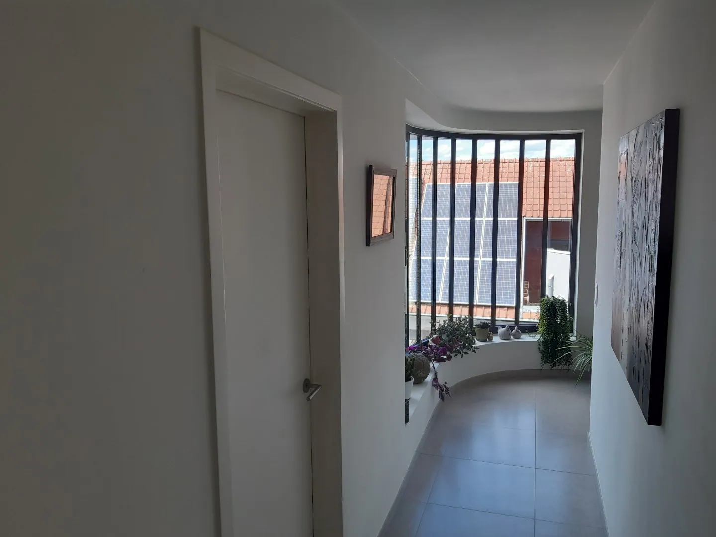 De stijlvolle inkom, waar de 3 slaapkamers, gastentoilet en badkamer gelegen zijn, (de gebogen raampartij is een eye-catcher) brengt u naar de lichtrijke leefruimte met volledig geïnstalleerde open keuken met ruime berging.