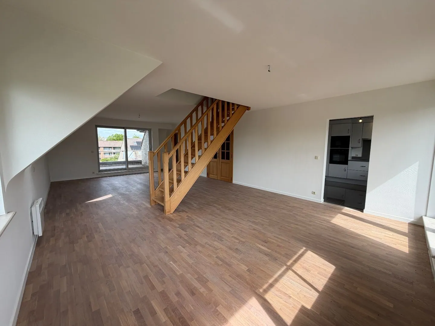 De prachtige leefruimte vormt het hart van dit duplex-appartement. Van hieruit hebt u toegang tot de afzonderlijke keuken en tot een aparte slaapkamer met sanitaire cel (douche en lavabo). De lichtrijke leefruimte geeft bovendien uit op twee zonneterrassen (1 vooraan en 1 achteraan).