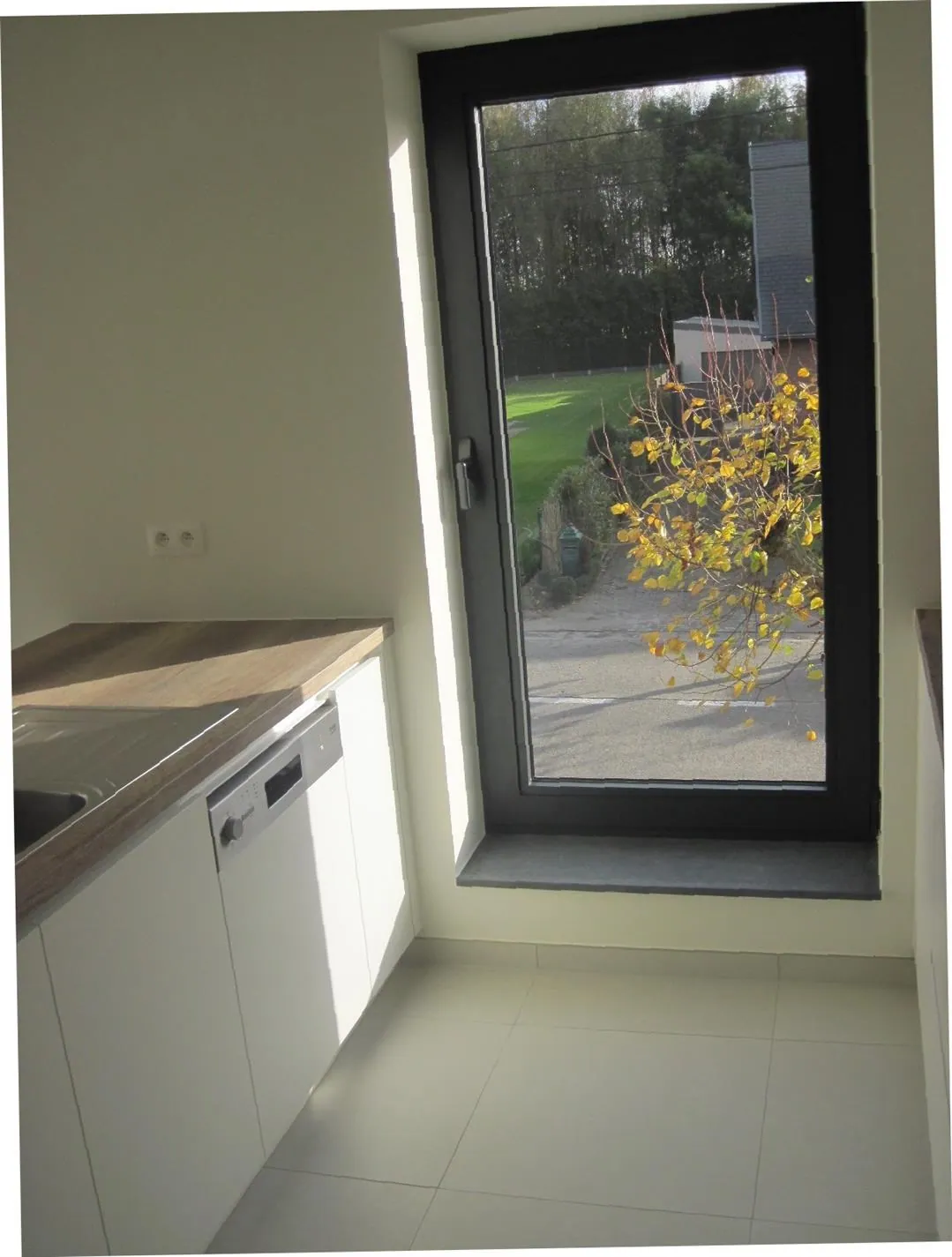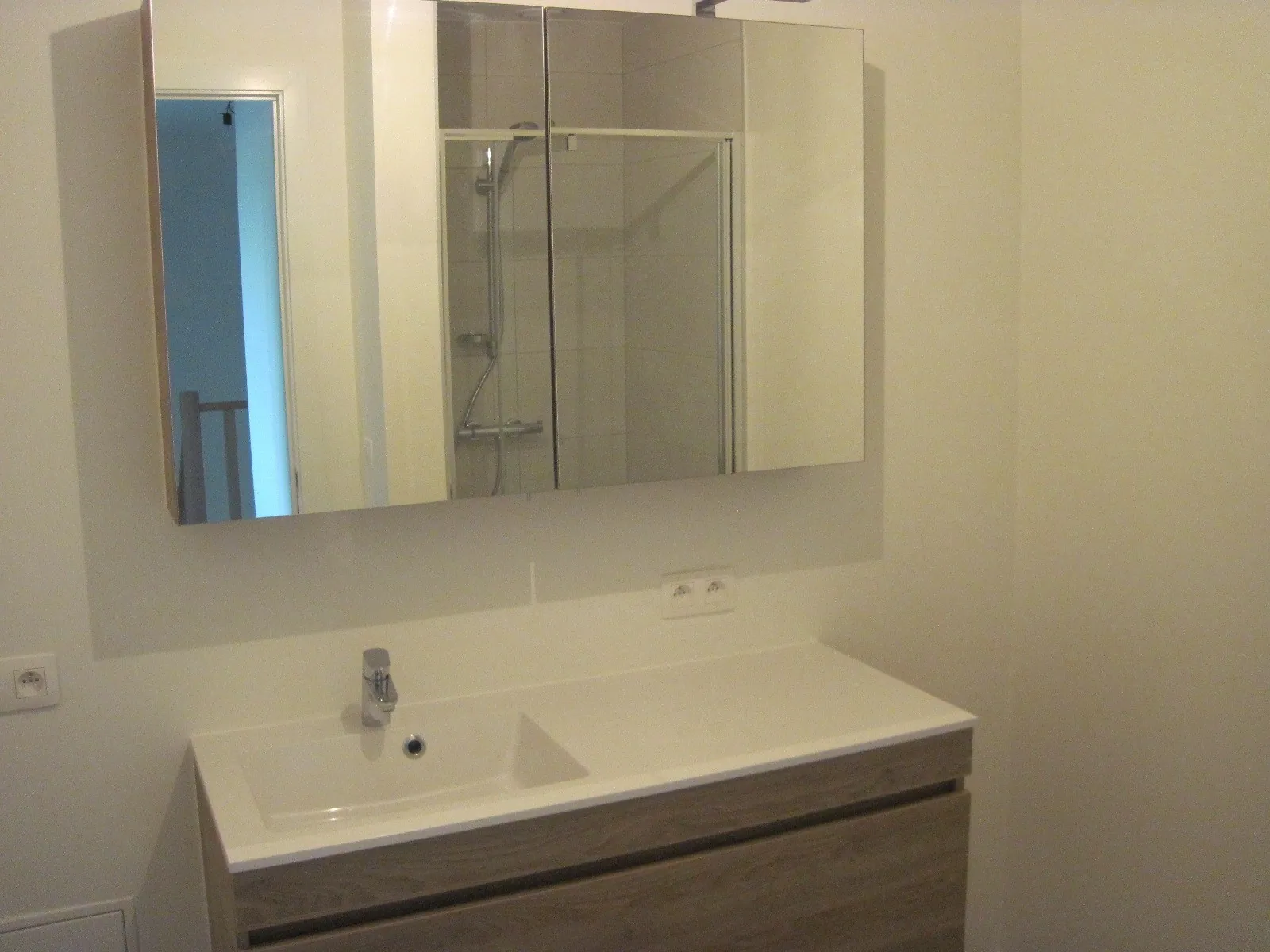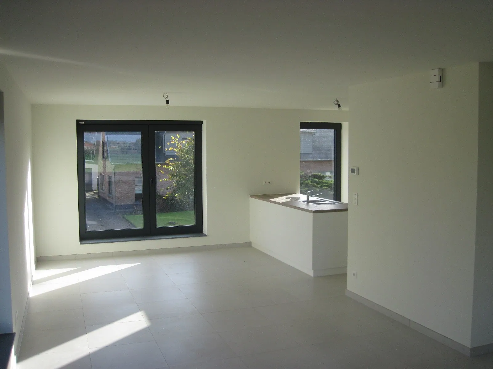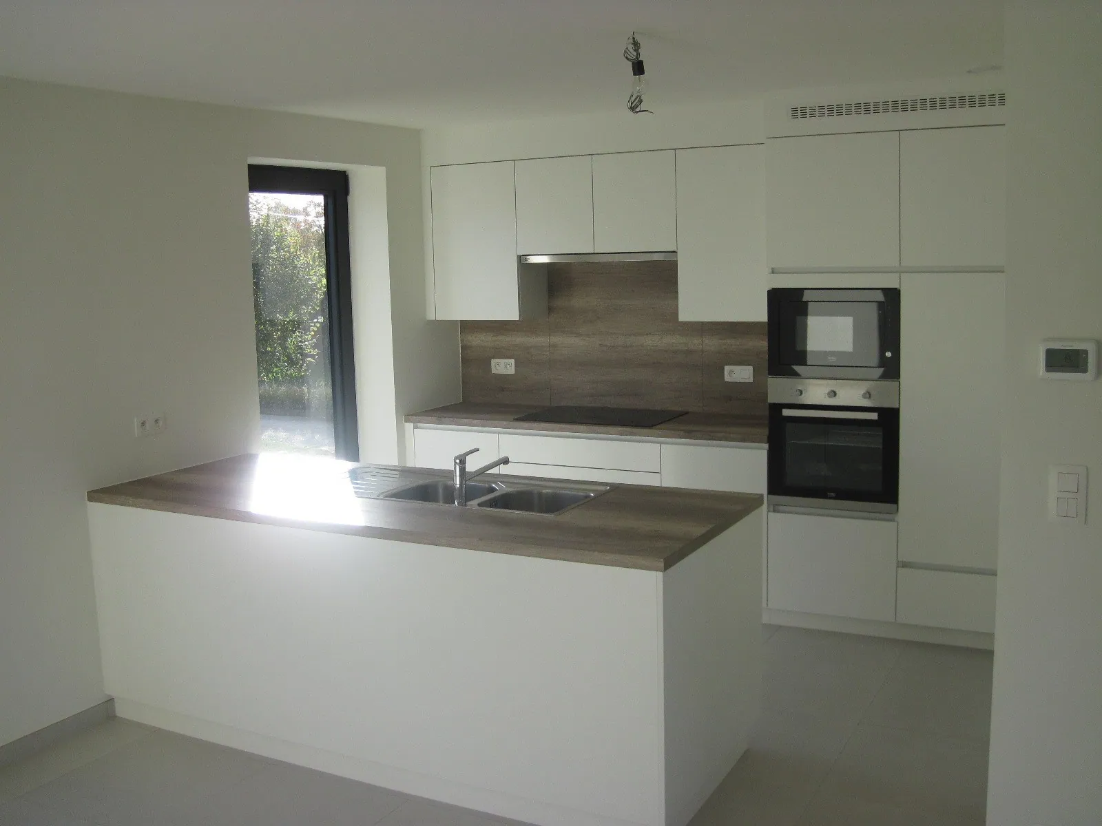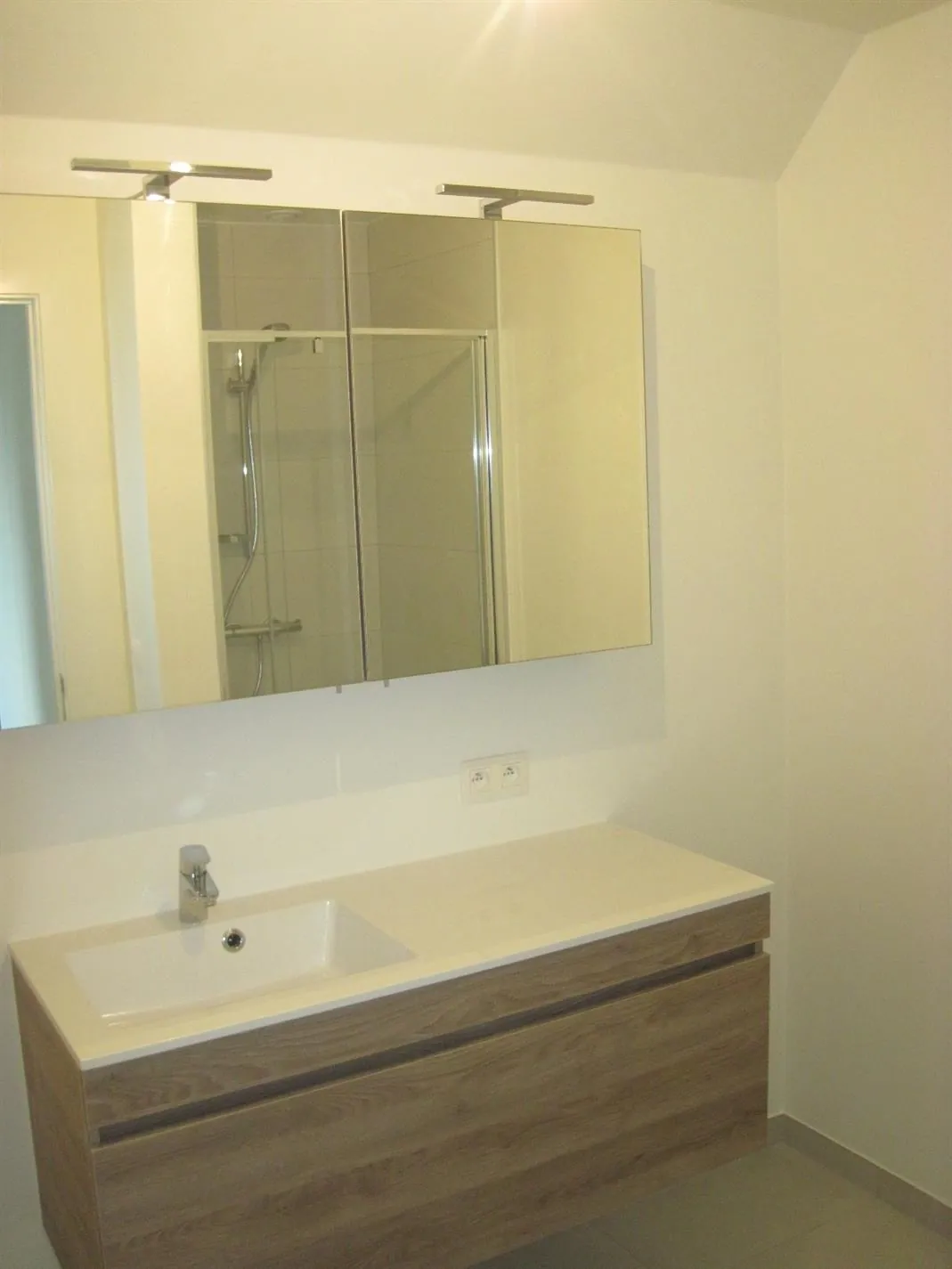 Op de eerste verdieping treft u het woon- en leefgedeelte : de eet- en zithoek kijkt uit op het prachtige, overdekte terras. De open keuken is voorzien van een praktische berging.