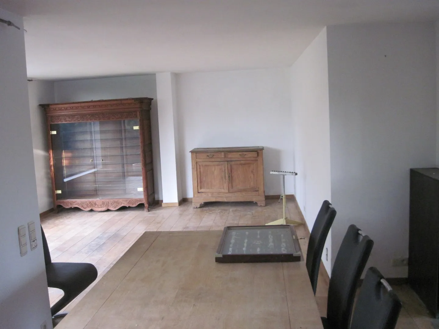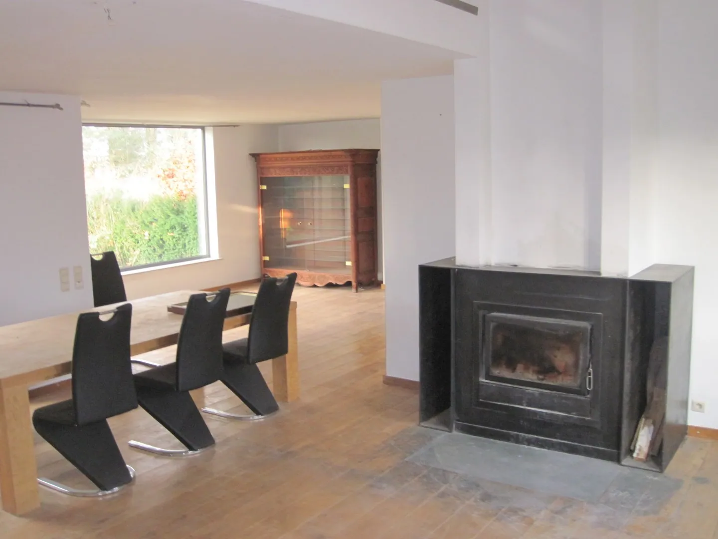 Het gelijkvloers beschikt over een ruime, ietwat geschrankte leefruimte, met aansluitend enerzijds een afzonderlijke ruimte (mogelijks bureau) en anderzijds de keuken. Naast de keuken situeert zich een berging, een wasplaats, ... (en de voormalige garage, die omgevormd werd tot stookplaats).