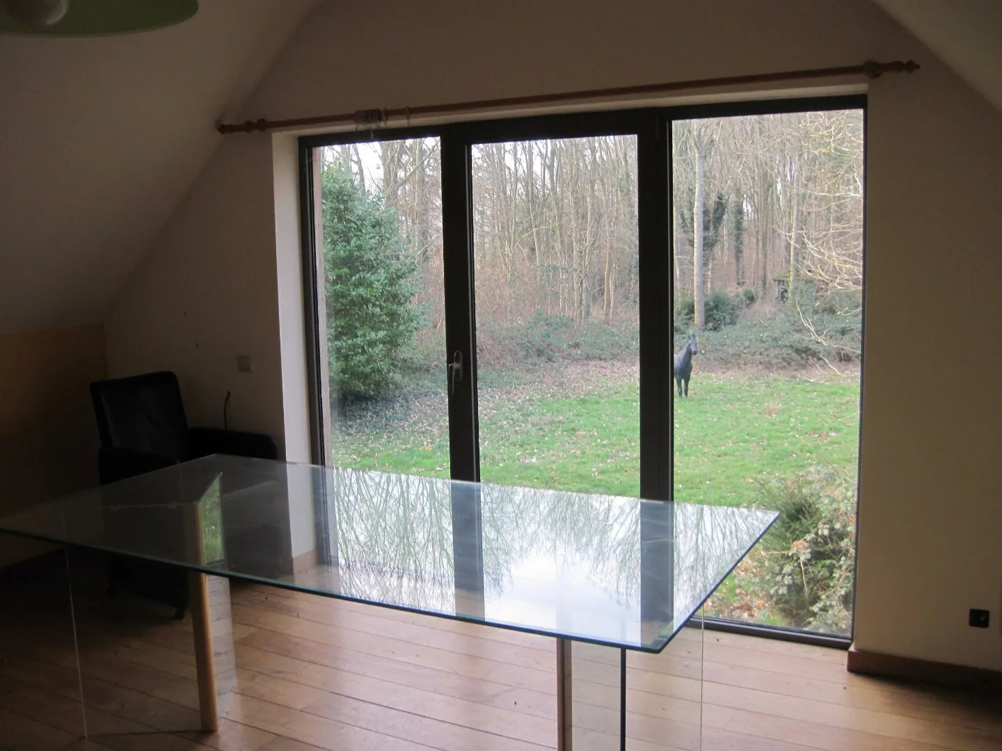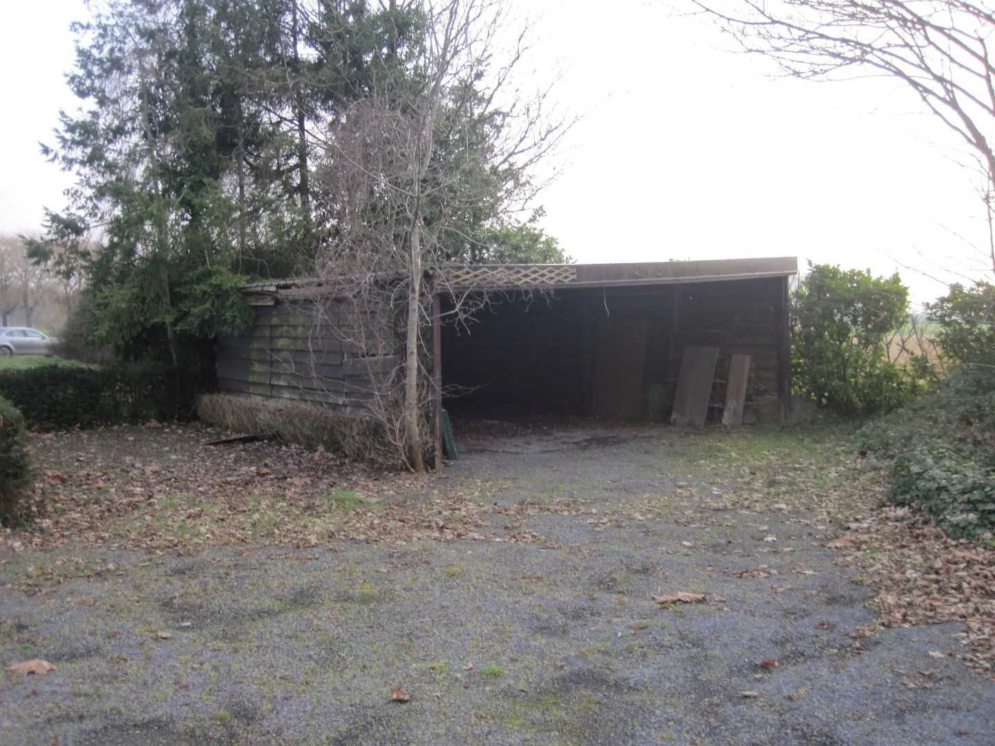 De oprijlaan brengt u naar het ietwat naar achteren gesitueerde landhuis, met vooraan de woning een afzonderlijke car-port, en achteraan een bos van ca. 5000 m².