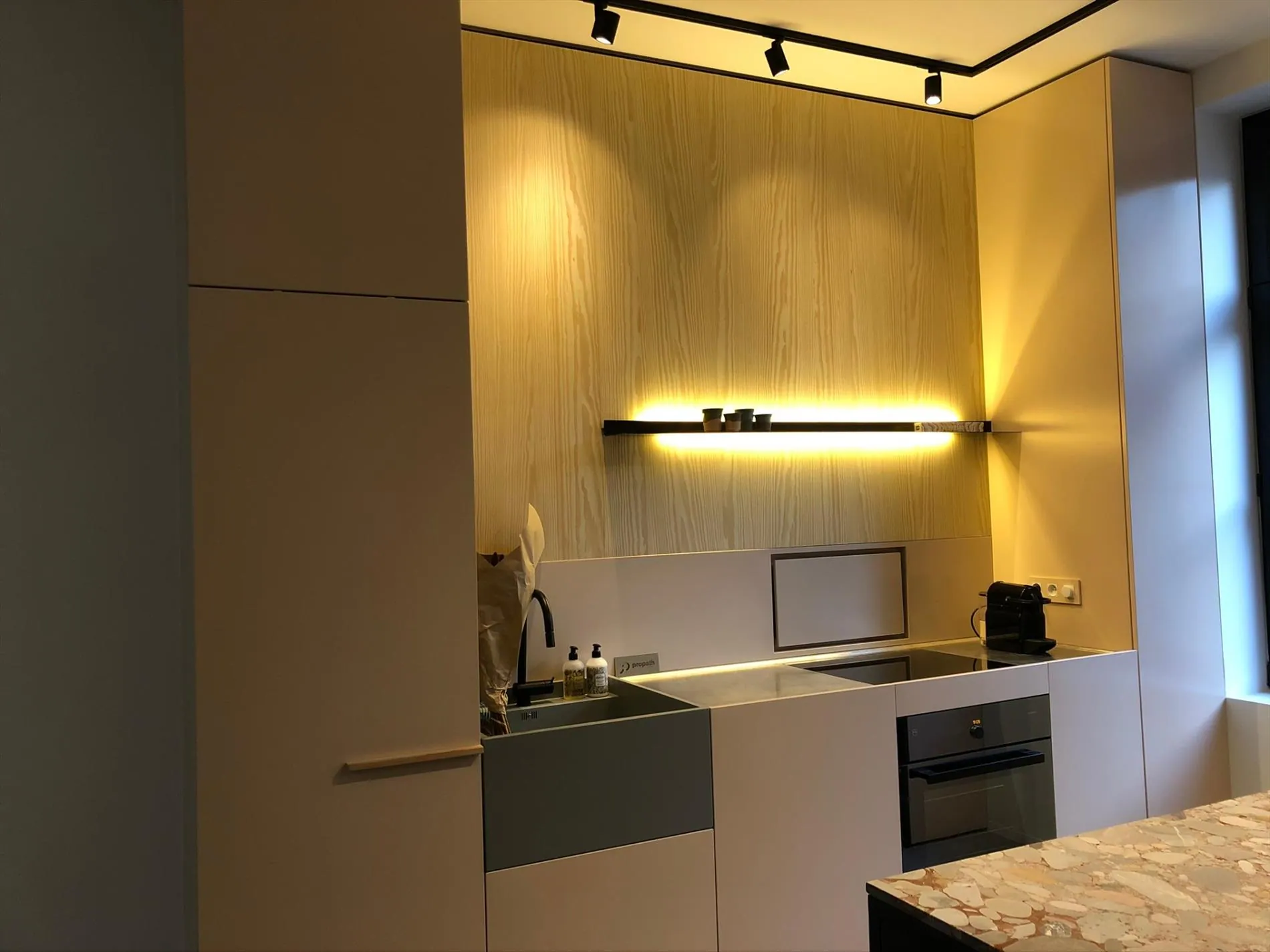 - een strakke designkeuken, geïntegreerd met een eigentijdse woonkamer (eveneens toegang tot het aanpalende koertje);