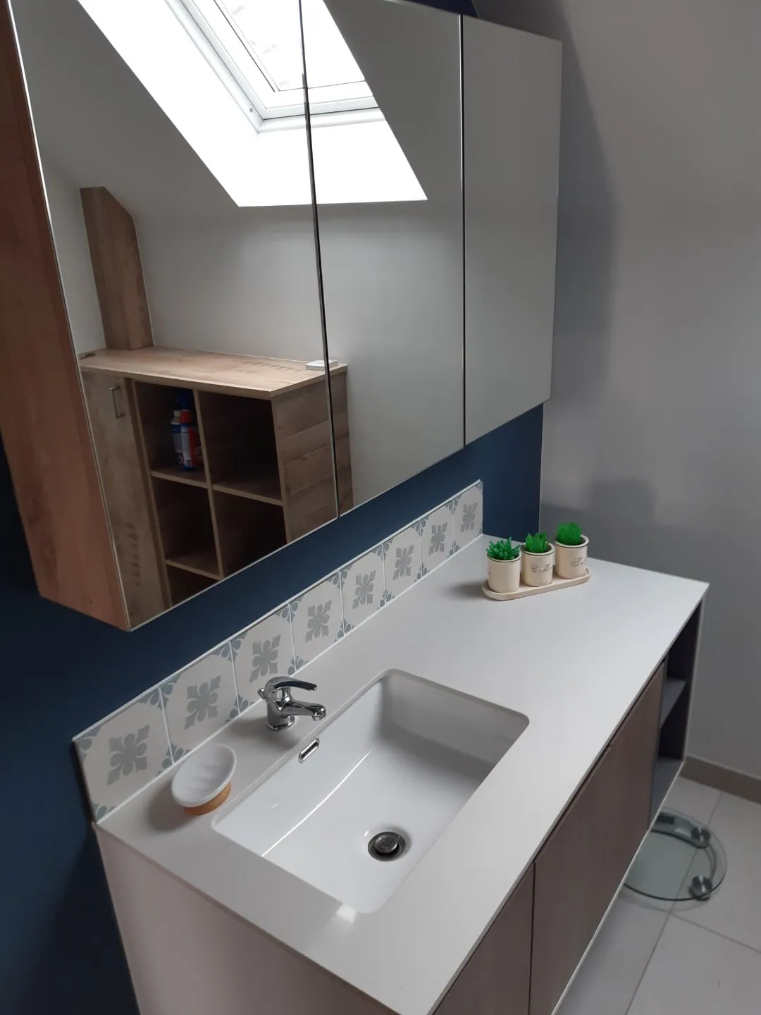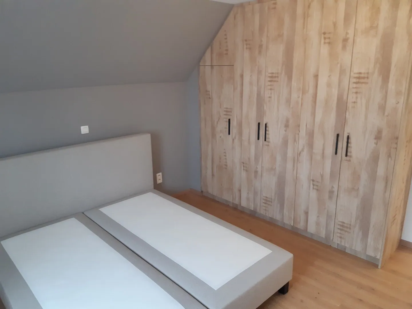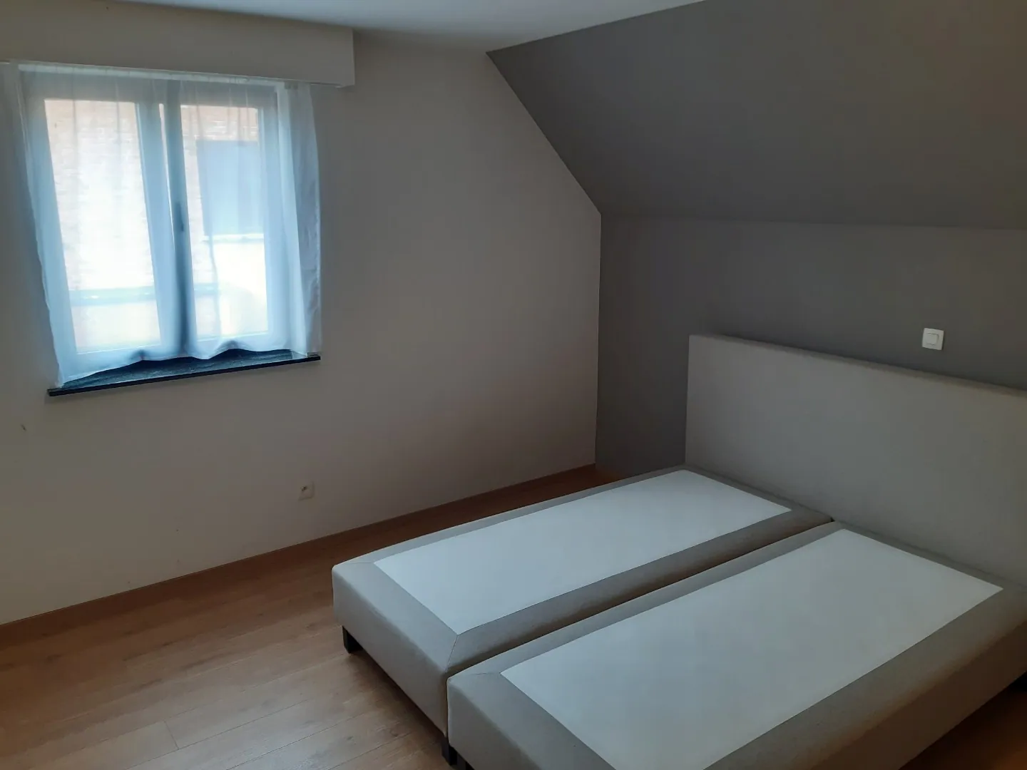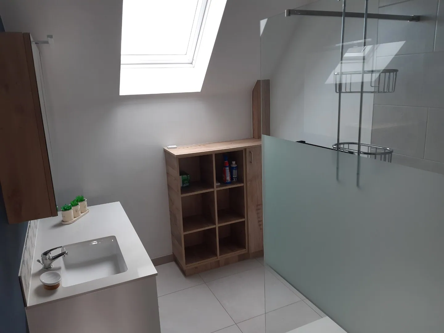 De verdieping beschikt over 3 slaapkamers (met automatische rolluiken), een badkamer (meubel, inloopdouche) en een afzonderlijk toilet.