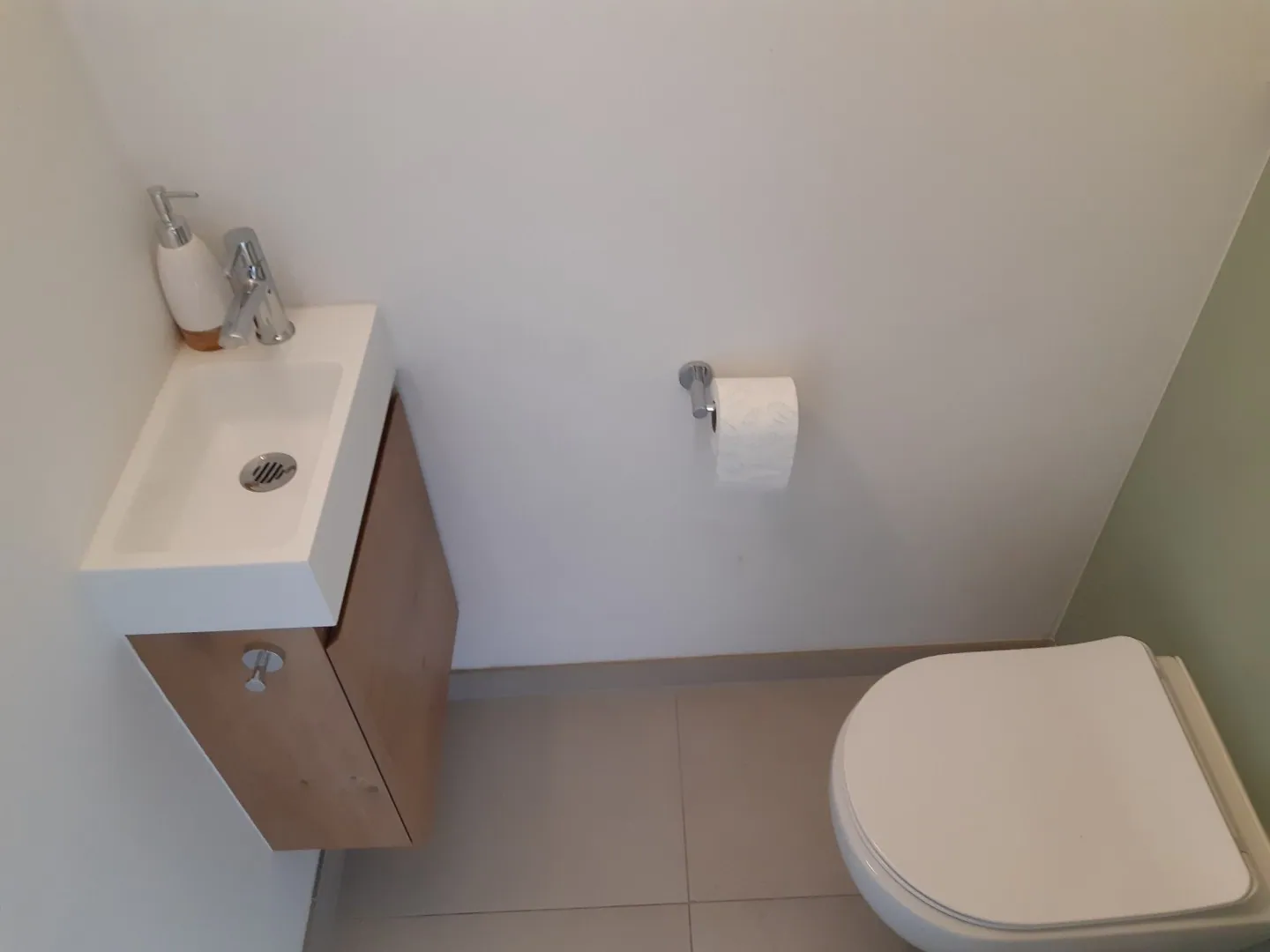 Er is eveneens een praktische wasruimte (met achterdeur) aanwezig. De inkom biedt plaats aan een stijlvol gastentoilet.
