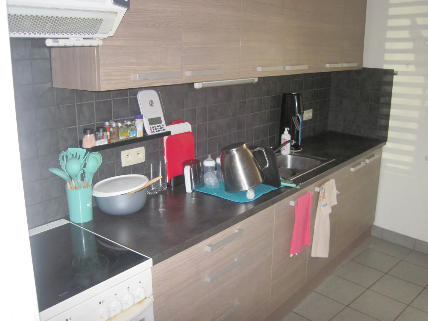 De aangename leefruimte (met afzonderlijke zithoek en eetplaats) sluit aan op de keuken (met veranda/berging).