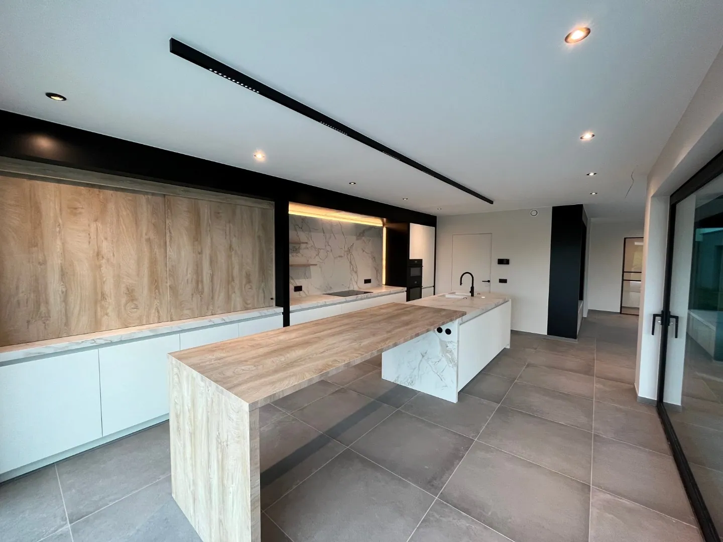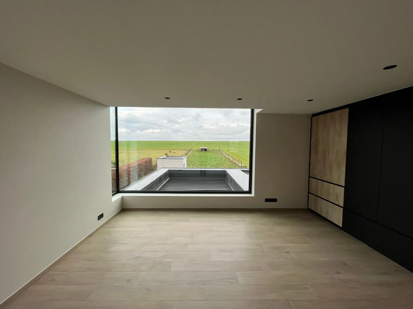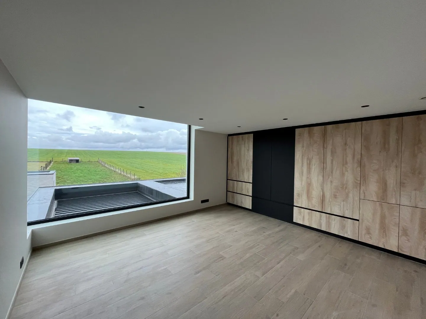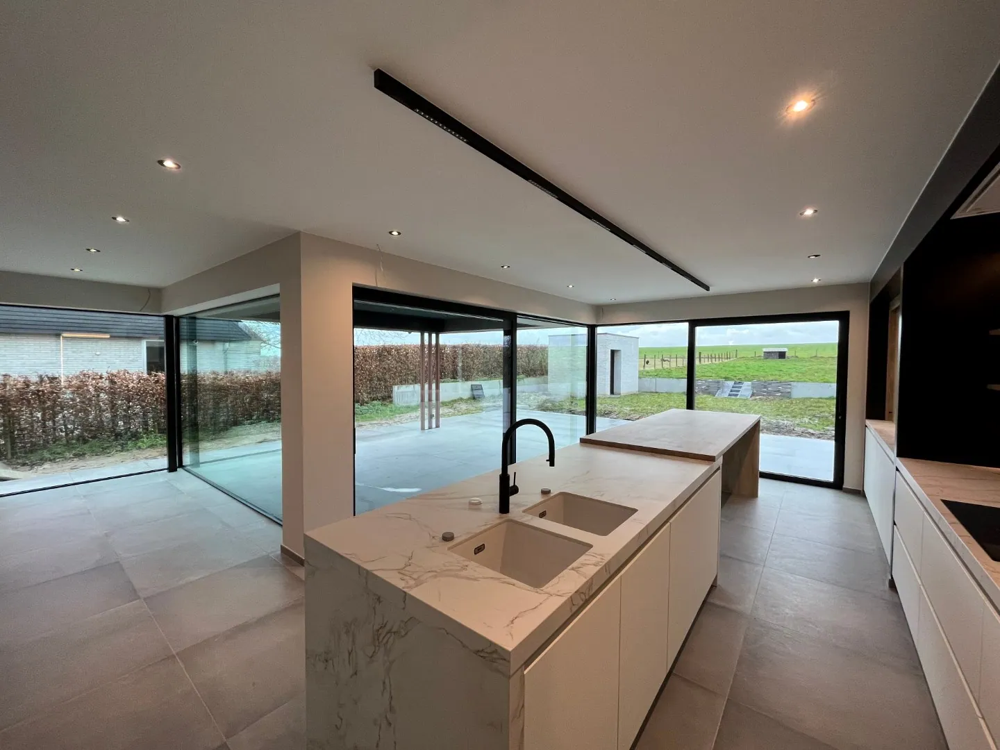 Bij het binnenwandelen komen we in de stijlvolle inkomhal met gastentoilet en vestiairekast terecht. Aansluitend bevindt zich de leefruimte met enorme glaspartijen die uitzicht geven op de groene omgeving. De open keuken werd afgewerkt met hoogwaardige materialen. Naast de keuken vinden we de bijkeuken met koelcel (!) en voorzieningen voor de wasmachine / droogkast terug. Tot slot is het gelijkvloers nog voorzien van een ruimte die zowel als slaapkamer of als bureel kan ingevuld worden; aanpalend is een inloopdouche voorzien.