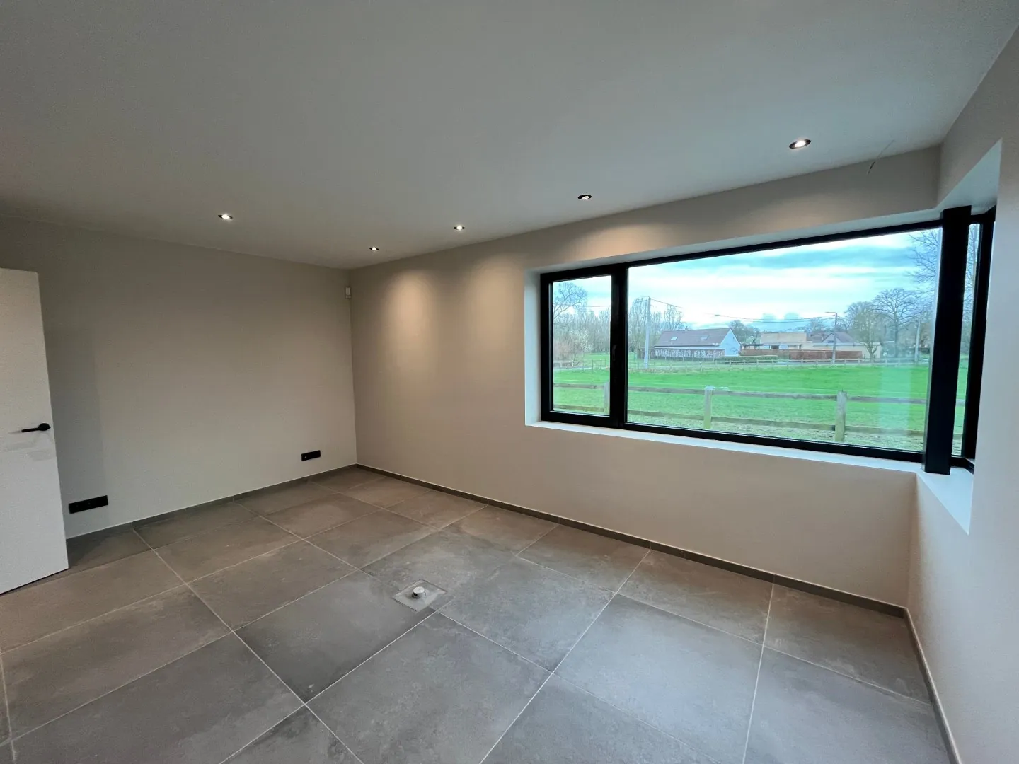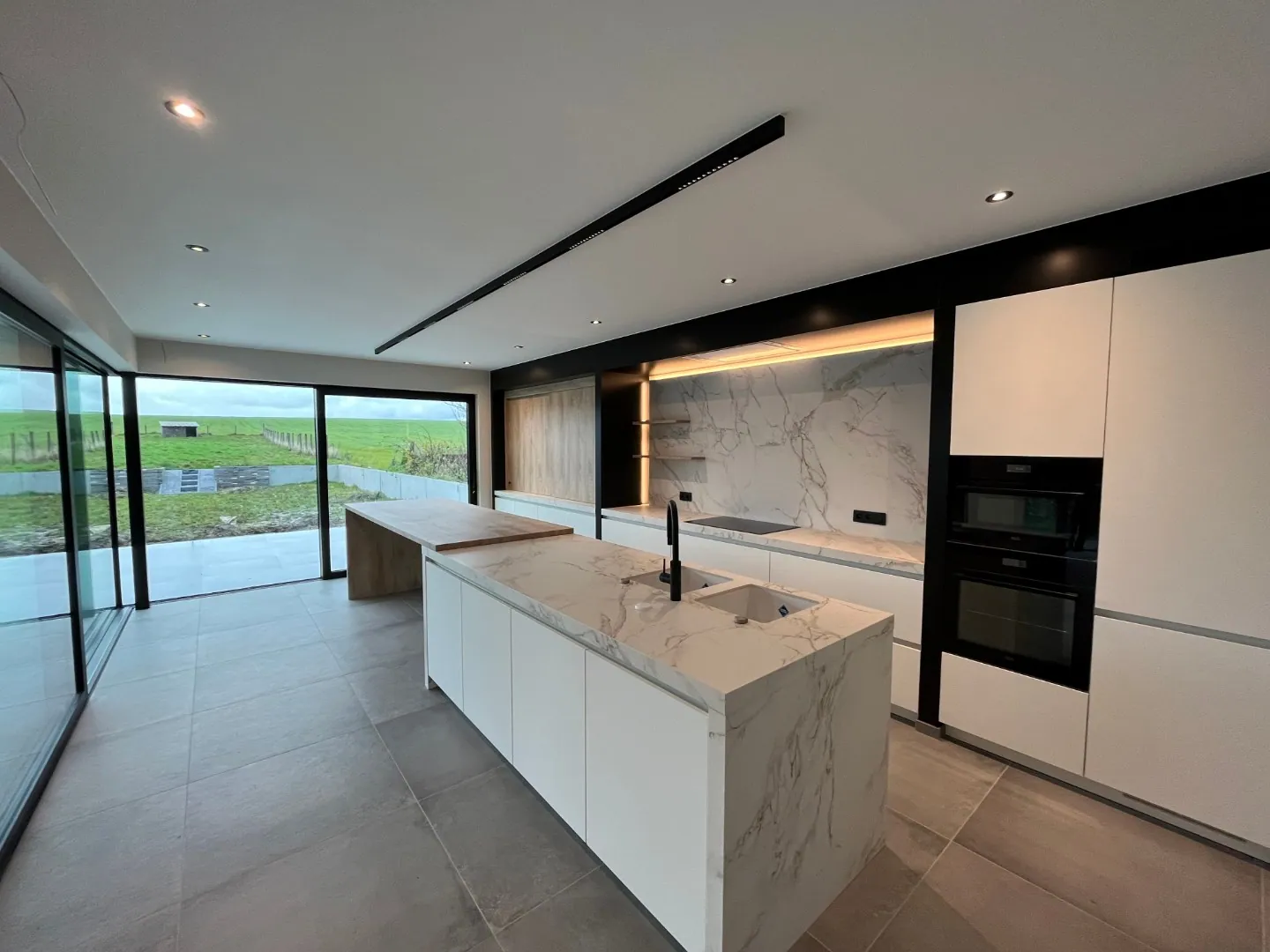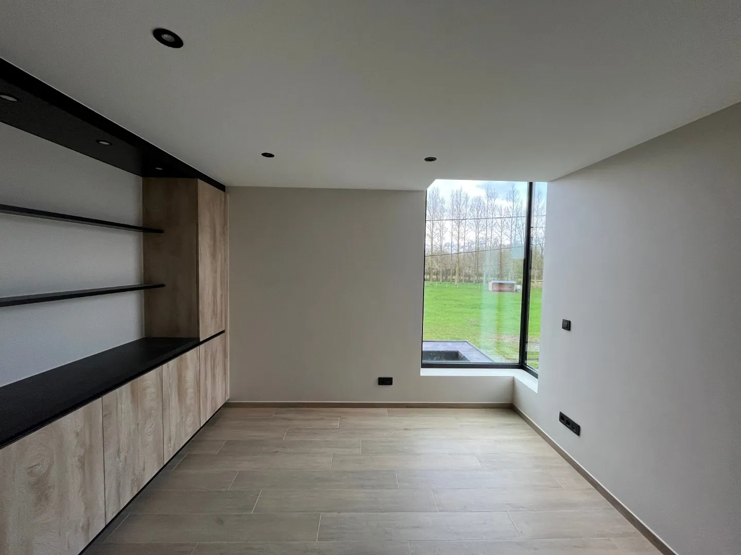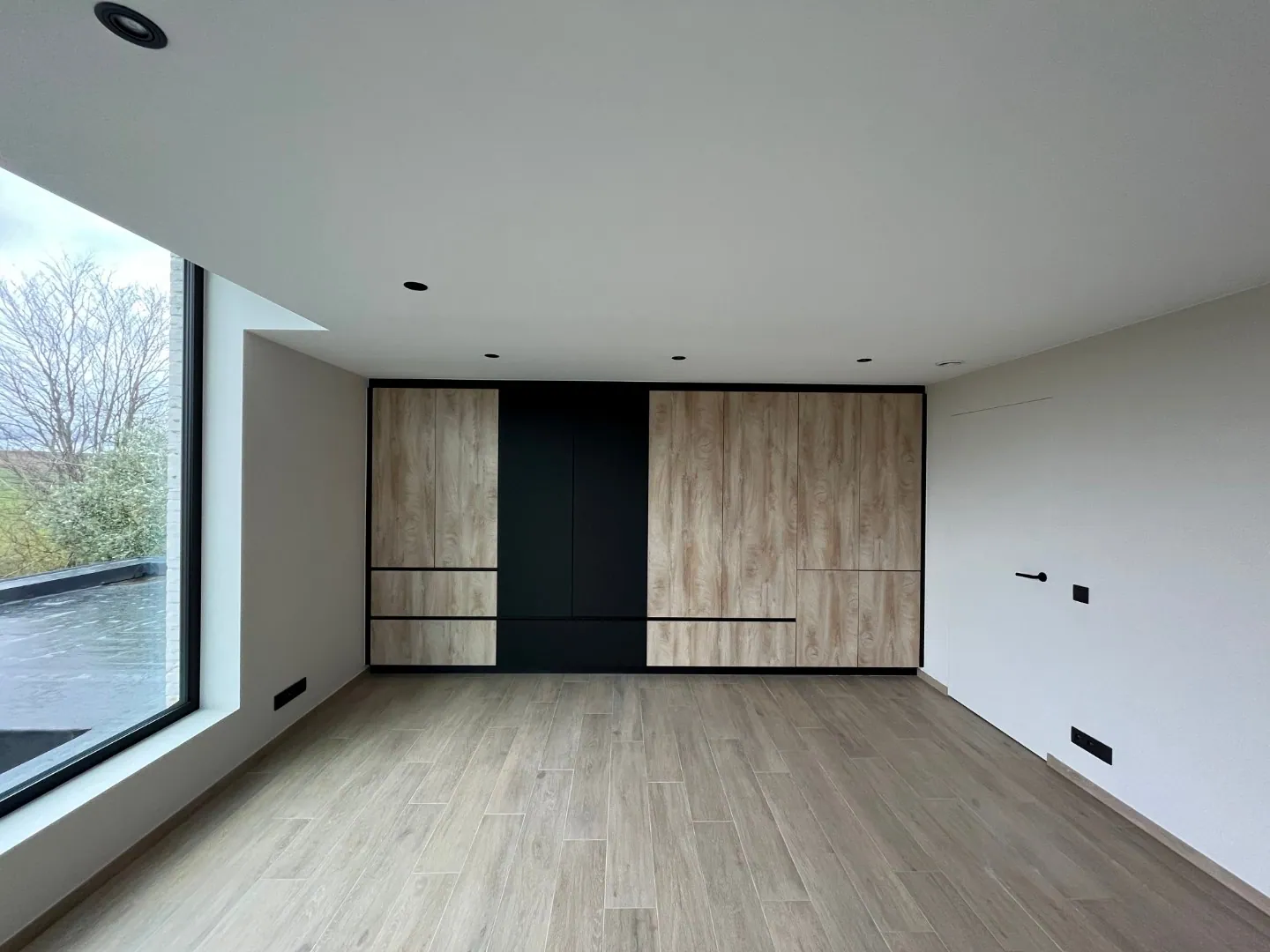 Bij het binnenwandelen komen we in de stijlvolle inkomhal met gastentoilet en vestiairekast terecht. Aansluitend bevindt zich de leefruimte met enorme glaspartijen die uitzicht geven op de groene omgeving. De open keuken werd afgewerkt met hoogwaardige materialen. Naast de keuken vinden we de bijkeuken met koelcel (!) en voorzieningen voor de wasmachine / droogkast terug. Tot slot is het gelijkvloers nog voorzien van een ruimte die zowel als slaapkamer of als bureel kan ingevuld worden; aanpalend is een inloopdouche voorzien.