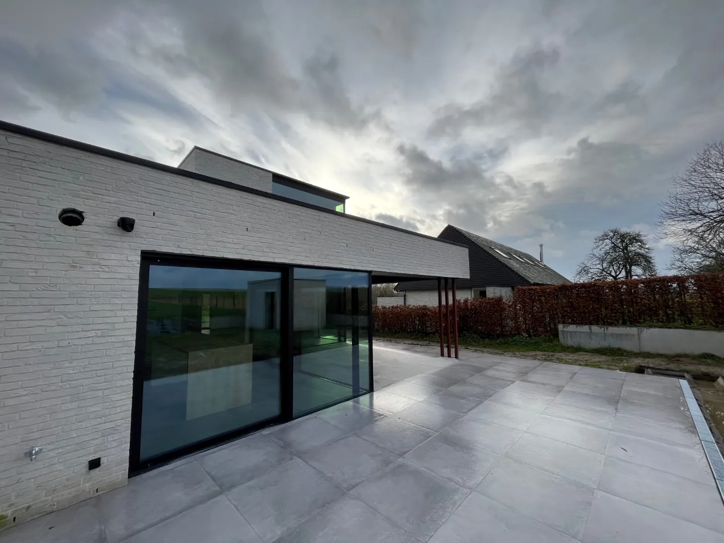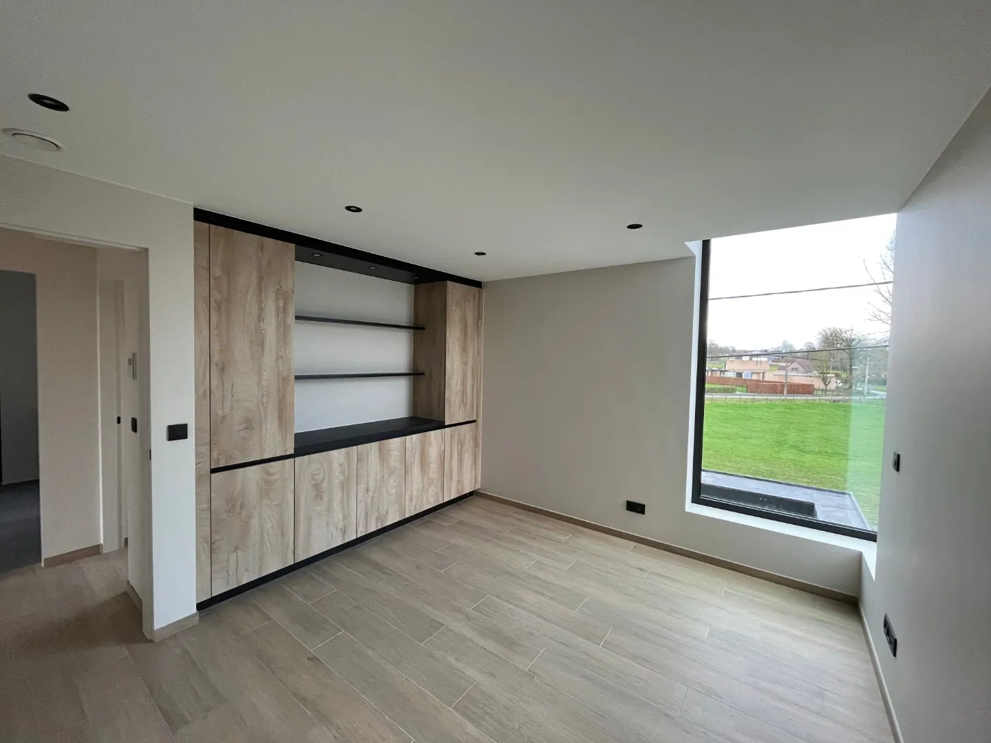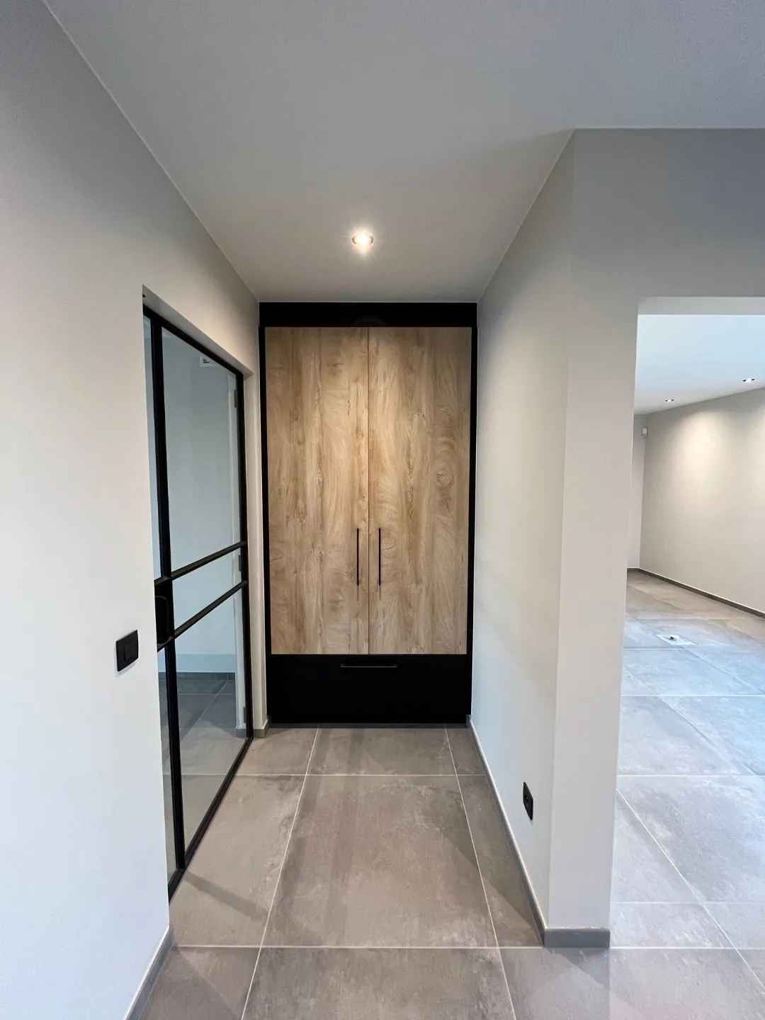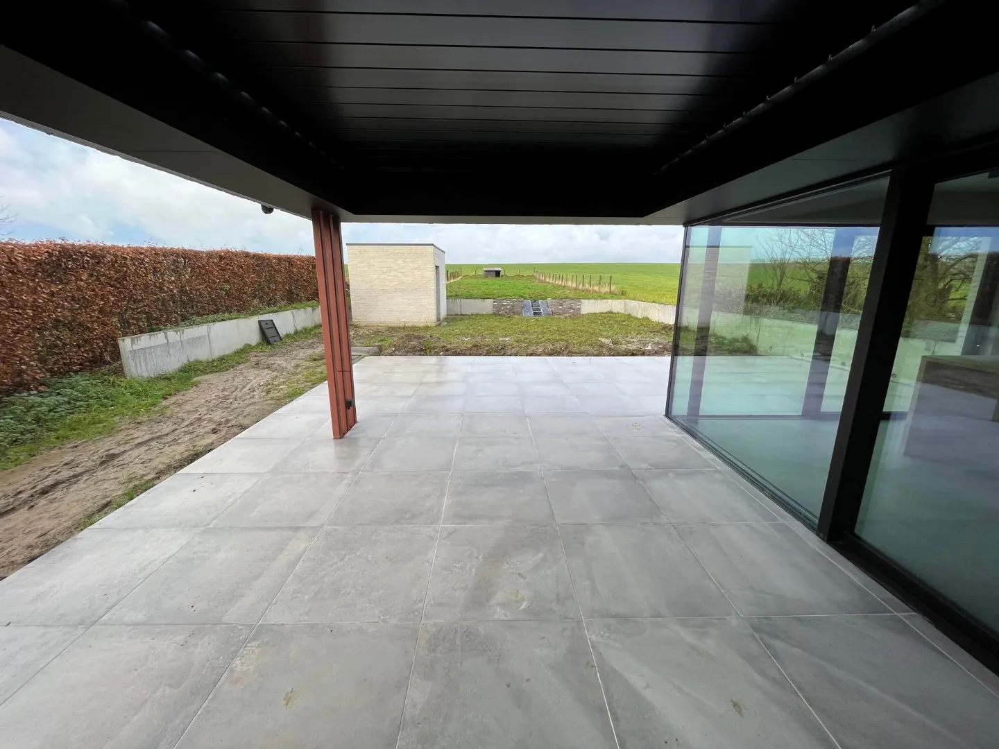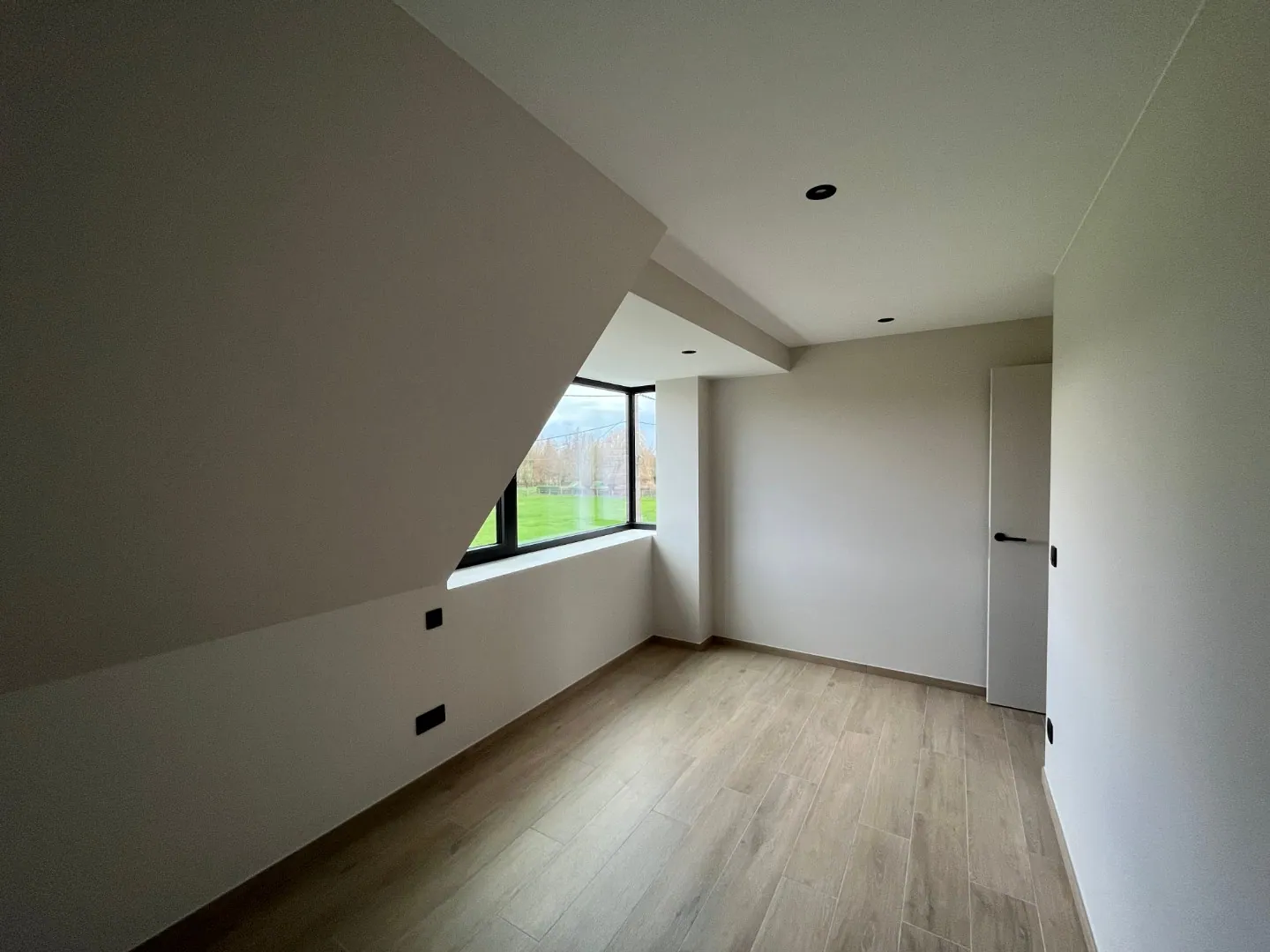 Bij het binnenwandelen komen we in de stijlvolle inkomhal met gastentoilet en vestiairekast terecht. Aansluitend bevindt zich de leefruimte met enorme glaspartijen die uitzicht geven op de groene omgeving. De open keuken werd afgewerkt met hoogwaardige materialen. Naast de keuken vinden we de bijkeuken met koelcel (!) en voorzieningen voor de wasmachine / droogkast terug. Tot slot is het gelijkvloers nog voorzien van een ruimte die zowel als slaapkamer of als bureel kan ingevuld worden; aanpalend is een inloopdouche voorzien.