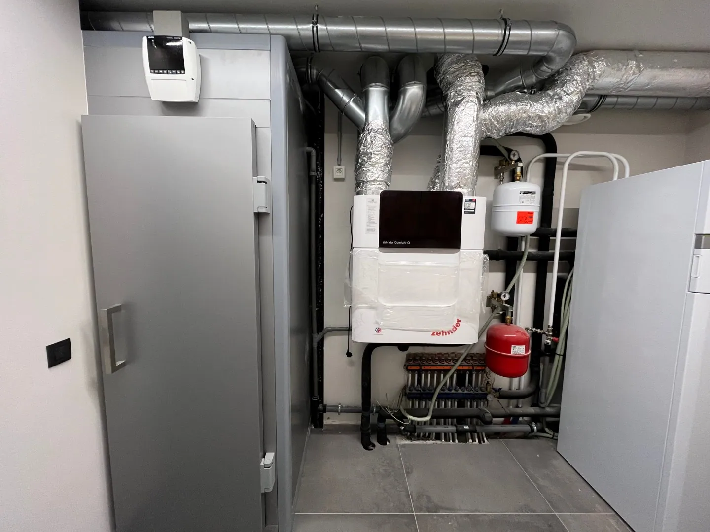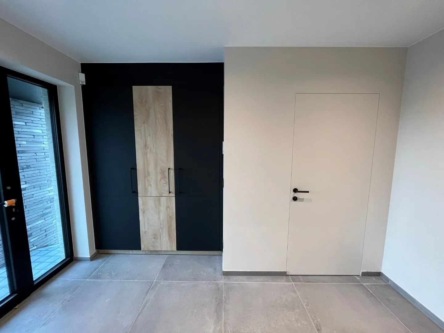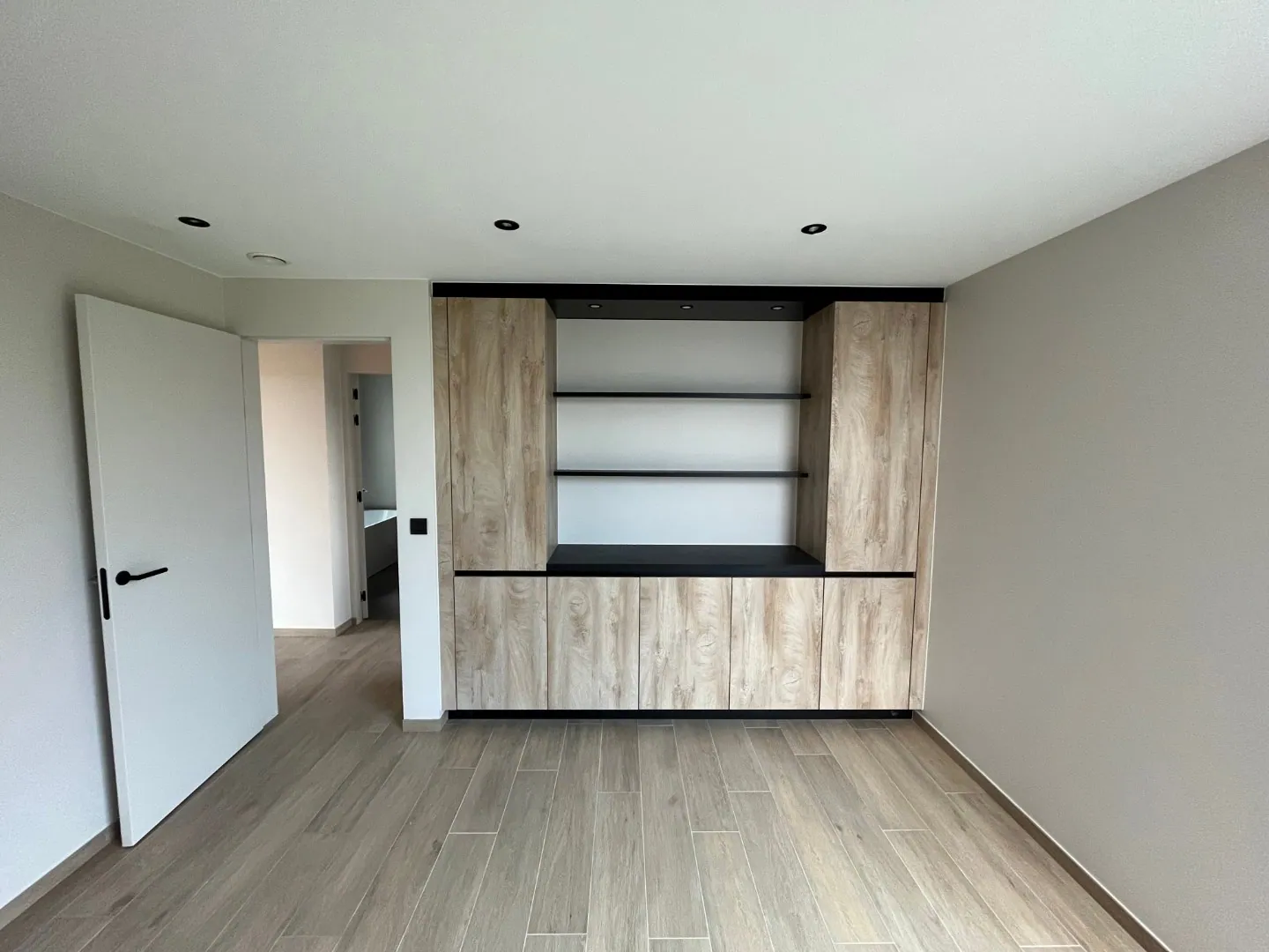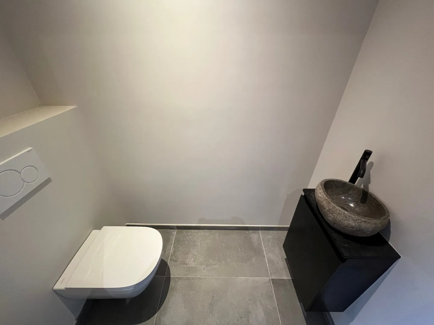 Bij het binnenwandelen komen we in de stijlvolle inkomhal met gastentoilet en vestiairekast terecht. Aansluitend bevindt zich de leefruimte met enorme glaspartijen die uitzicht geven op de groene omgeving. De open keuken werd afgewerkt met hoogwaardige materialen. Naast de keuken vinden we de bijkeuken met koelcel (!) en voorzieningen voor de wasmachine / droogkast terug. Tot slot is het gelijkvloers nog voorzien van een ruimte die zowel als slaapkamer of als bureel kan ingevuld worden; aanpalend is een inloopdouche voorzien.