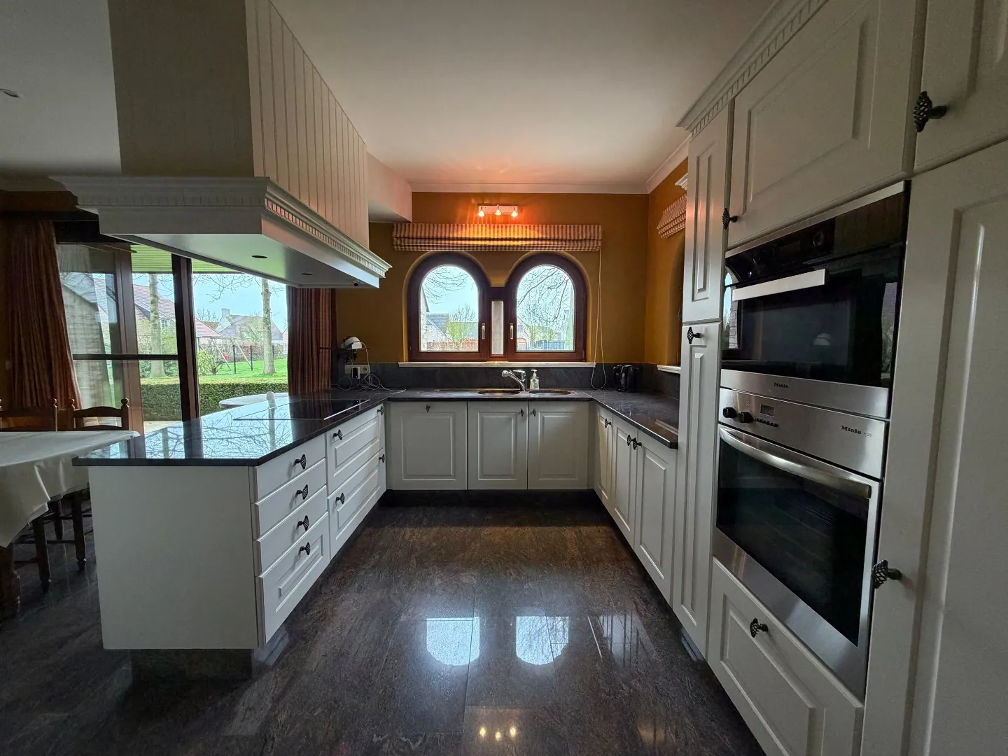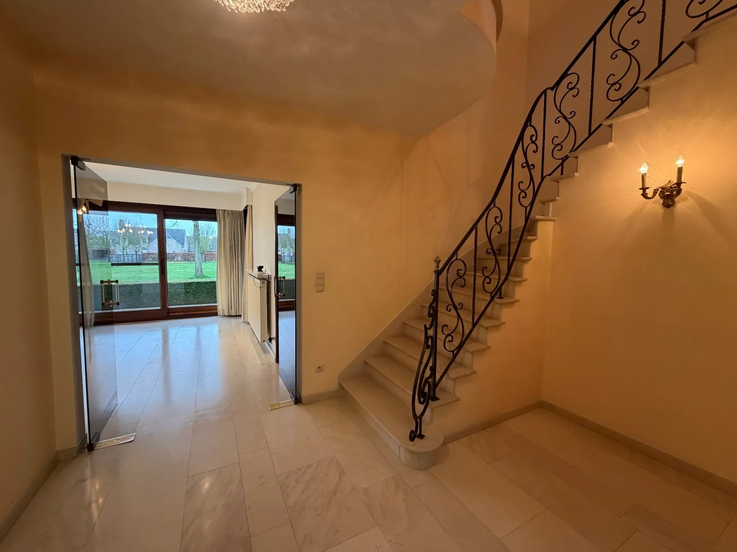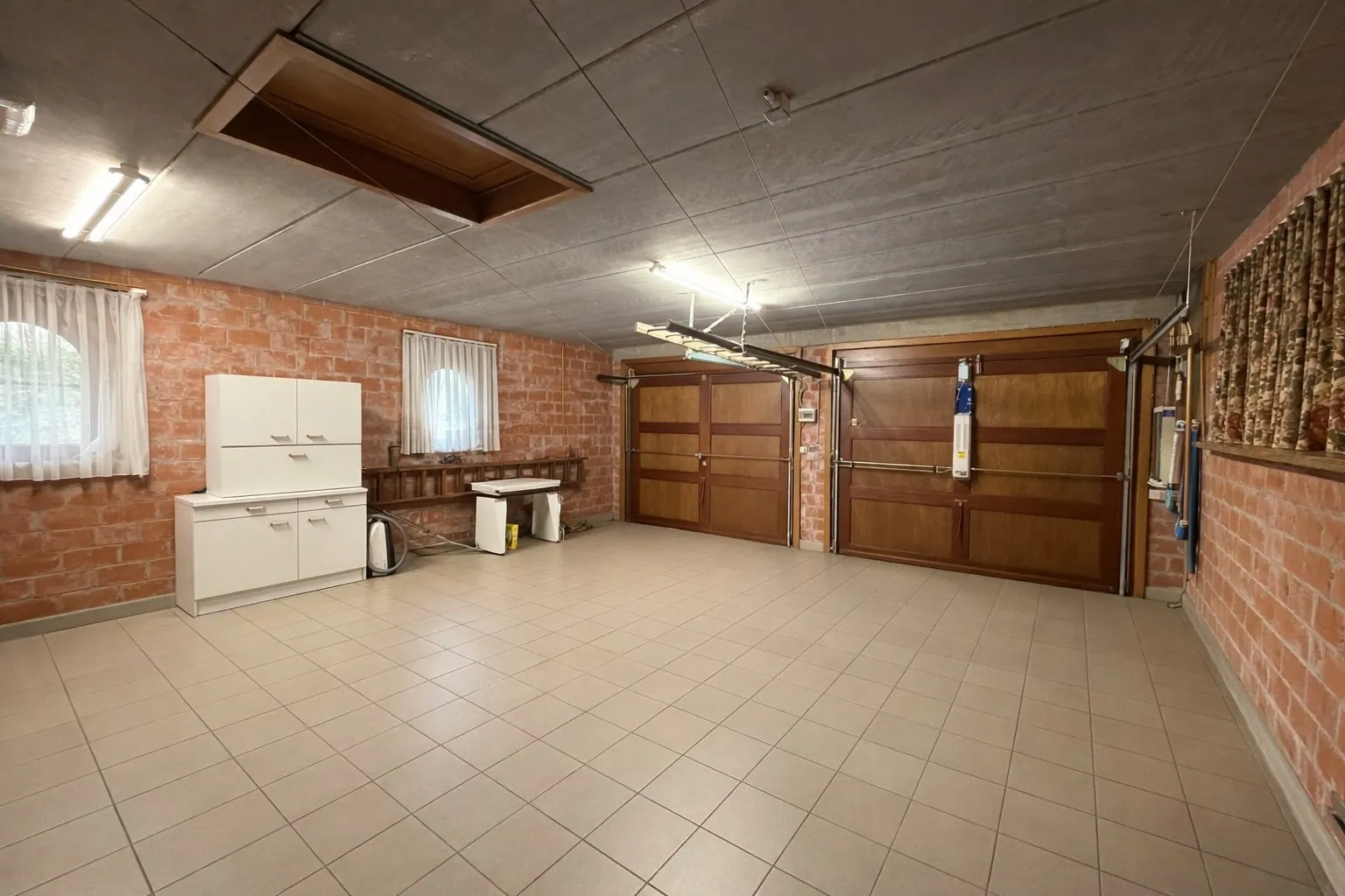 Het gelijkvloers beschikt over een statige inkomhal voorzien van een gastentoilet, een ruime en lichtrijke leefruimte met eet- en zithoek, een aparte bureauruimte, een afzonderlijke keuken en een praktische wasplaats met toegang tot de kelder en de inpandige garage, uitgerust met twee garagepoorten.