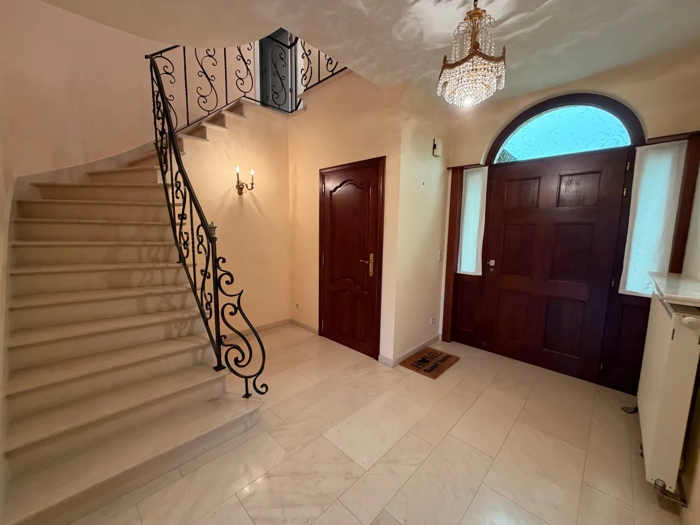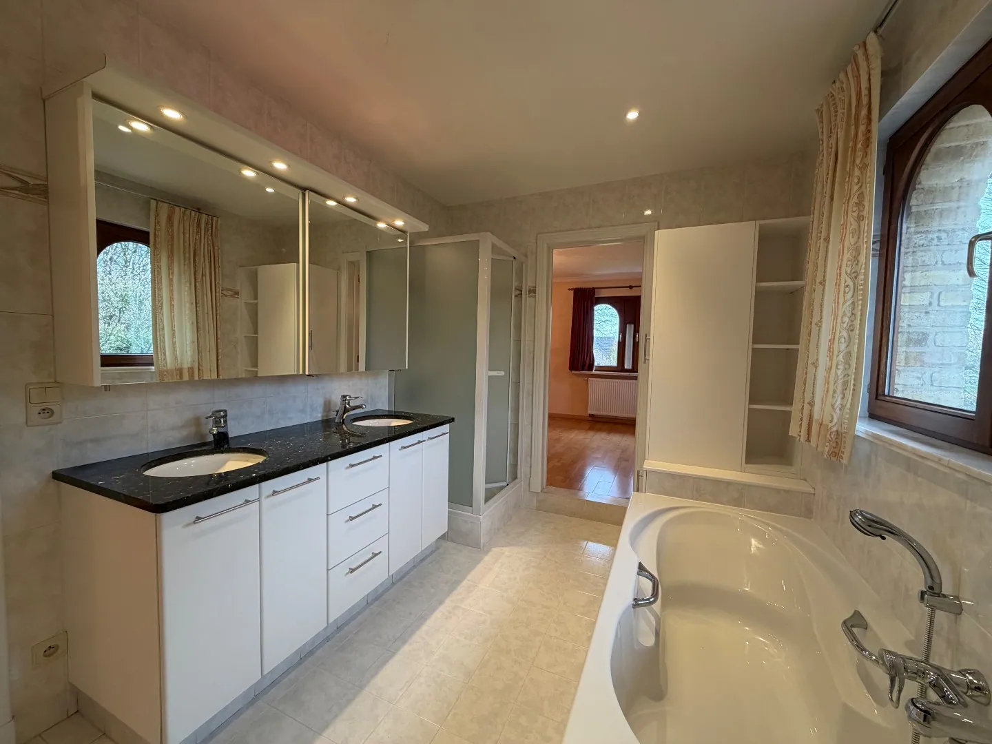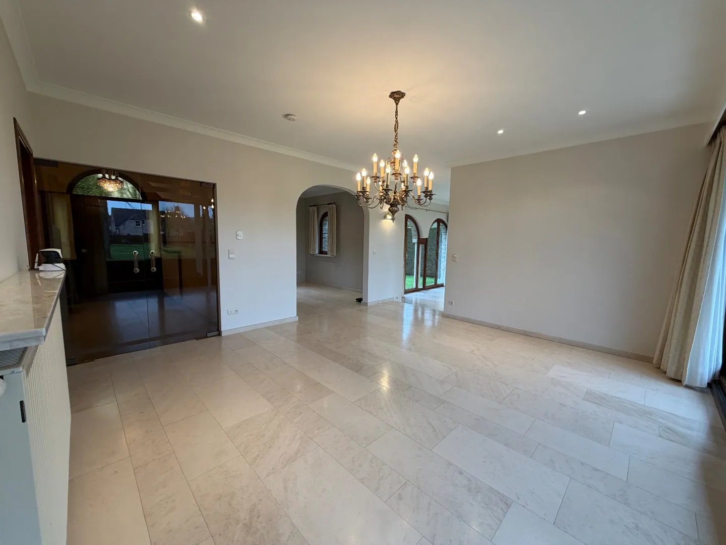 Het gelijkvloers beschikt over een statige inkomhal voorzien van een gastentoilet, een ruime en lichtrijke leefruimte met eet- en zithoek, een aparte bureauruimte, een afzonderlijke keuken en een praktische wasplaats met toegang tot de kelder en de inpandige garage, uitgerust met twee garagepoorten.