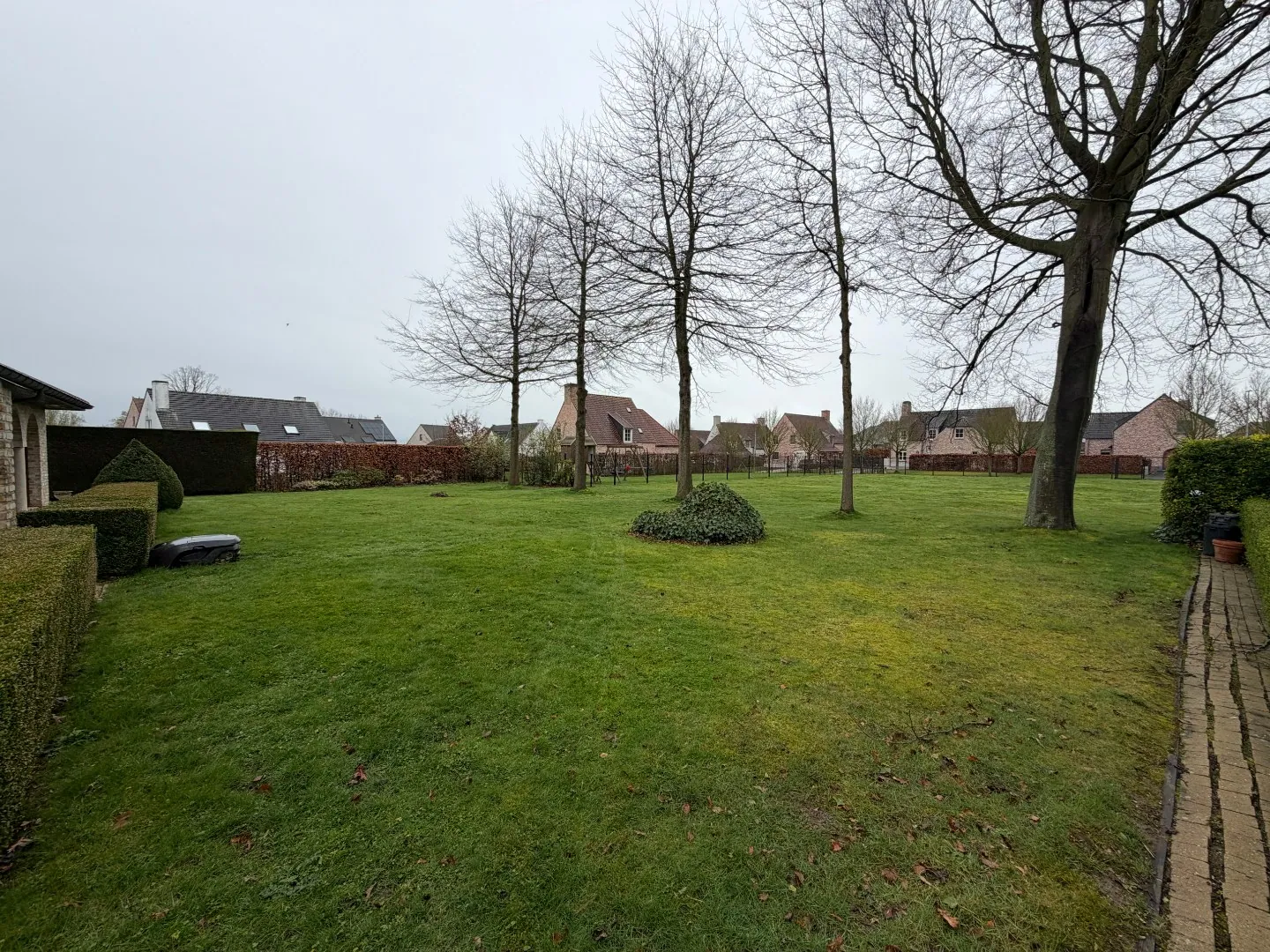 Buiten geniet je van een bijzonder grote en uitstekend onderhouden tuin. Een robotmaaier is aanwezig voor het gazononderhoud. Het onderhoud van de beplanting en hagen kan periodiek worden uitgevoerd, op kosten van de huurder(s).