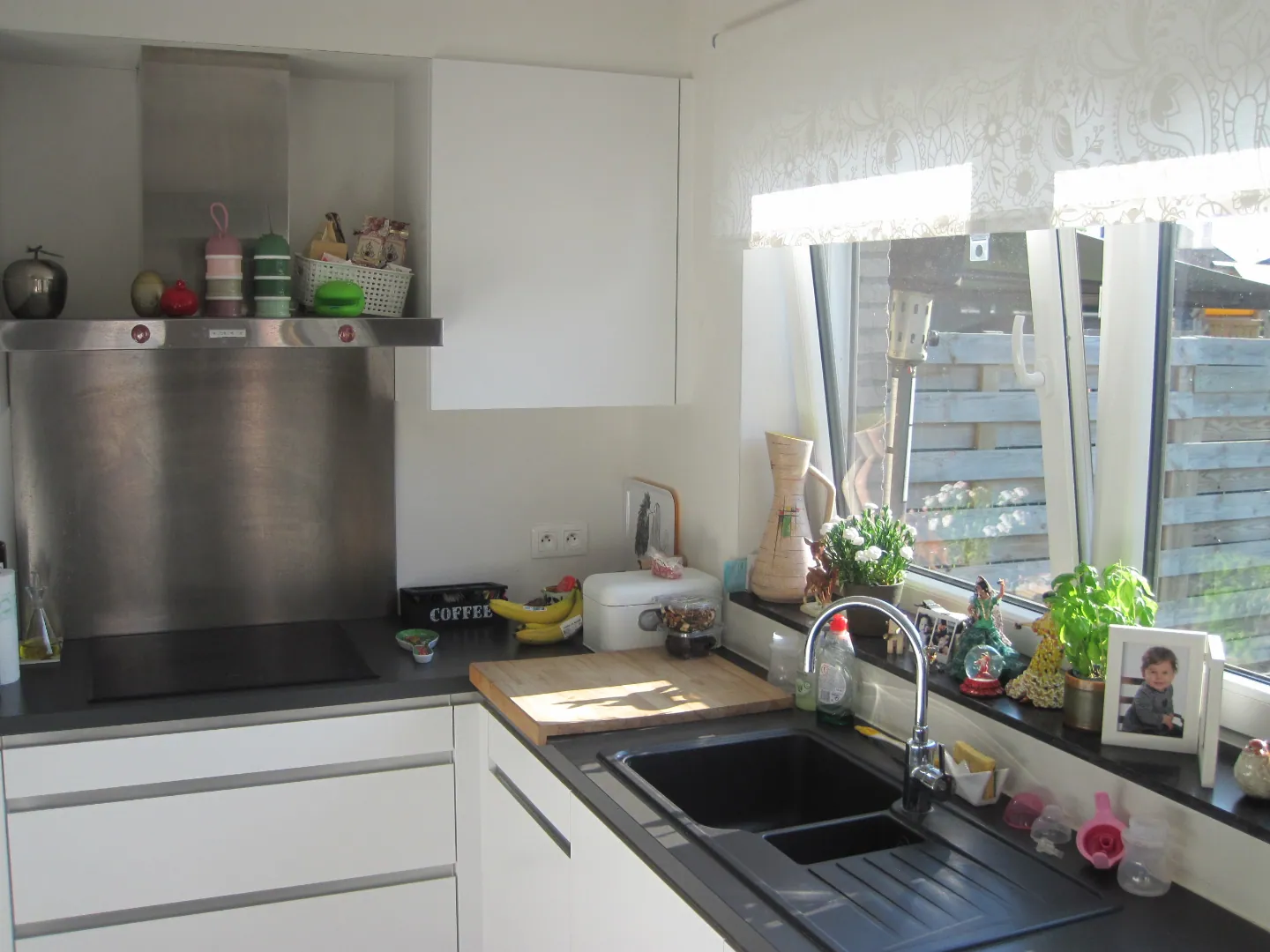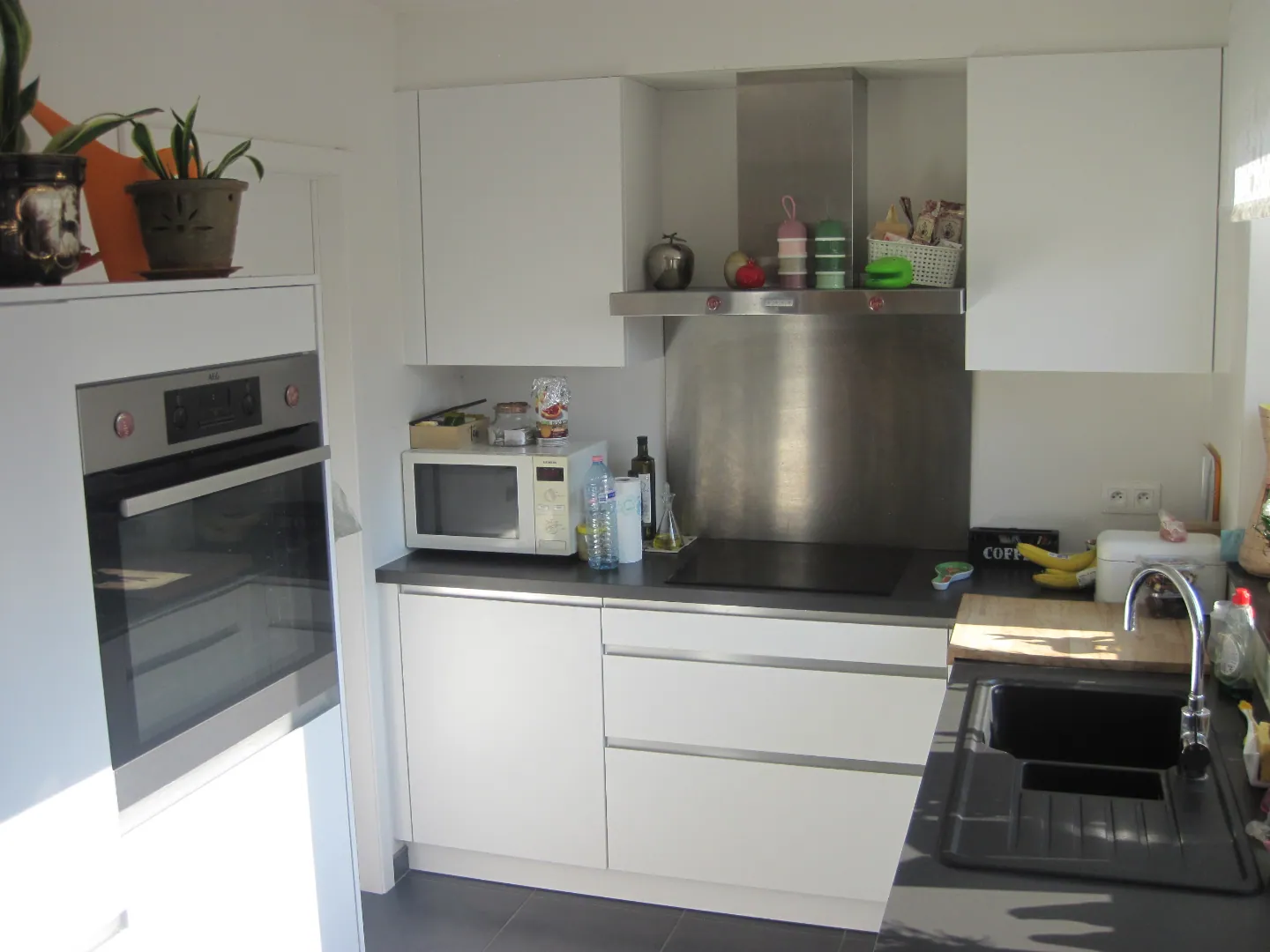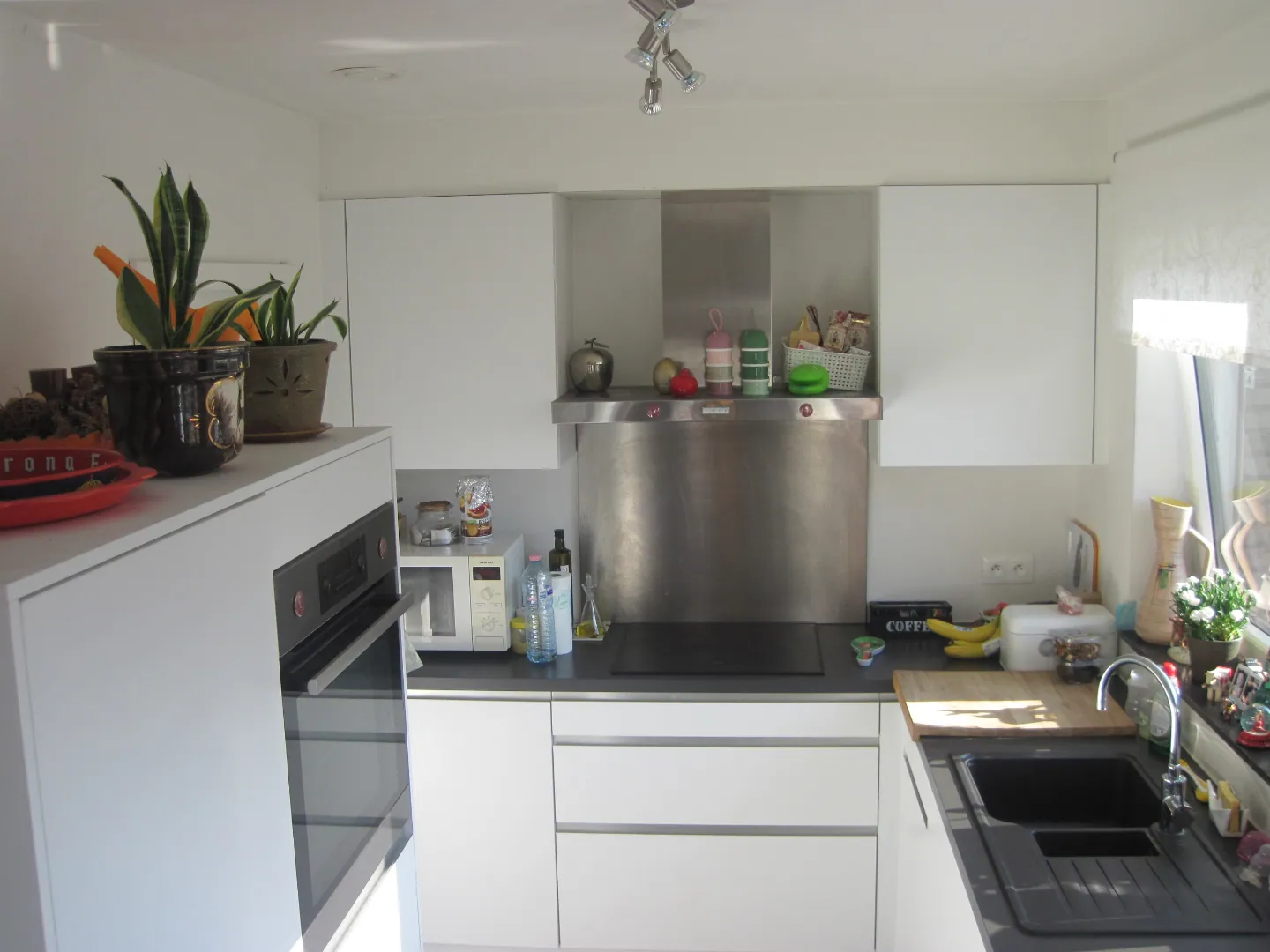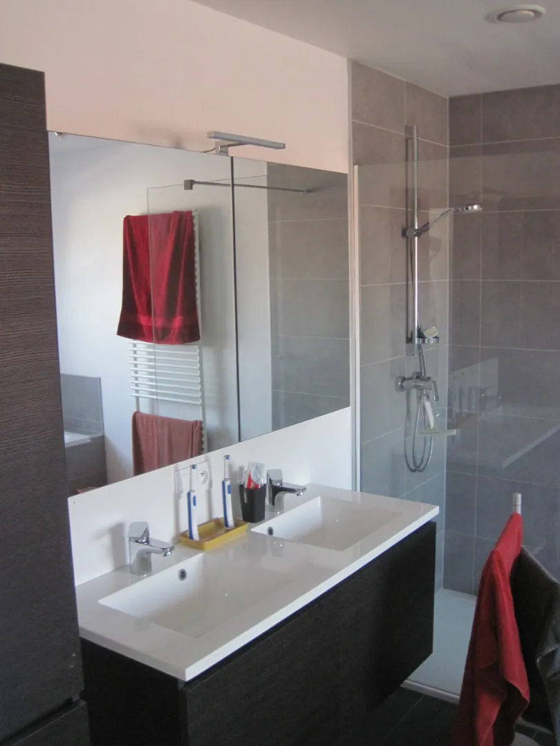 - eigentijdse, open keuken (met vaatwasser !) met ruime leefruimte, aansluitend op terras en tuin;