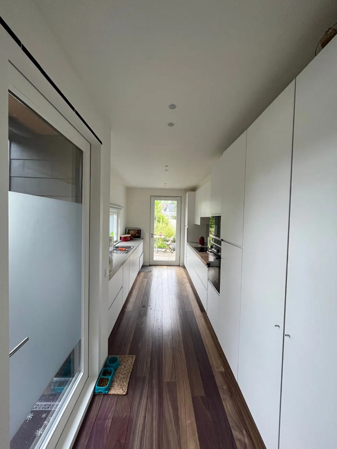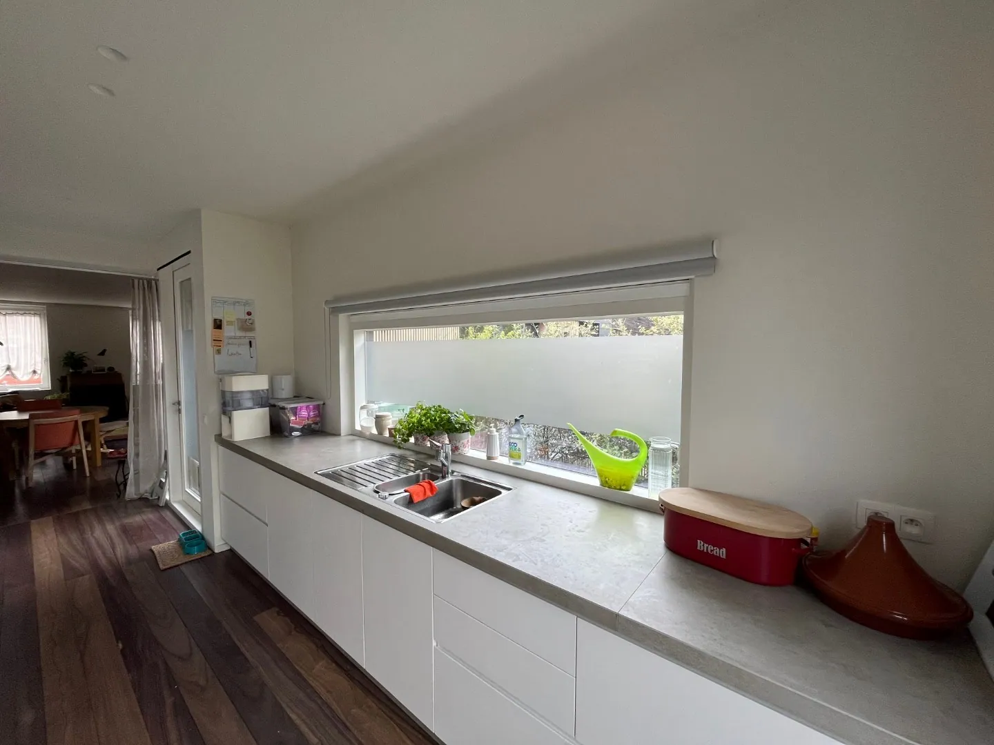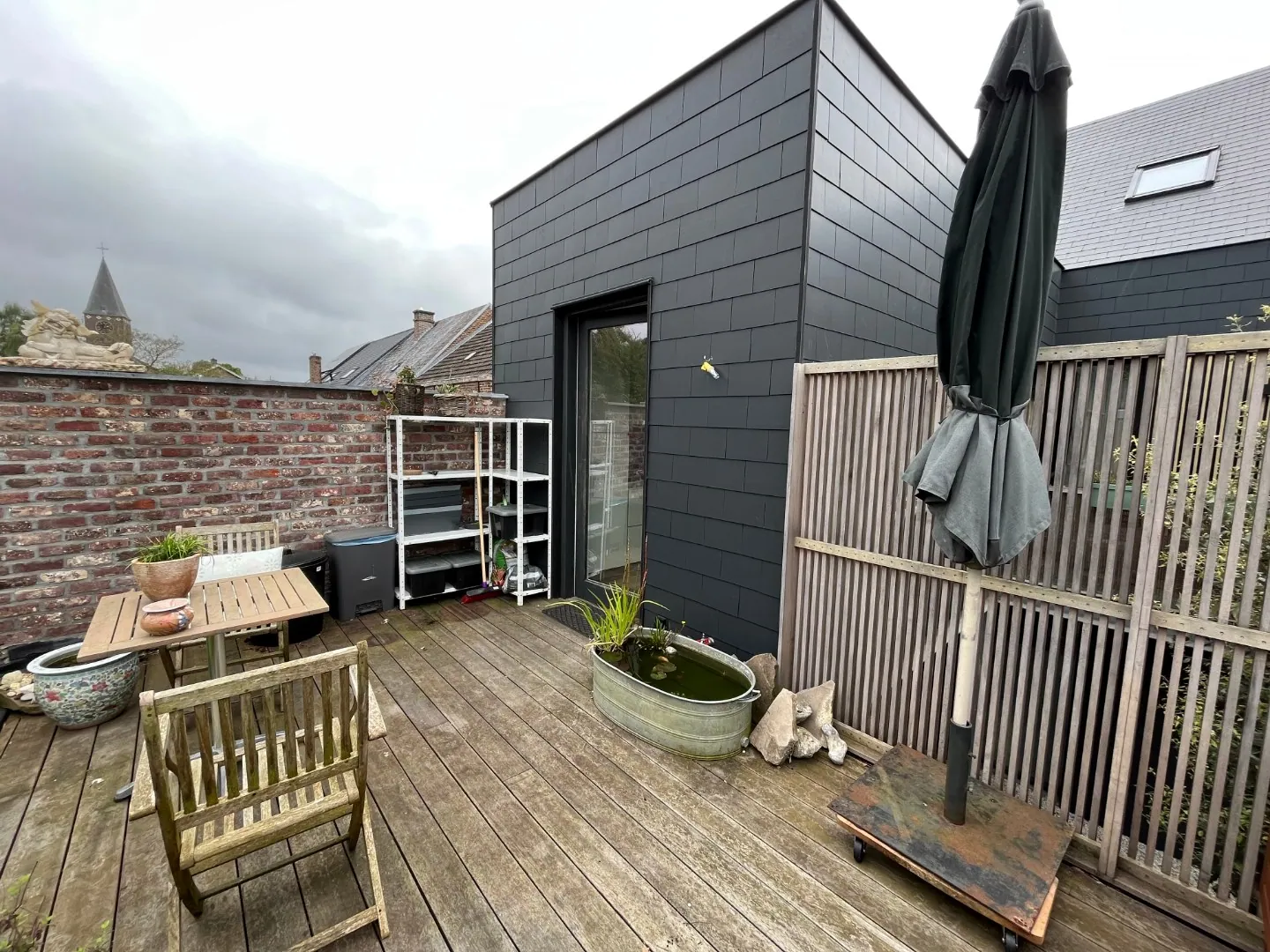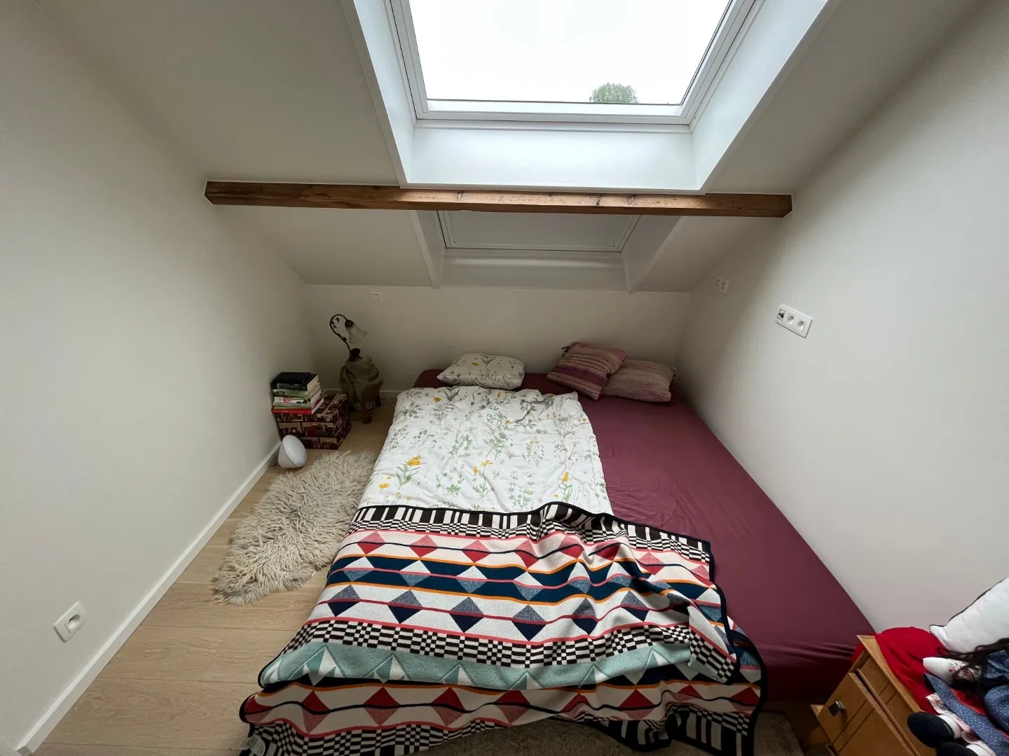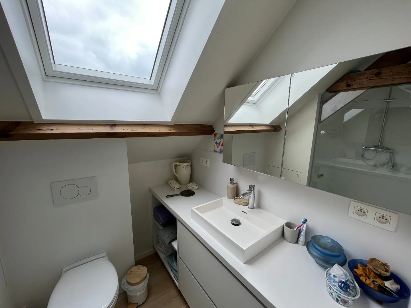 Het gelijkvloers omvat een multifunctionele ruimte, met een afzonderlijk toilet en bergruimte onder de trap. Een praktisch bureel lijkt een logische invulling, maar ook een derde slaapkamer valt binnen de mogelijkheden. Het leefgedeelte met een volledig geïnstalleerde strakke, witte keuken situeert zich op het eerste niveau. Eveneens op deze verdieping aanwezig, een aangenaam zonneterras. De bovenste verdieping beschikt over twee slaapkamers en een badkamer.