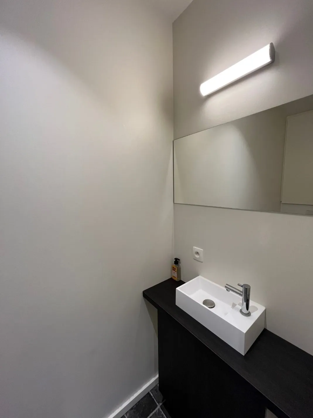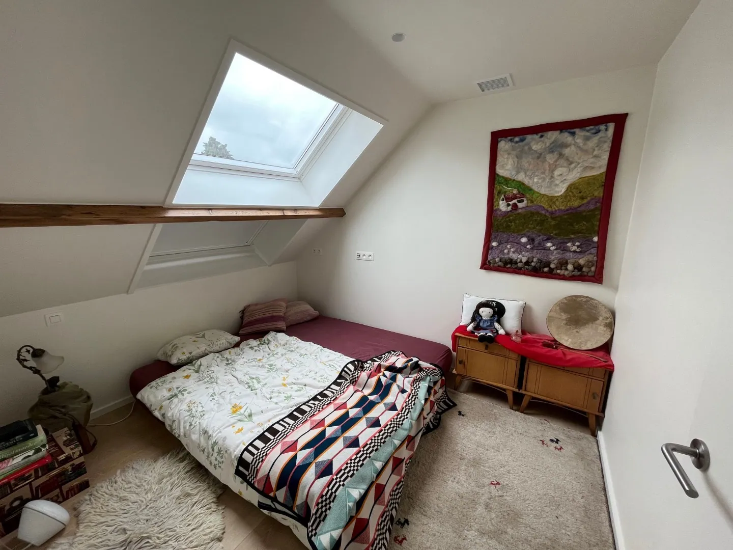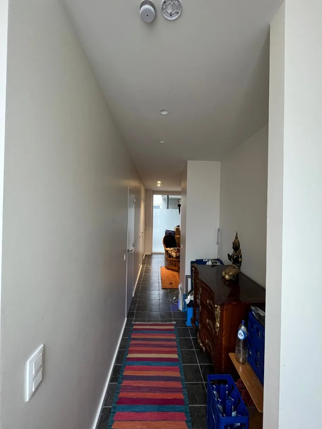 Het gelijkvloers omvat een multifunctionele ruimte, met een afzonderlijk toilet en bergruimte onder de trap. Een praktisch bureel lijkt een logische invulling, maar ook een derde slaapkamer valt binnen de mogelijkheden. Het leefgedeelte met een volledig geïnstalleerde strakke, witte keuken situeert zich op het eerste niveau. Eveneens op deze verdieping aanwezig, een aangenaam zonneterras. De bovenste verdieping beschikt over twee slaapkamers en een badkamer.