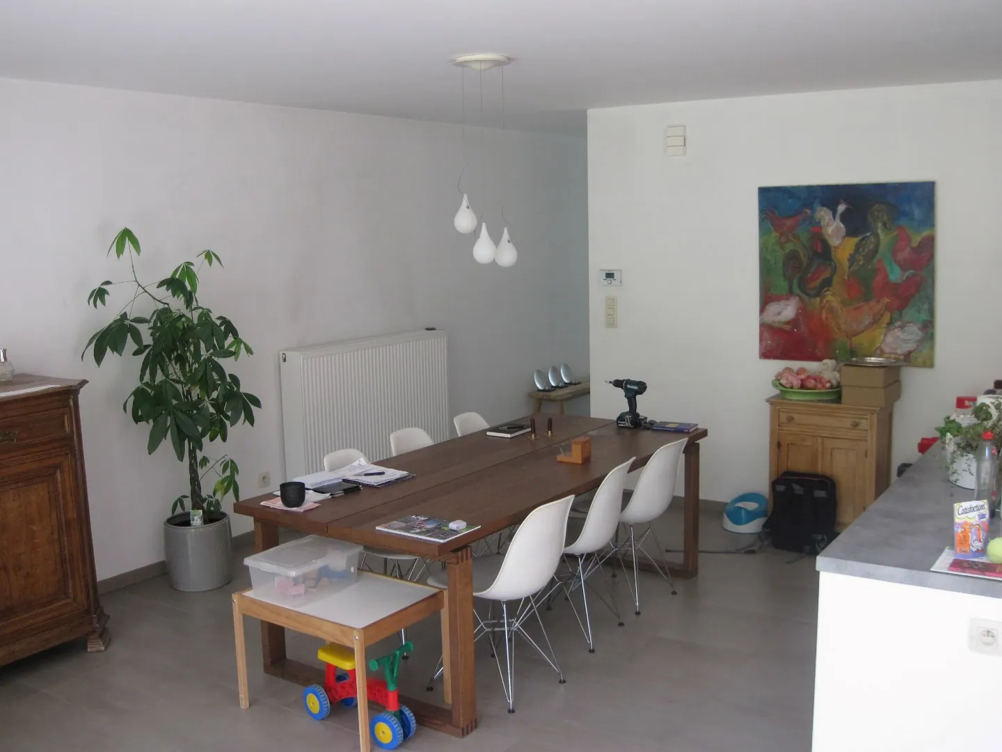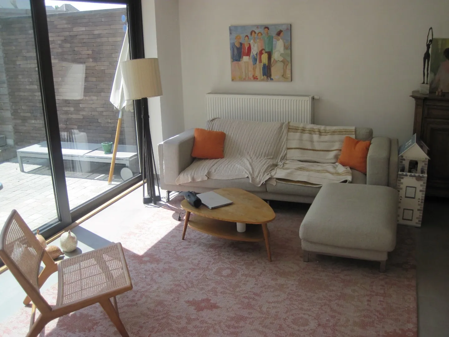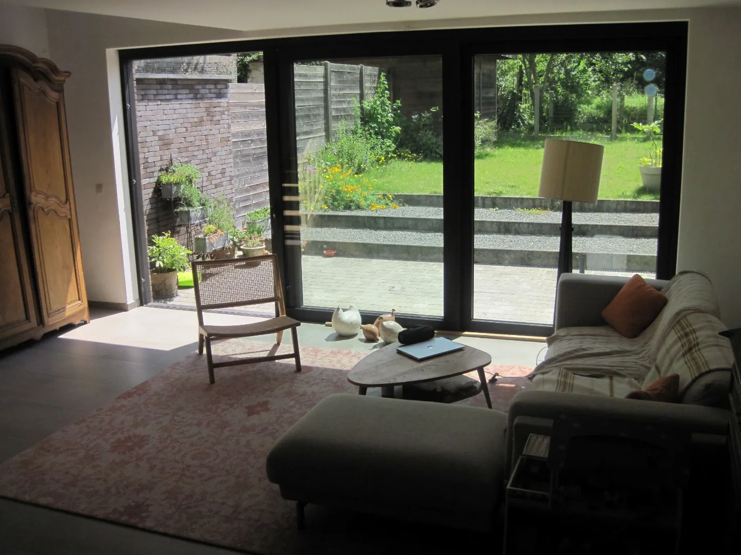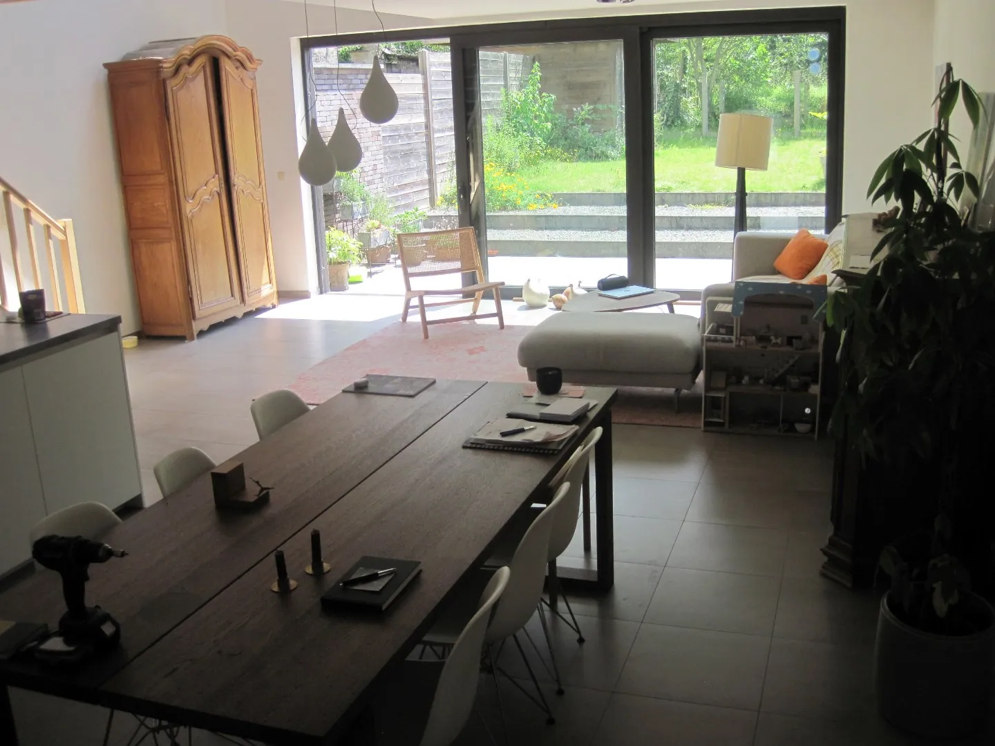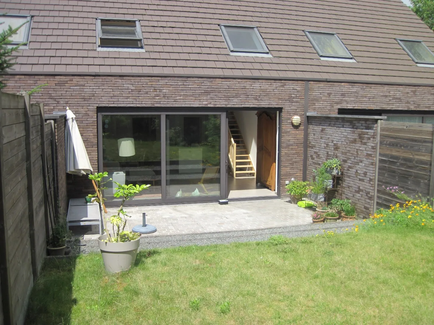 - op t gelijkvloers in een ruime leefruimte met open keuken, garage, wasplaats, toilet. Eveneens een ruim terras en tuin.