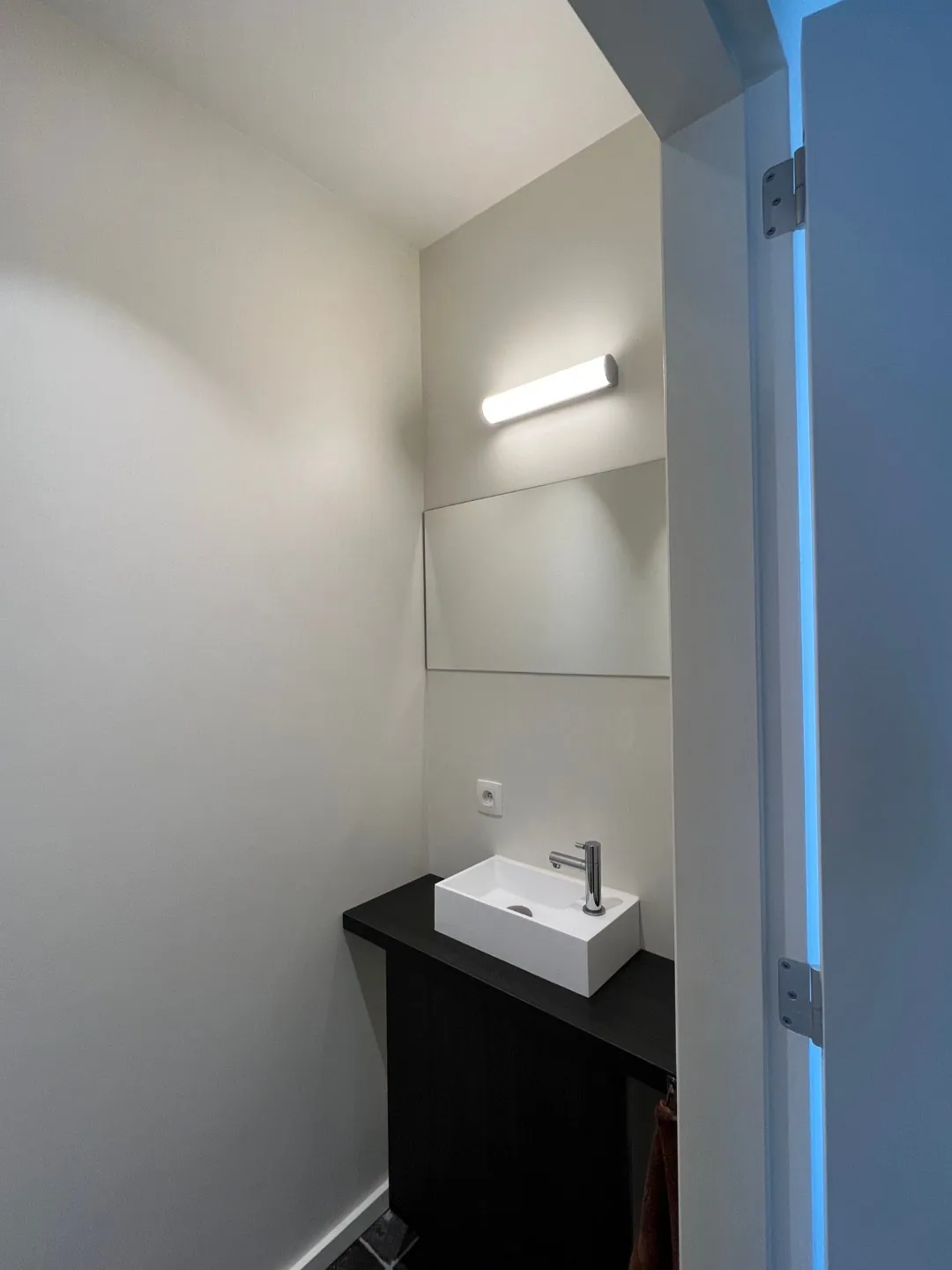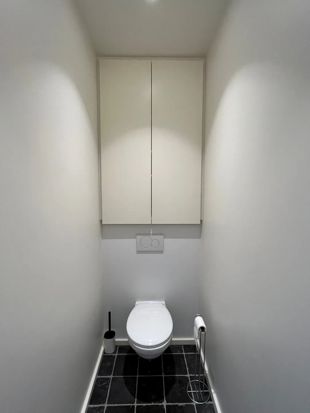 Het gelijkvloers beschikt over een multifunctionele ruimte met een afzonderlijk toilet en bergruimte onder de trap. Deze ruimte leent zich perfect tot de inrichting van een praktisch bureel, maar kan evengoed dienstdoen als derde slaapkamer.