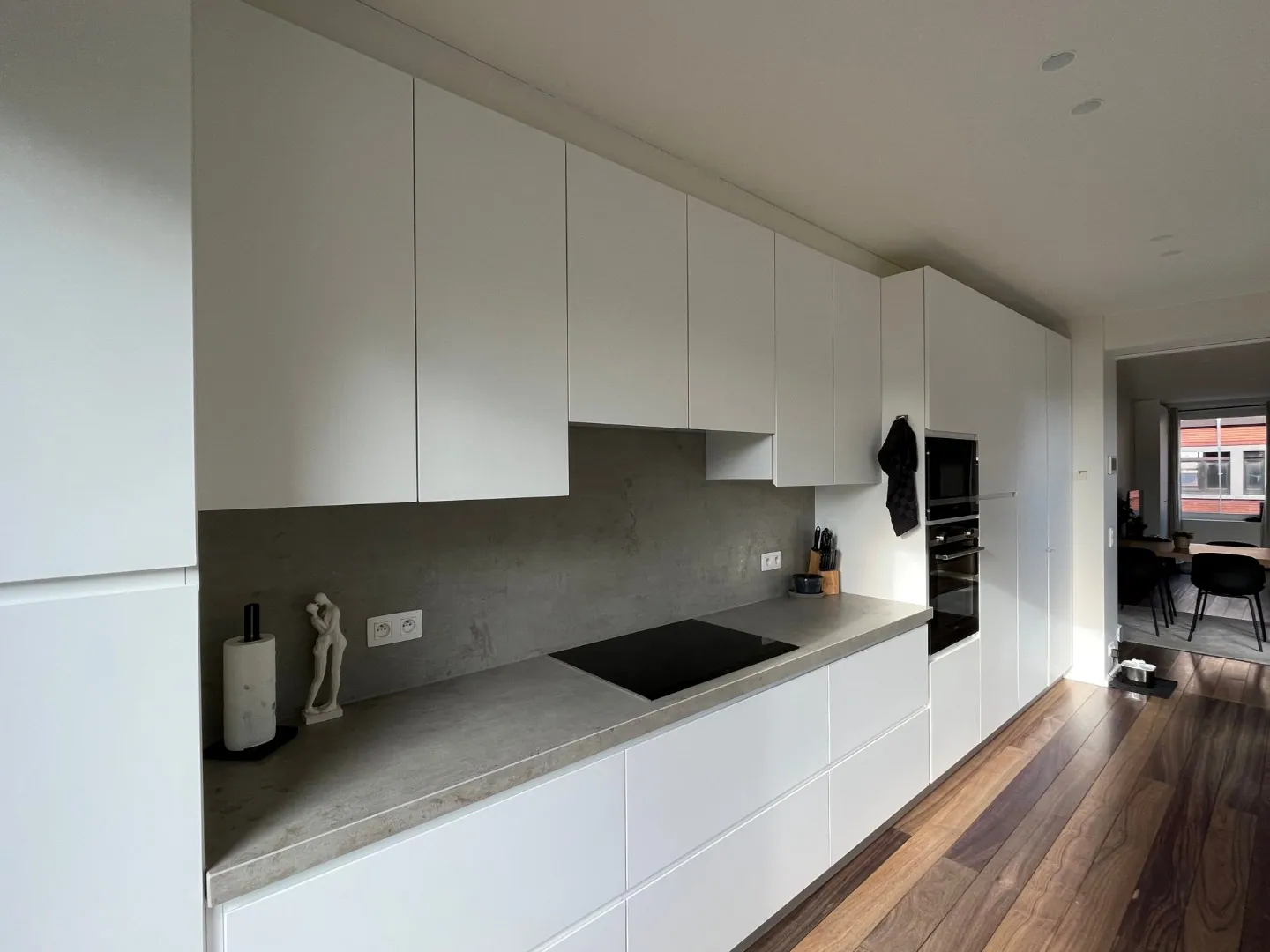 Op de eerste verdieping bevindt zich het leefgedeelte met een strak afgewerkte, volledig geïnstalleerde witte keuken. Aansluitend is er op deze verdieping ook een afzonderlijk toilet en een aangenaam zonneterras.