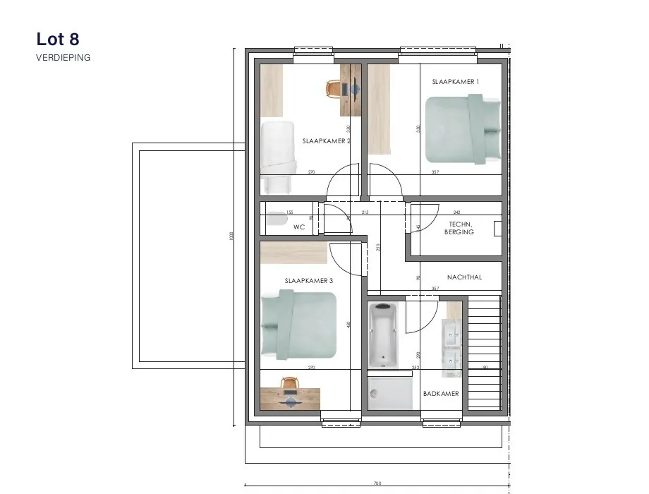 Op de eerste verdieping bevinden zich 3 slaapkamers, een afzonderlijk toilet, een technische berging en een modern afgewerkte badkamer met dubbel lavabomeubel, bad, douche en radiator.