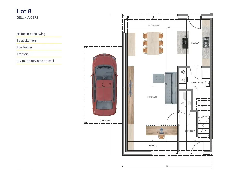 In de inkomhal vindt u meteen een gastentoilet, waarna u doorloopt naar de ruime en lichtovergoten leefruimte. Deze leefruimte sluit mooi aan op de volledig uitgeruste halfopen keuken (inclusief toestellen) en de praktische wasplaats/berging. In de living werd bovendien een handige bureauhoek geïntegreerd.