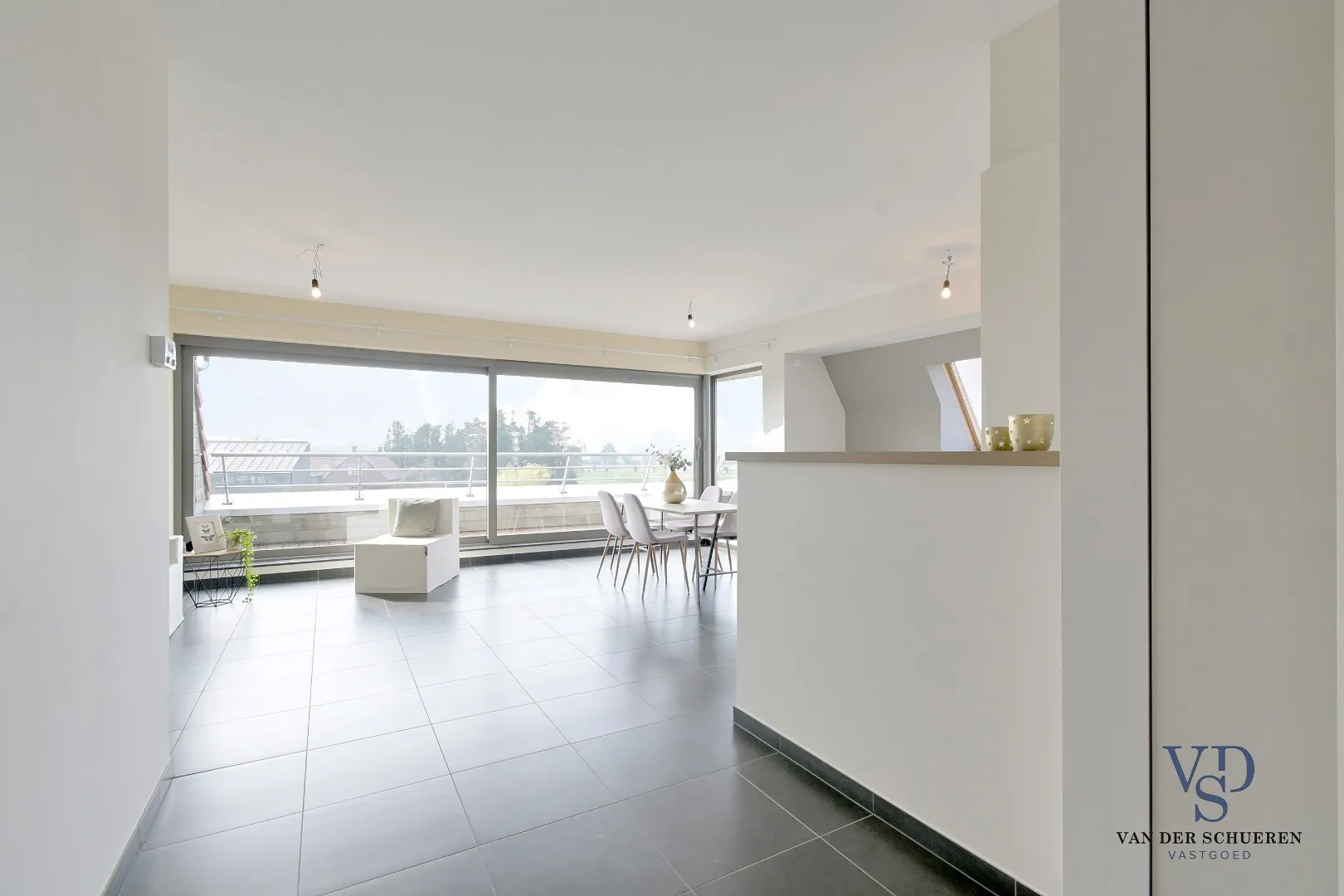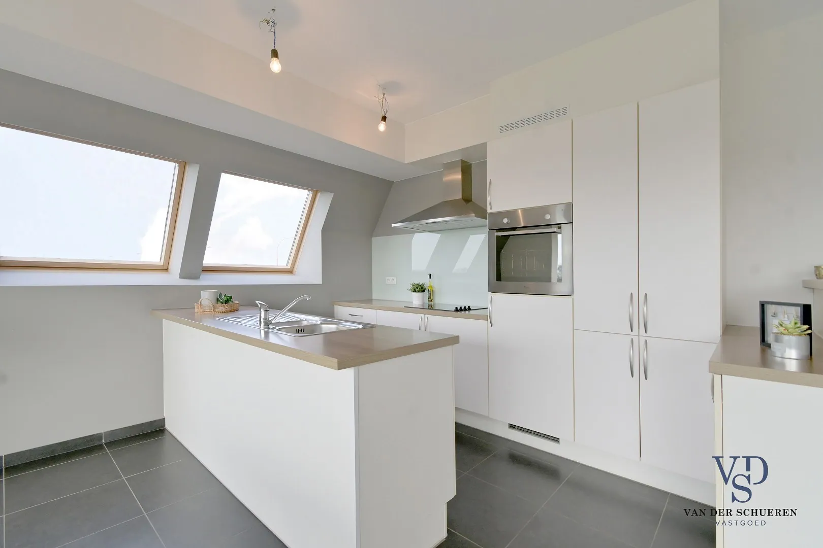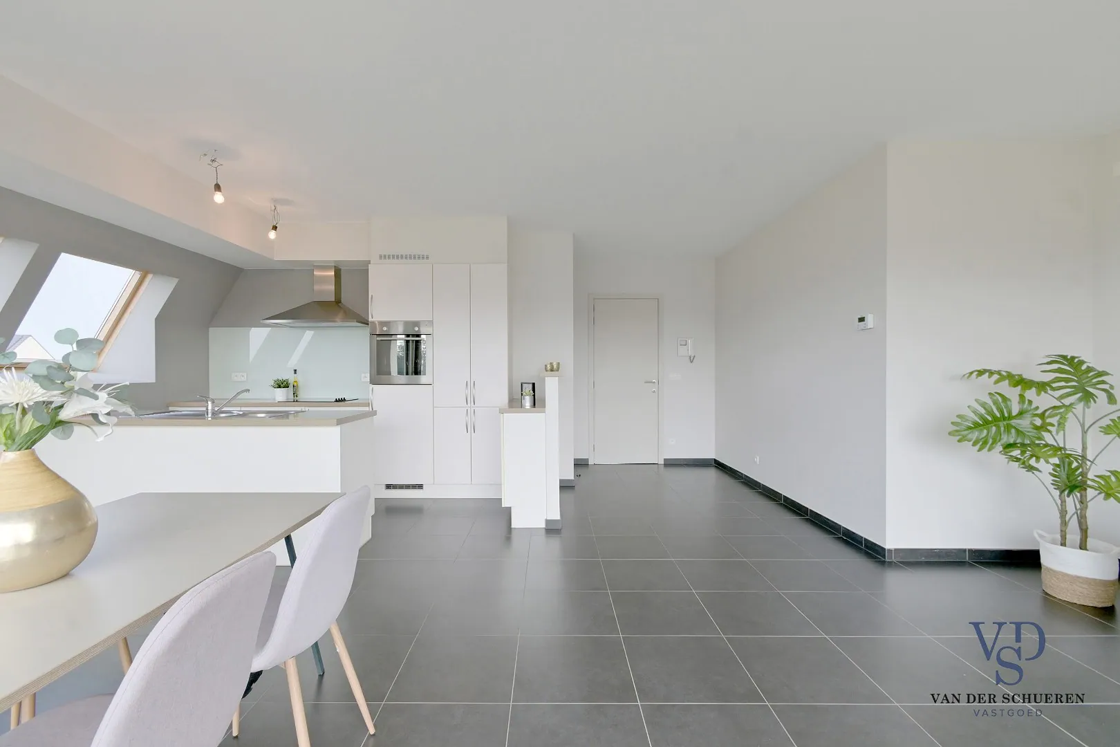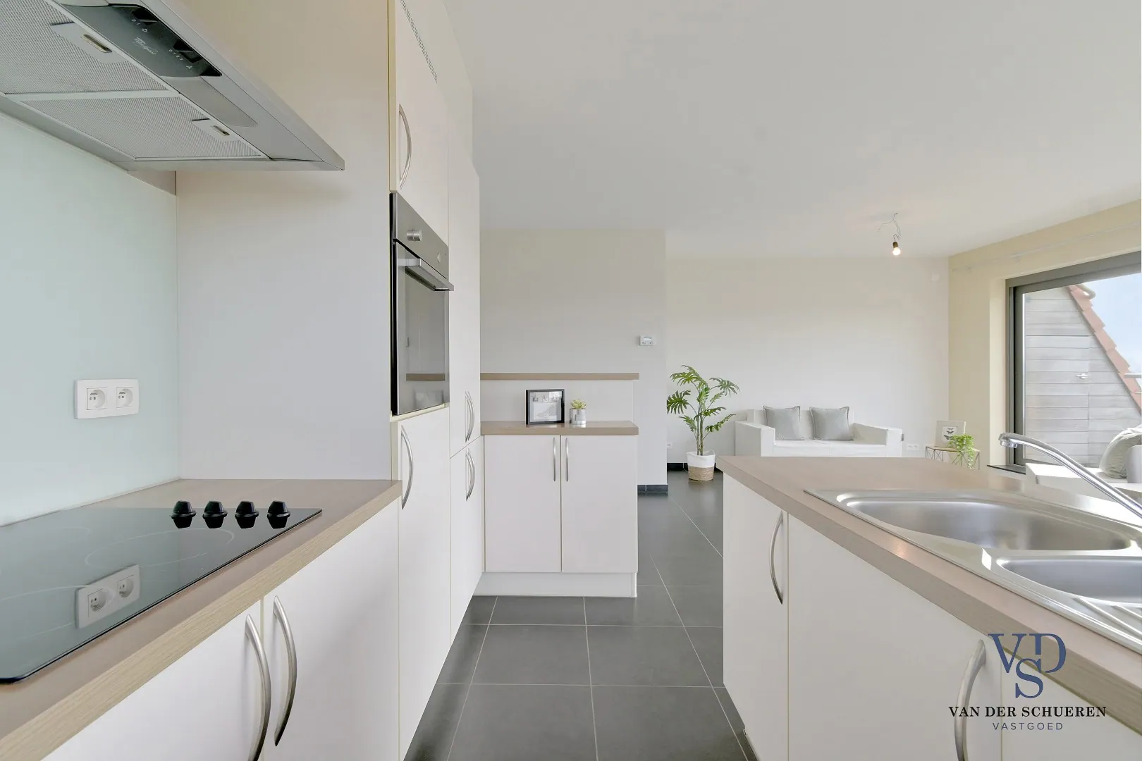 Ruime leefruimte met open keuken. 2 slaapkamers. Praktische badkamer, afzonderlijk gastentoilet en aparte hoek voor de wasmachine en droogkast.