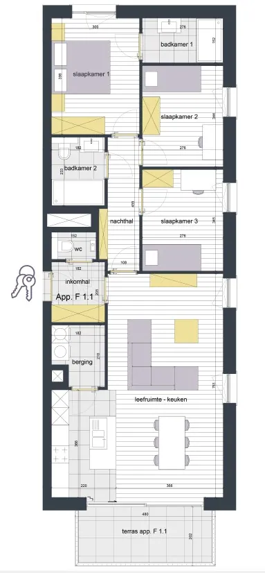 Het appartement beschikt over een inkomhal met gastentoilet, ruime leefruimte met open keuken, een aanpalende berging, 3 ruime slaapkamers en 2 badkamers. Via het terras geniet u van een prachtig uitzicht op het park, dé ideale plek om te ontspannen.