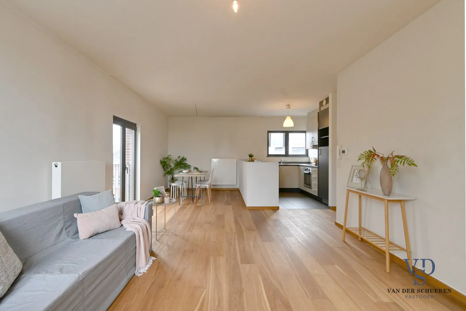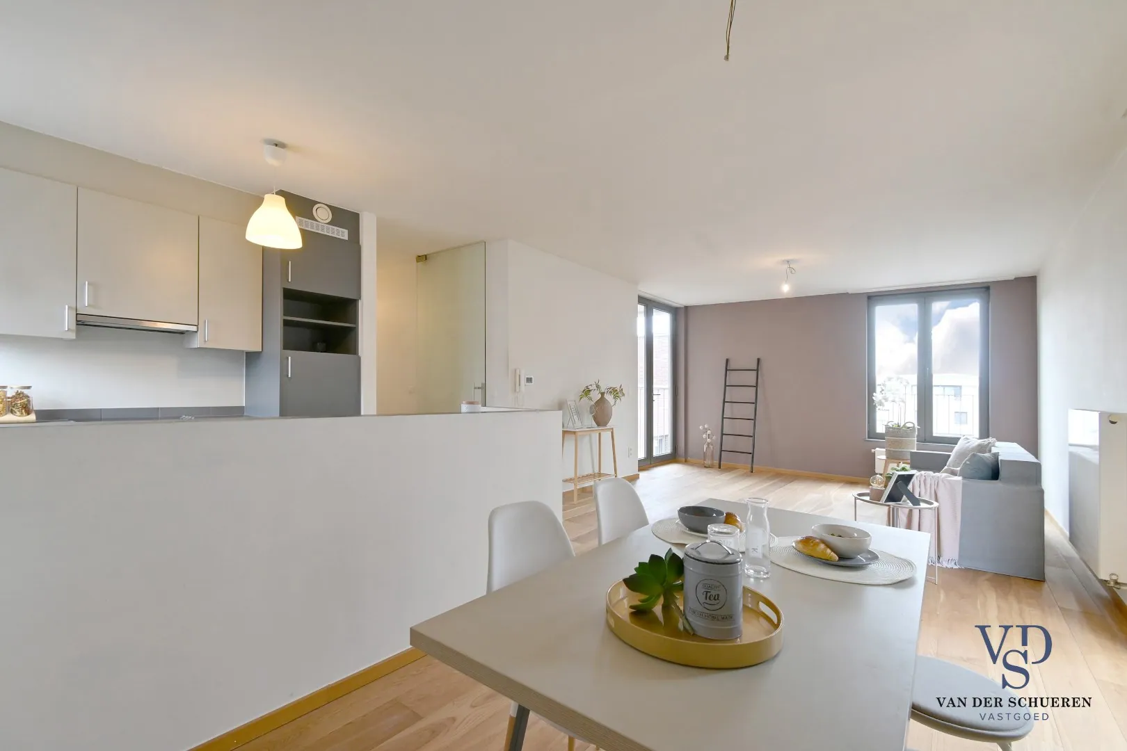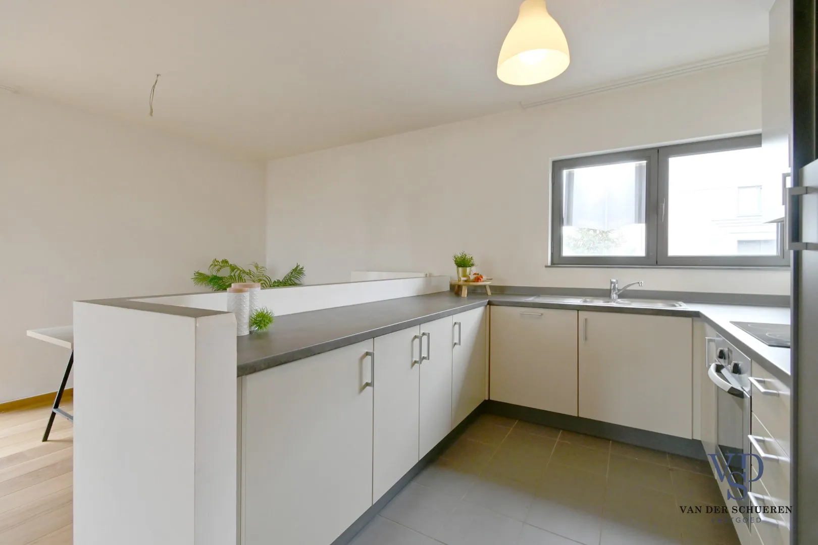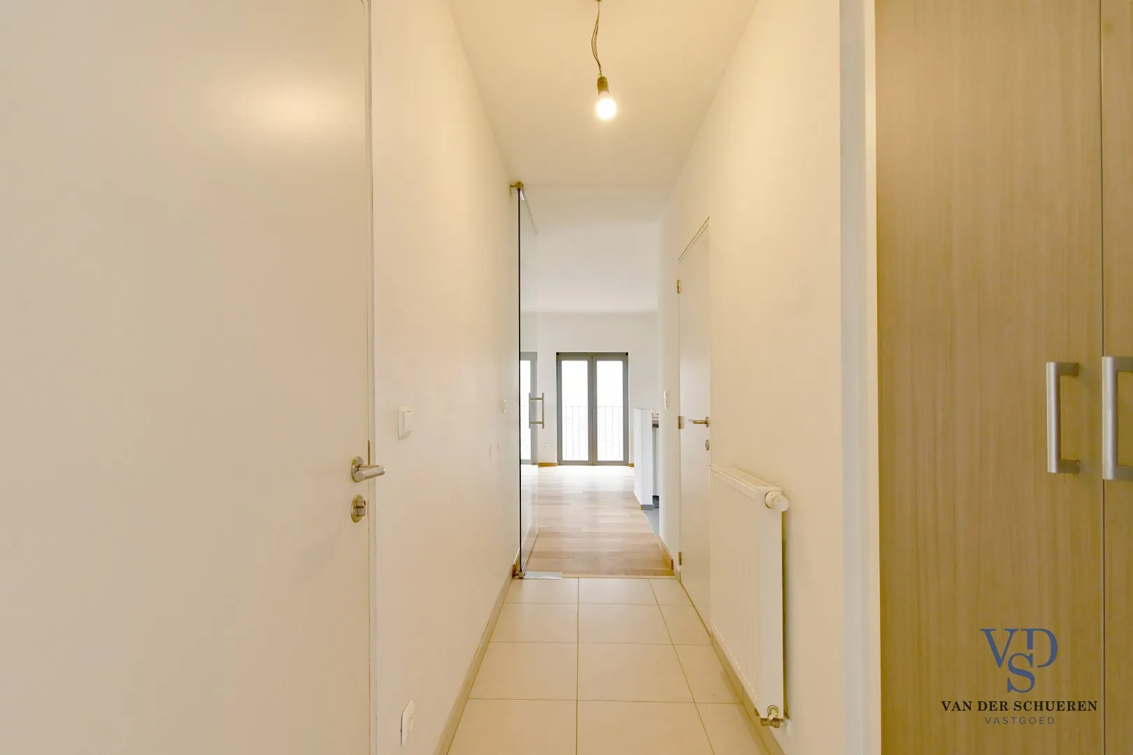 Het appartement bestaat uit een inkomhal, die u o.a. brengt naar de lichtrijke leefruimte met open, volledig uitgeruste keuken. De leefruimte sluit aan op een praktisch zonneterras. Verder is er een ruime slaapkamer, die aansluit op de tijdloze badkamer (voorzien van een aansluiting voor de wasmachine). Extra bergruimte is voorzien in de kelder.