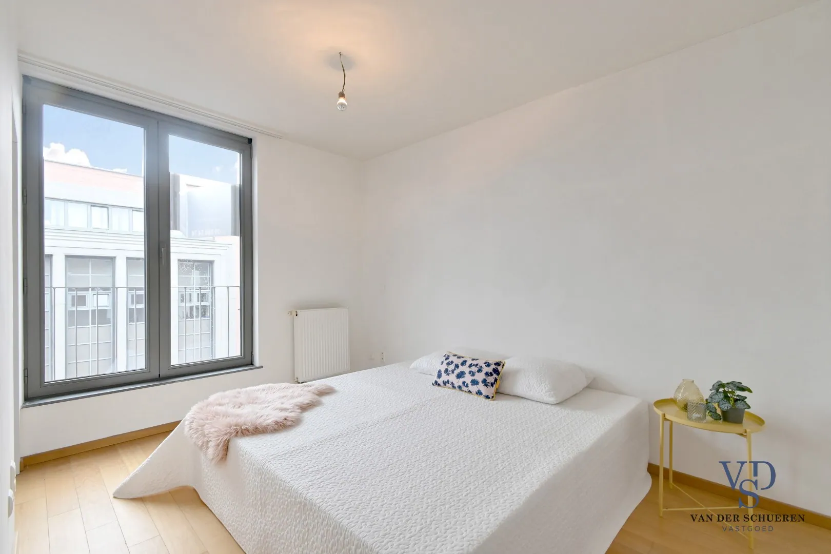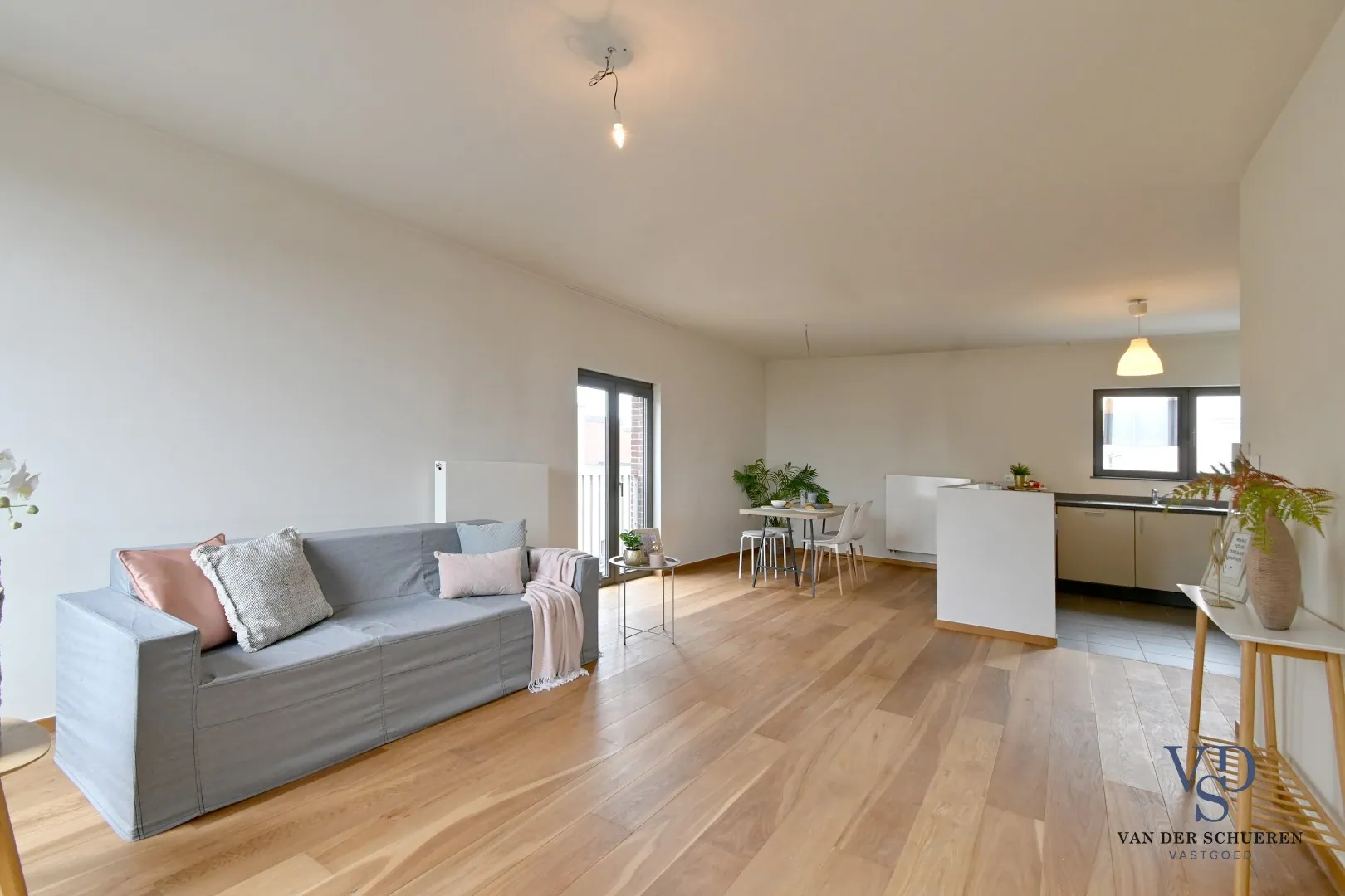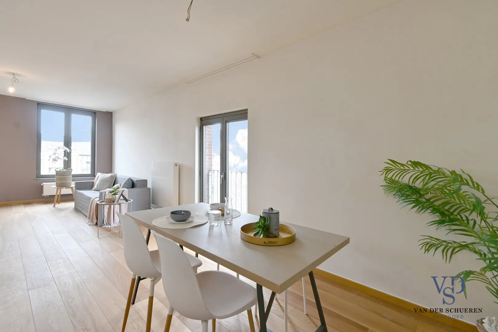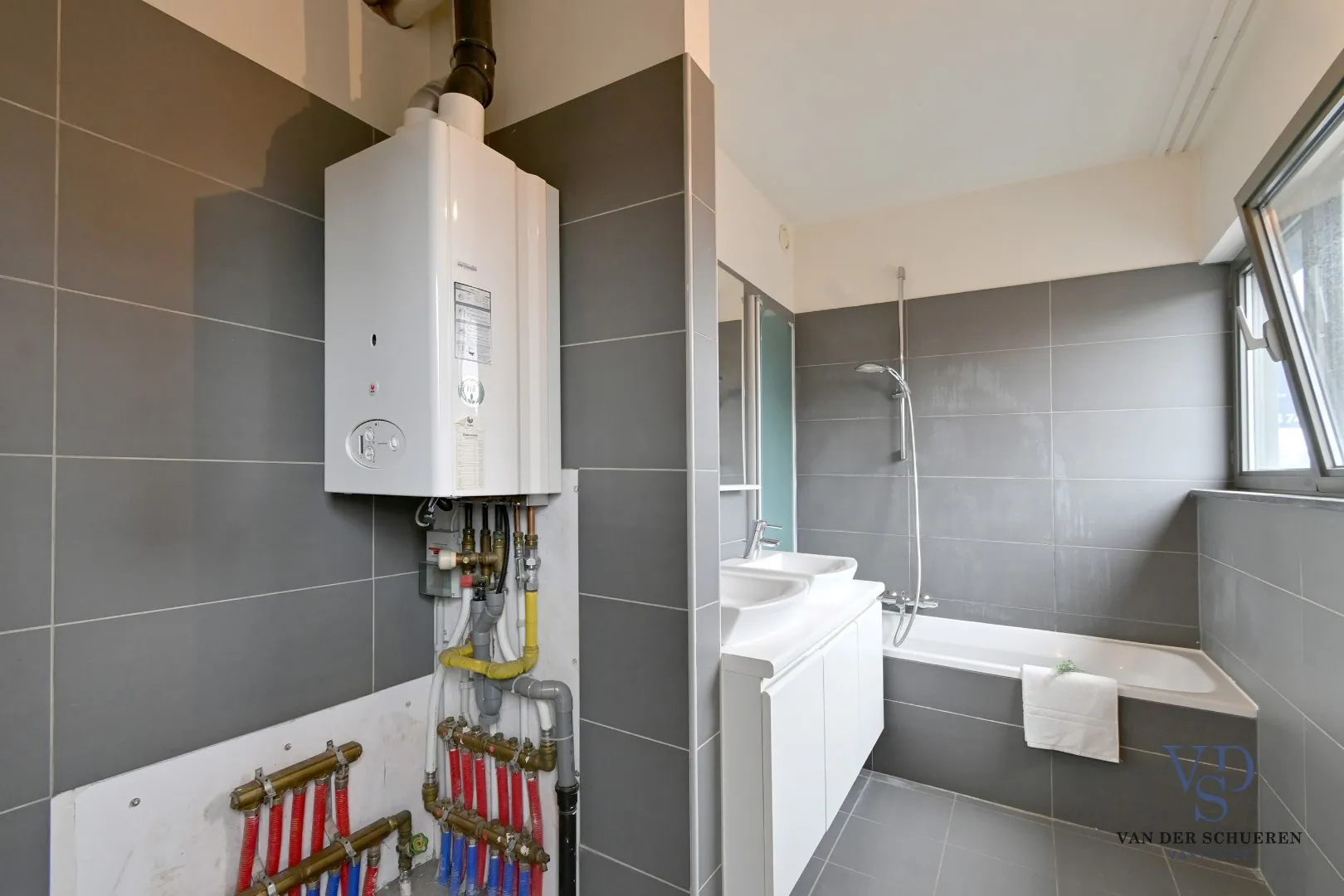 Het appartement bestaat uit een inkomhal, die u o.a. brengt naar de lichtrijke leefruimte met open, volledig uitgeruste keuken. De leefruimte sluit aan op een praktisch zonneterras. Verder is er een ruime slaapkamer, die aansluit op de tijdloze badkamer (voorzien van een aansluiting voor de wasmachine). Extra bergruimte is voorzien in de kelder.