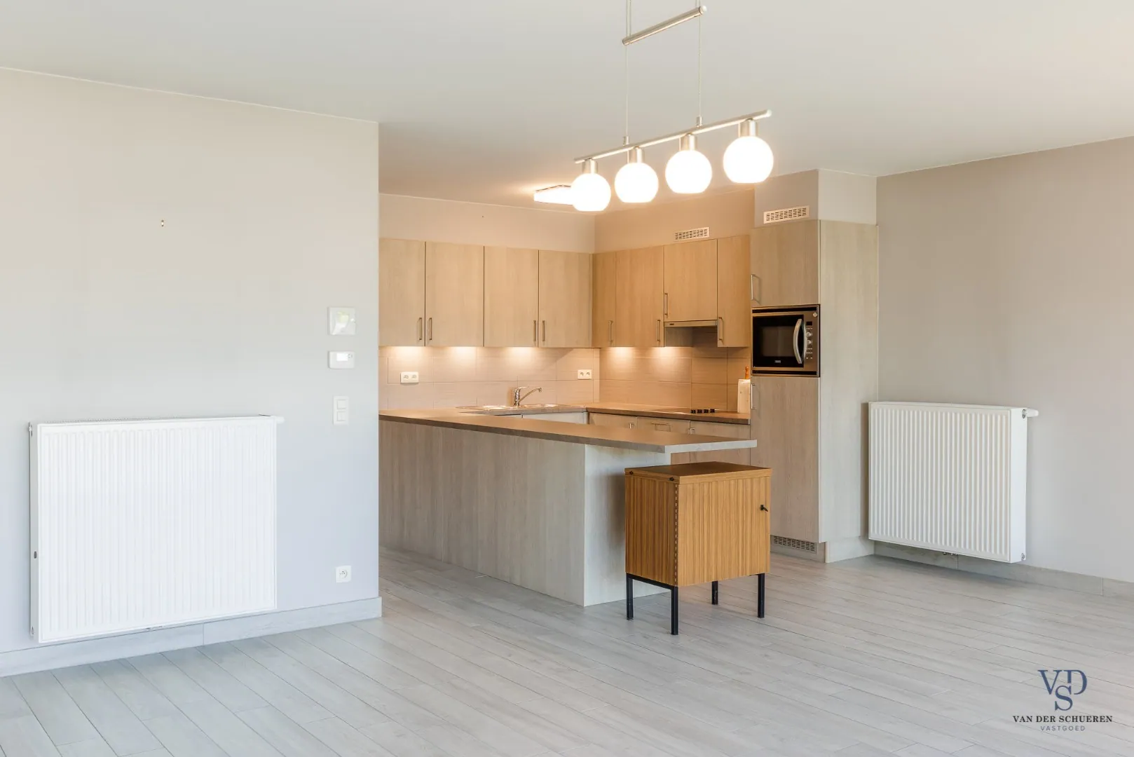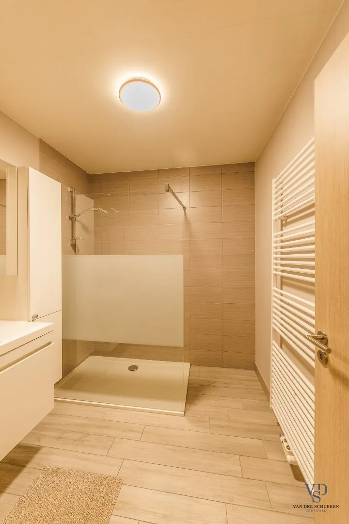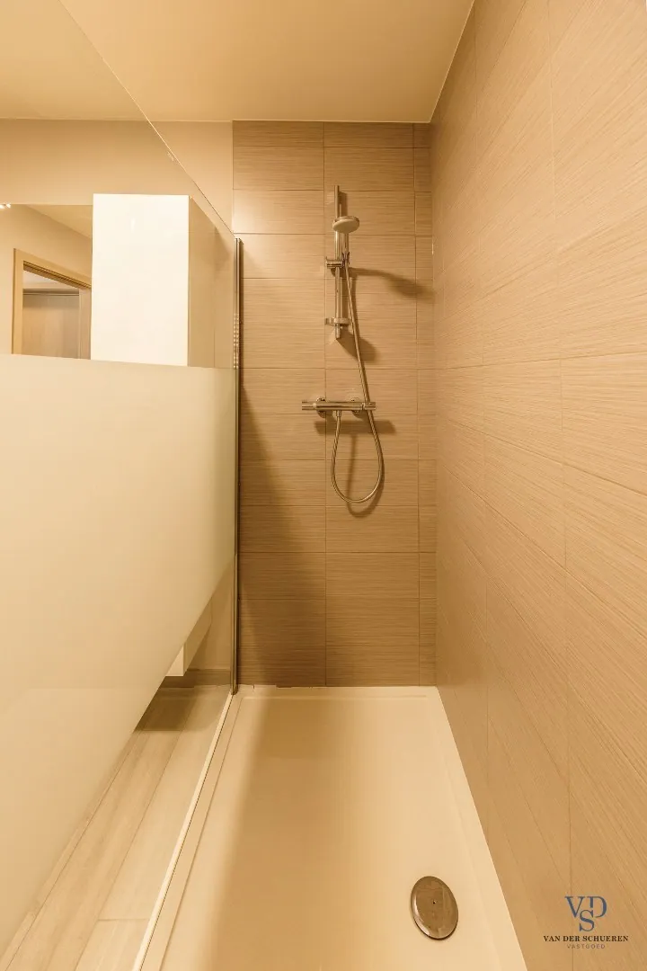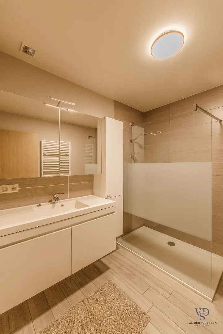 De indeling omvat een lichtrijke leefruimte met open keuken, een gezellig terras met uitschuifbare luifel, een afzonderlijk toilet, een berging, een badkamer met inloopdouche en dubbel lavabomeubel, en twee comfortabele slaapkamers.