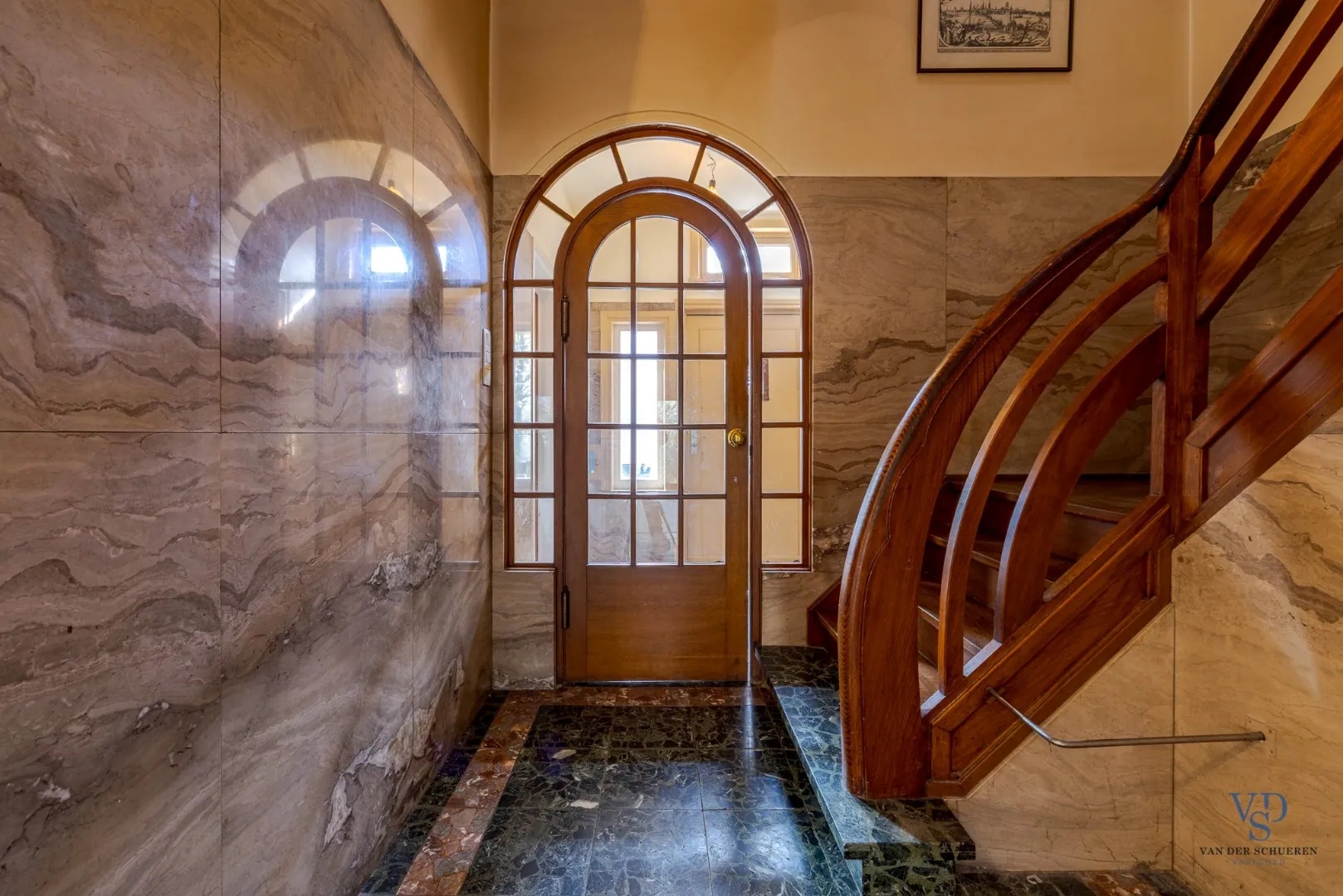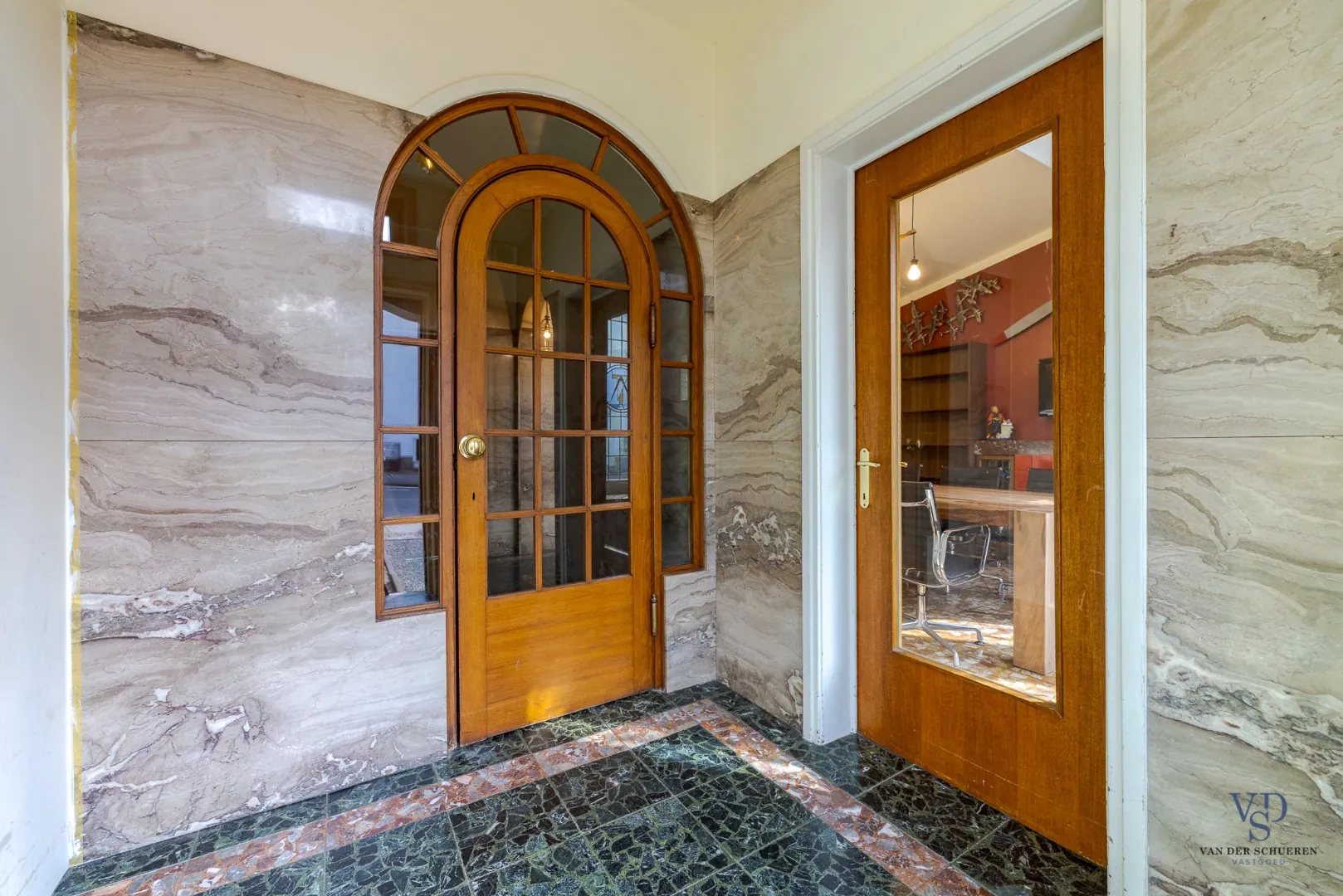 Bij het betreden van de woning komt u binnen in een statige inkomhal. Rechts bevindt zich een (momenteel ingerichte) ruime vergaderzaal, ideaal voor een zelfstandige activiteit of vrij beroep. Links bevindt zich een gastentoilet. Verder is er toegang tot de inpandige garage, en het woongedeelte.
