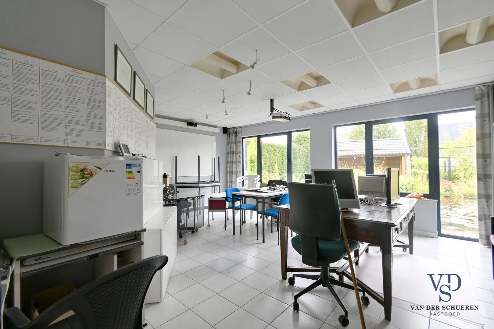 Ook een les- of vergaderruimte maakt deel uit van het gelijkvloers, wat het pand uitermate geschikt maakt voor opleidingen, workshops of teamvergaderingen. Aan de zijkanten (links en rechts) bevinden zich in totaal vier garages, die samen met de parkeermogelijkheden aan de voorzijde én achterzijde van het gebouw zorgen voor een uitstekende bereikbaarheid. Ook een kelder is voorzien.