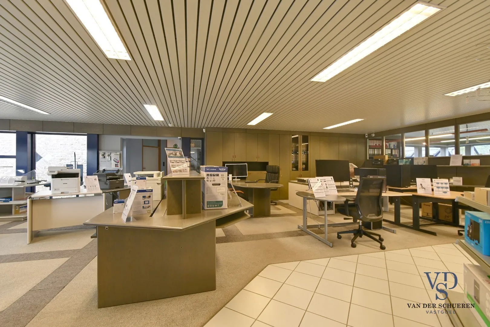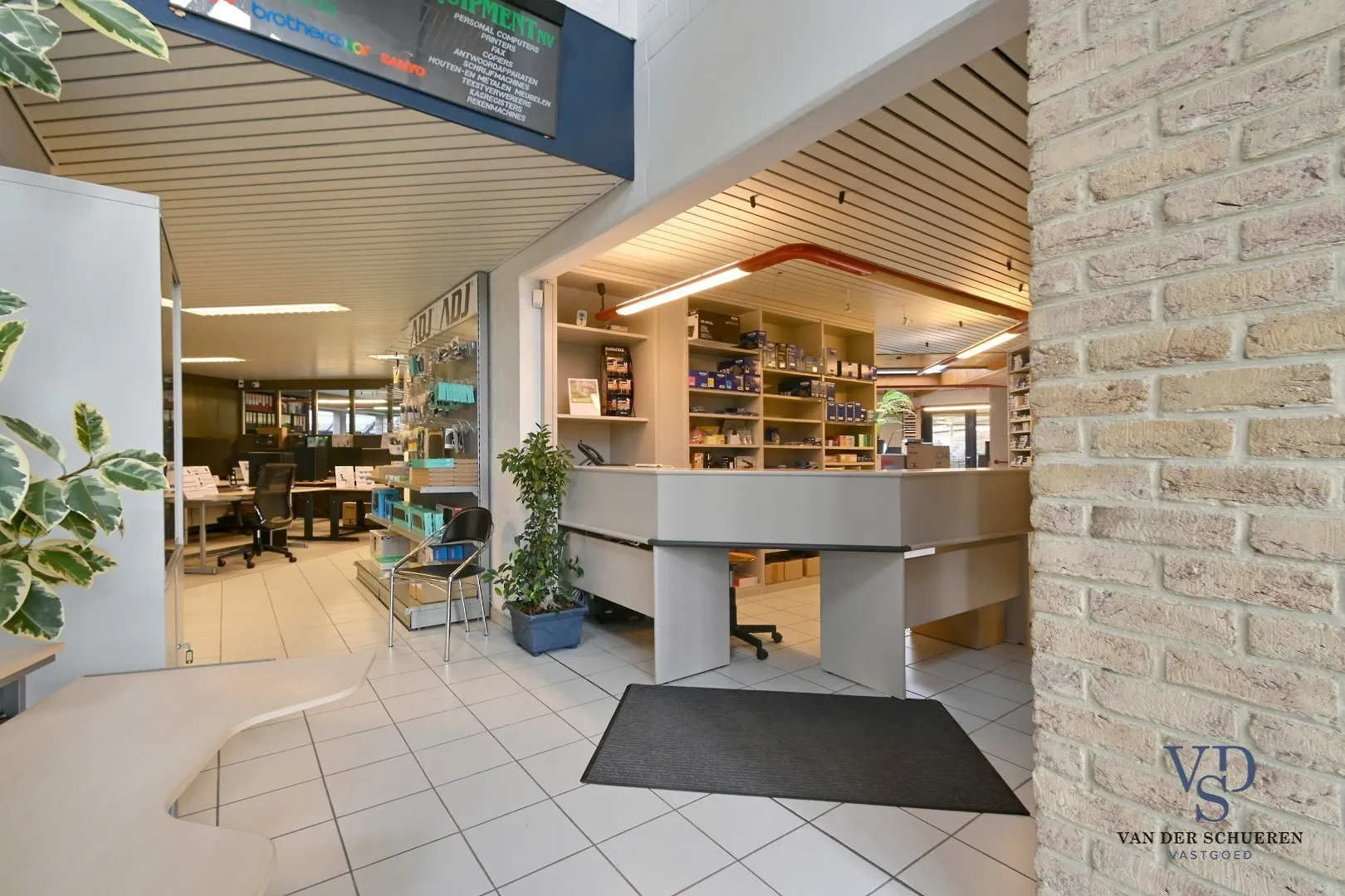 Bij het betreden van het gebouw komt u terecht in een statige inkomhal die rechtstreeks aansluit op de balie en doorloopt naar de toonzaal en verkoopruimte. Deze open en representatieve zone vormt het kloppend hart van het gelijkvloers en creëert een professionele eerste indruk voor bezoekers en klanten.