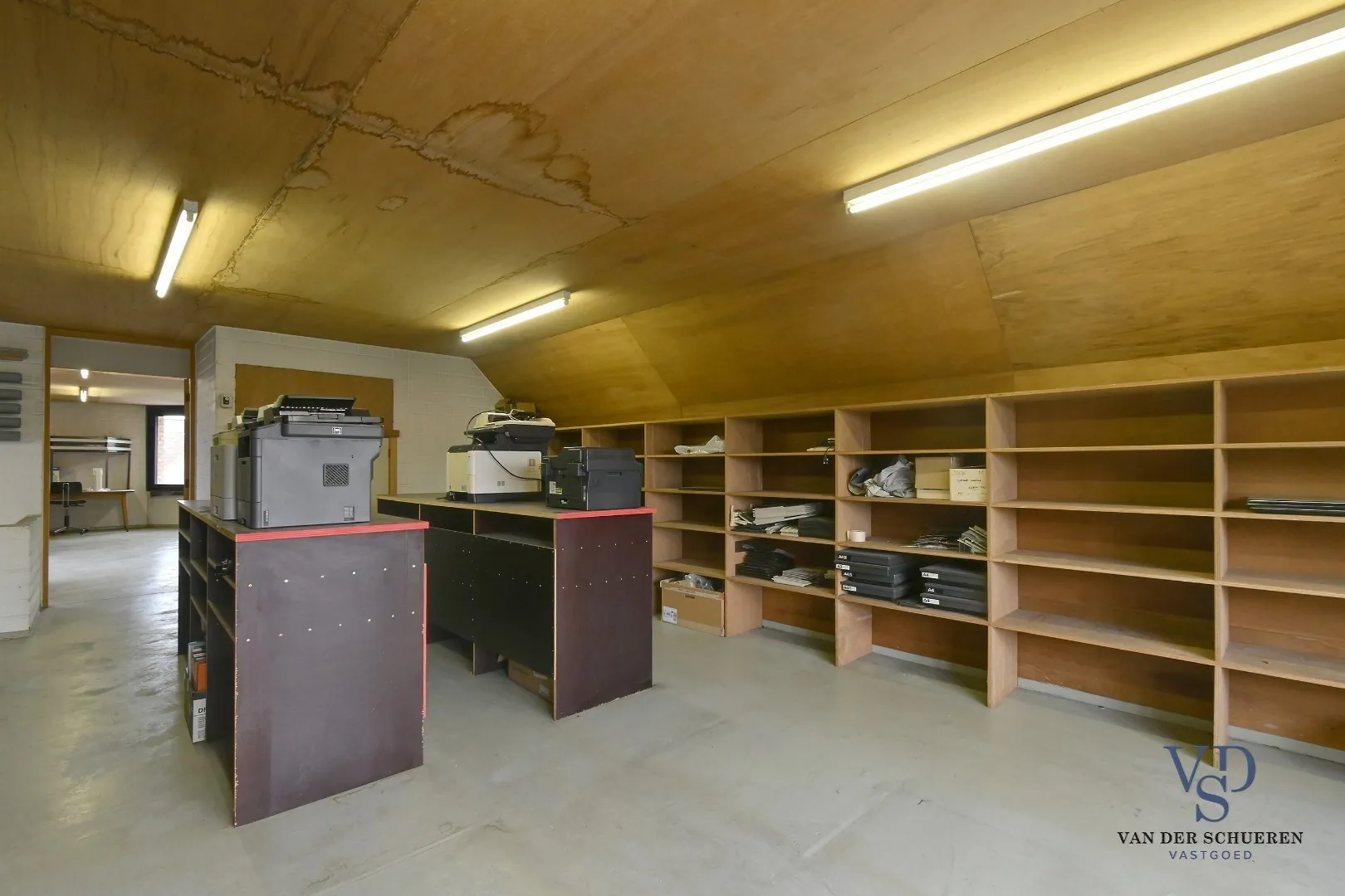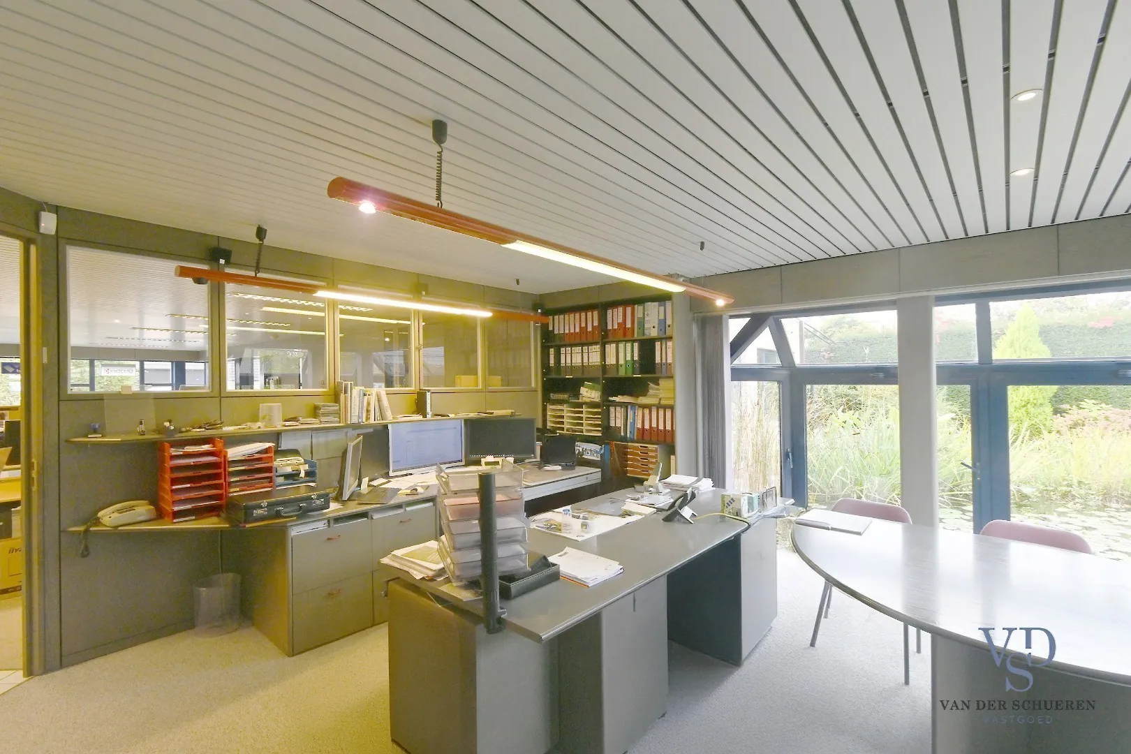 Verder zijn er meerdere afzonderlijke burelen voorzien, waaronder één kantoor met uitzicht op de achtergelegen vijver – een rustgevende plek die werken in een kalme, groene omgeving mogelijk maakt. Daarnaast is er een open landschapskantoor, een praktische kitchenette, een apart toilet en meerdere bergruimtes - werkruimtes aanwezig.