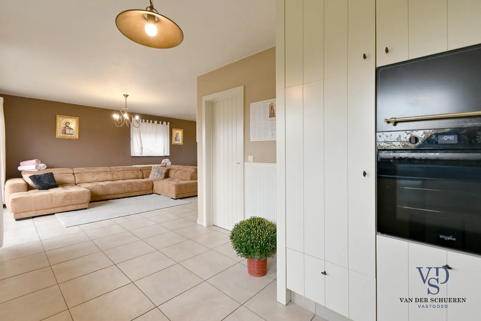 Bij het binnenkomen betreed je de inkomhal met gastentoilet en praktische berging met aansluitingen voor o.a. wasmachine en droogkast. Vanuit de hal kom je in de lichte en ruime leefruimte met een open keuken, die deels achter de hoek is ingewerkt. Aansluitend aan de keuken bevindt zich nog een tweede berging.
