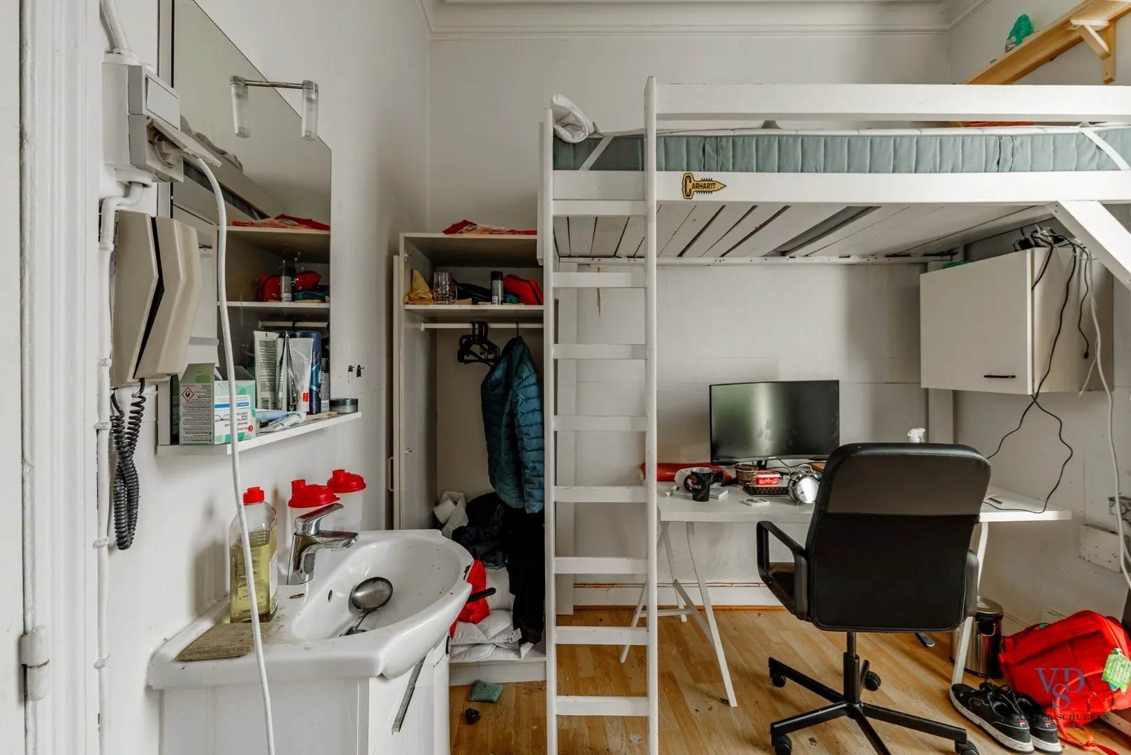 De 6 studentenkamers beschikken elk over een eigen keuken, lavabo, leefruimte/slaapkamer en delen samen 2 sanitaire cellen met elk een toilet en een douche.