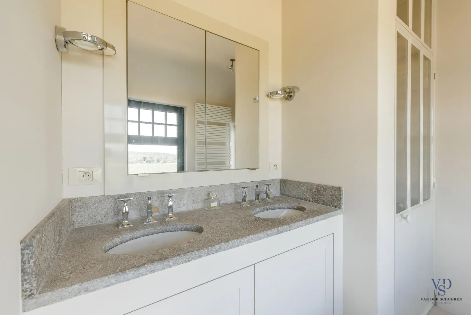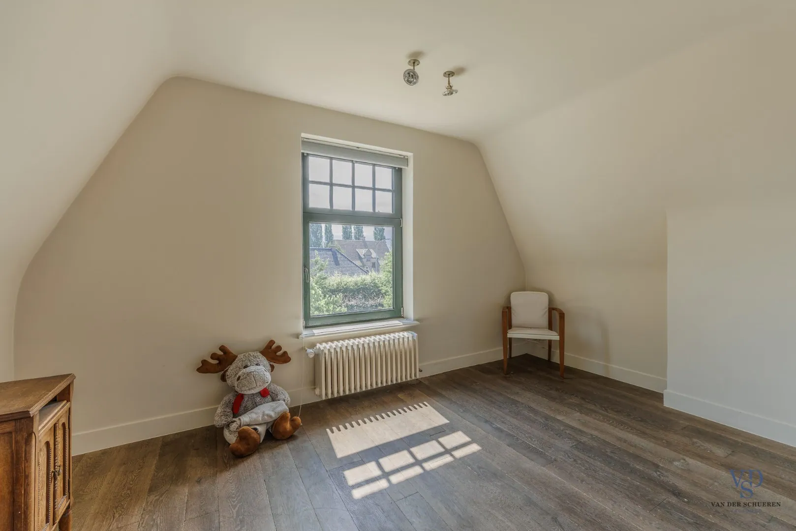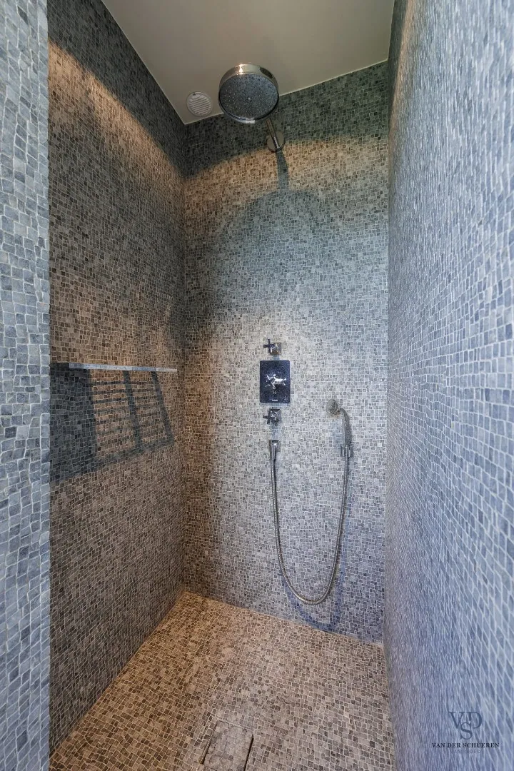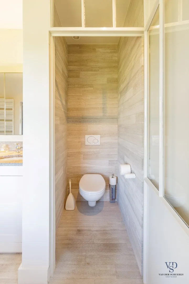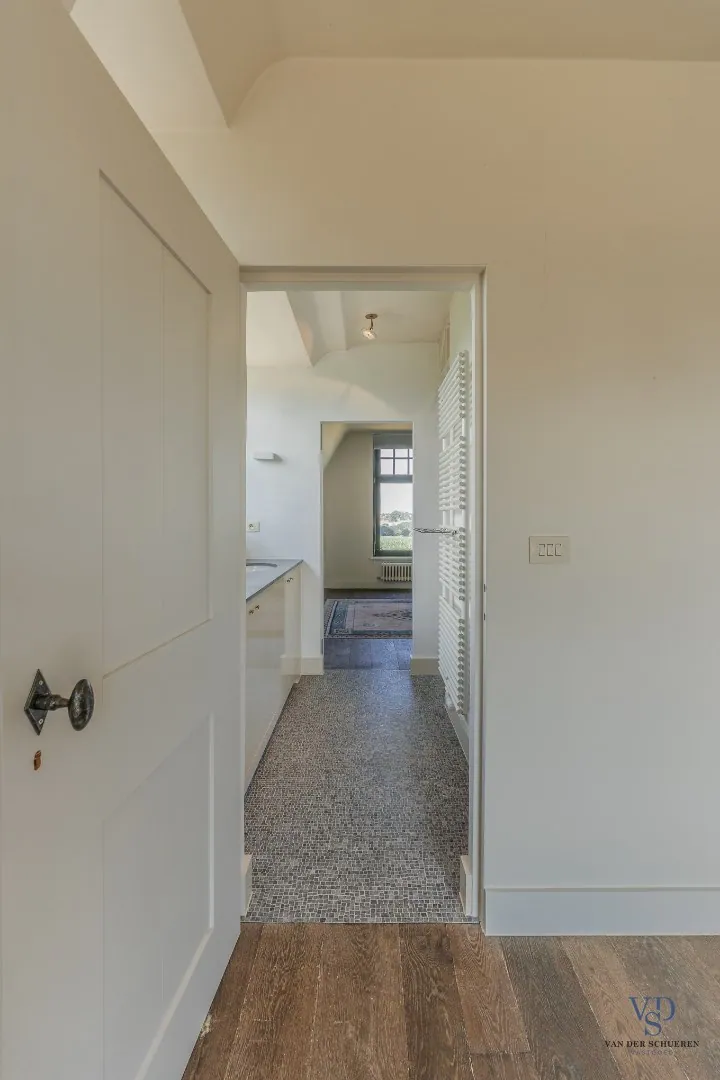 De stijlvolle trap leidt naar de eerste verdieping, waar drie volwaardige slaapkamers u ontvangen. De master bedroom beschikt over een dressing en een luxueuze, private badkamer (met bad, douche, dubbel lavabomeubel en toilet). De twee overige slaapkamers delen een tweede, hoogwaardig afgewerkte badkamer. Daarnaast is er nog een extra vestiaireruimte met geïntegreerde wastafel aanwezig.