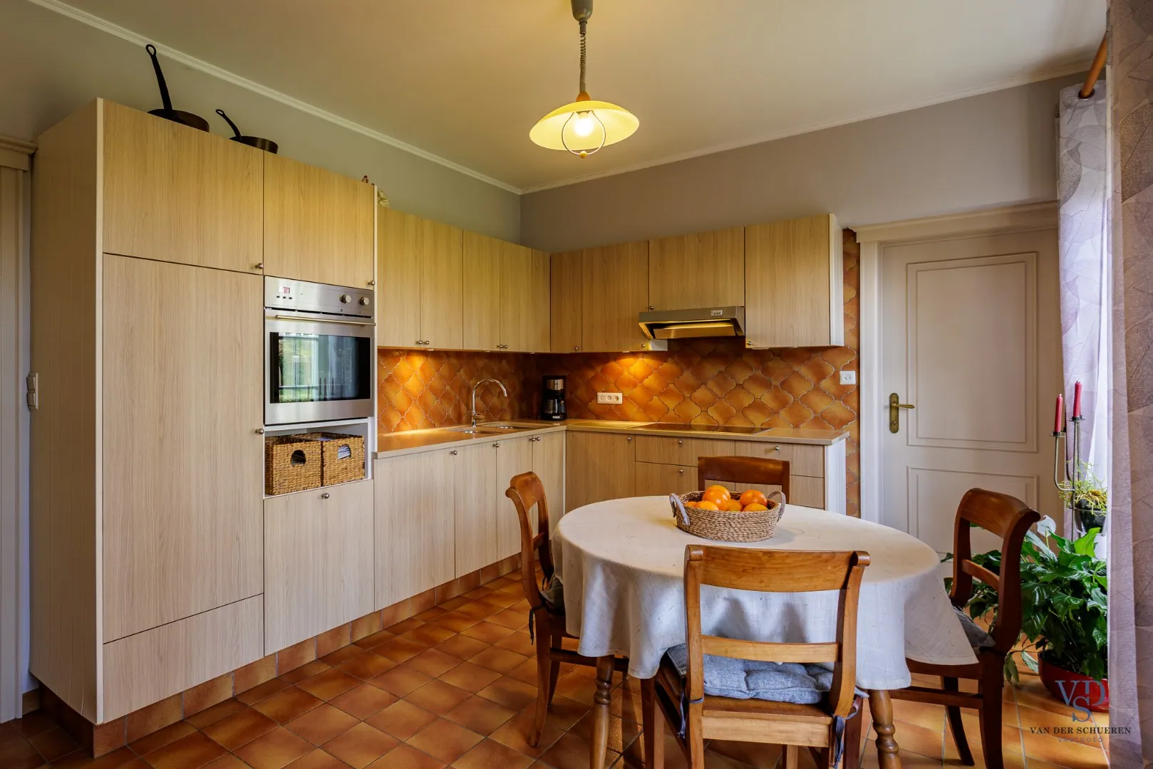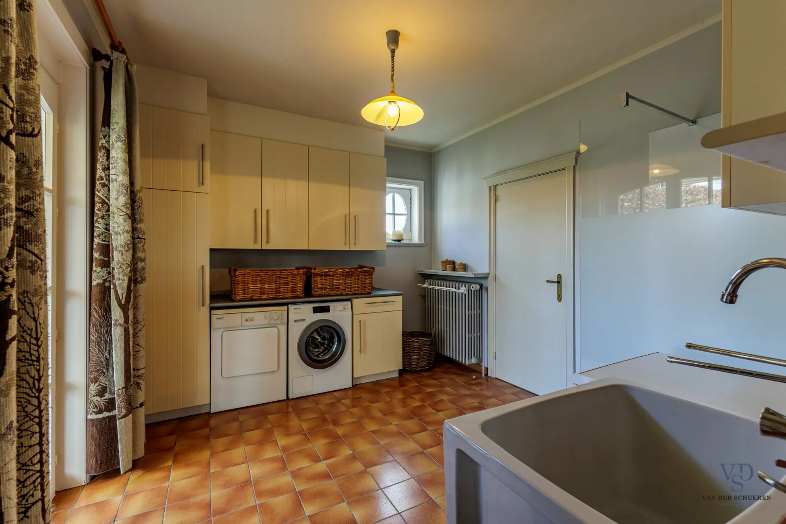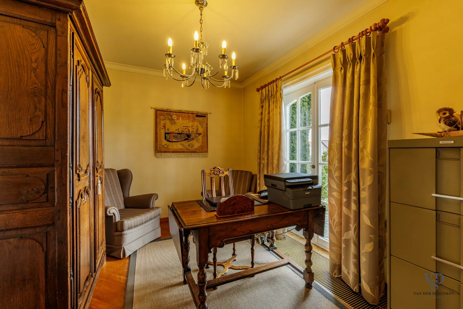 Aansluitend vindt u een afzonderlijke keuken met aanpalend een handige berging. Daarnaast beschikt de woning over een bijkeuken en sanitaire cel, en een gastentoilet wat extra comfort en functionaliteit biedt. Een afzonderlijk bureel maakt thuiswerken in alle rust perfect mogelijk.