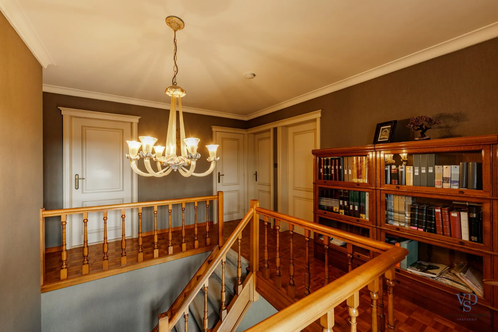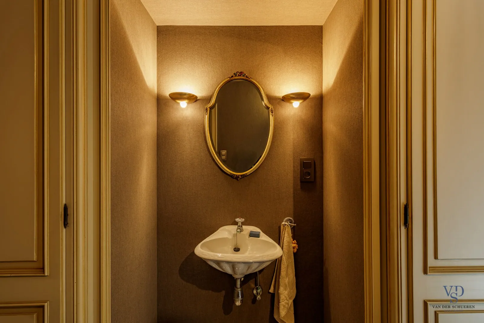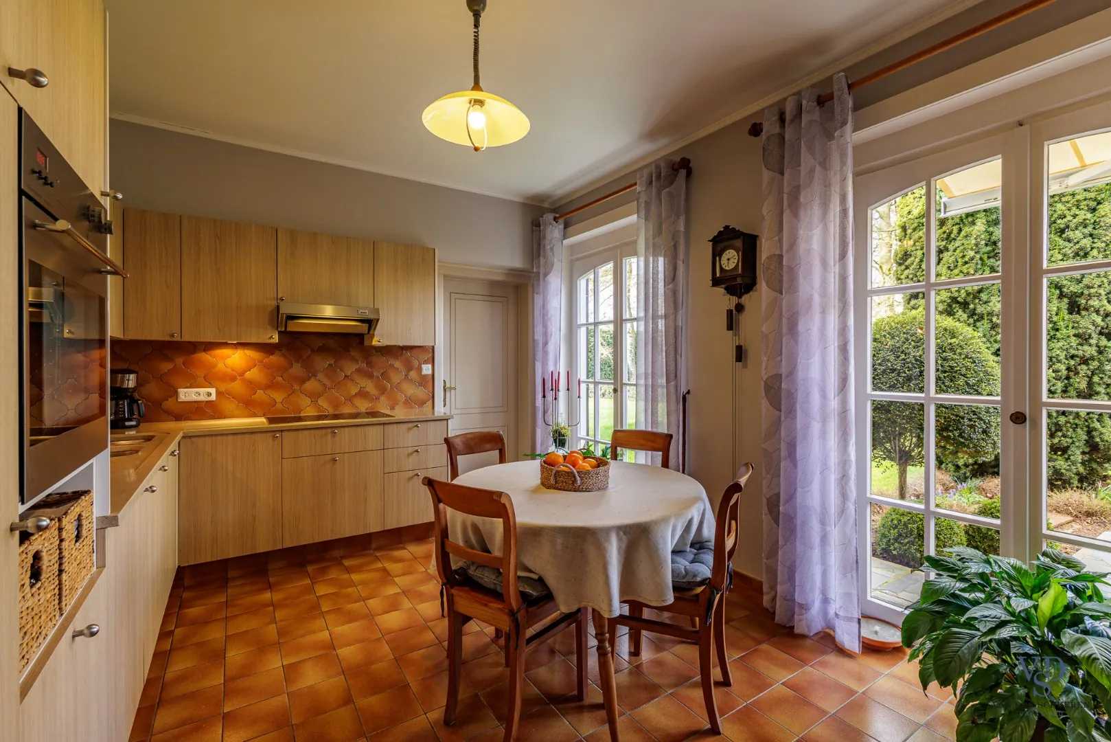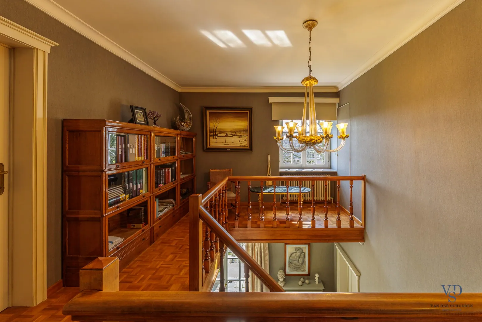 Aansluitend vindt u een afzonderlijke keuken met aanpalend een handige berging. Daarnaast beschikt de woning over een bijkeuken en sanitaire cel, en een gastentoilet wat extra comfort en functionaliteit biedt. Een afzonderlijk bureel maakt thuiswerken in alle rust perfect mogelijk.