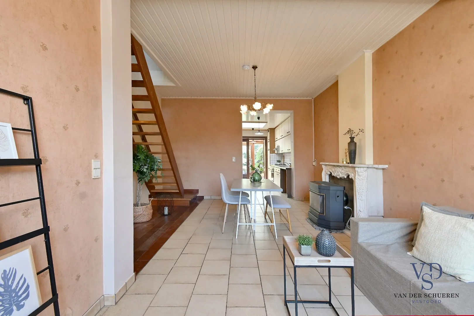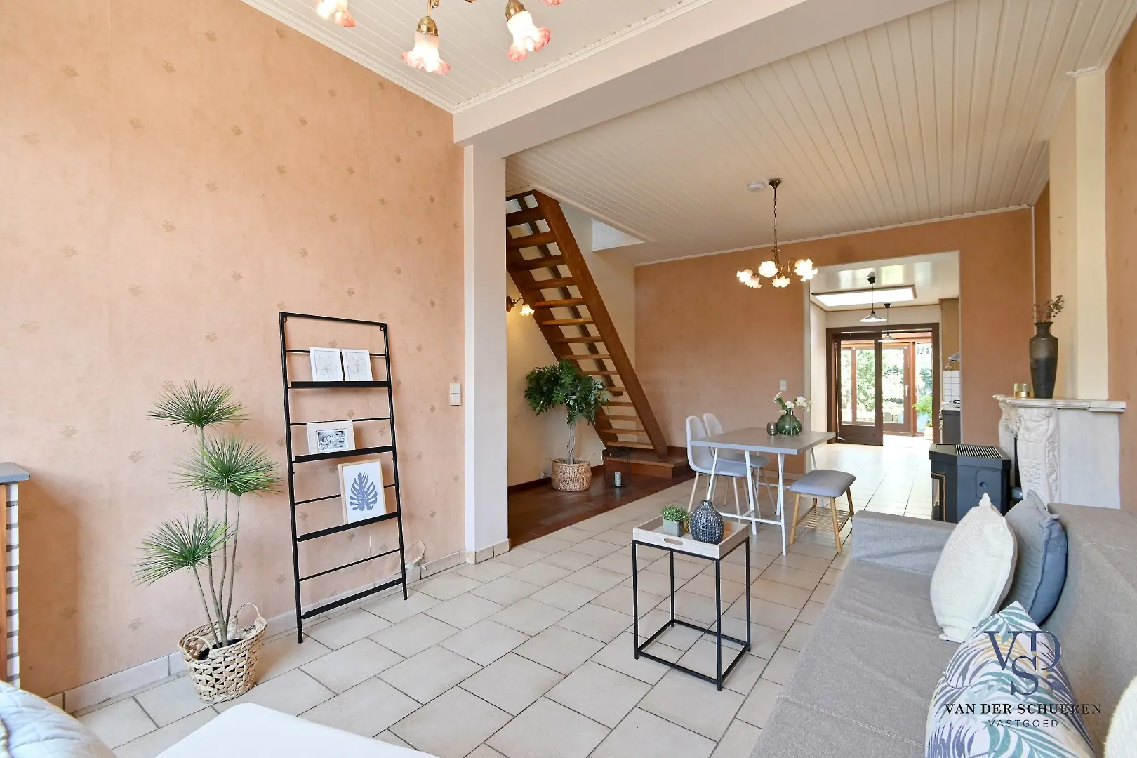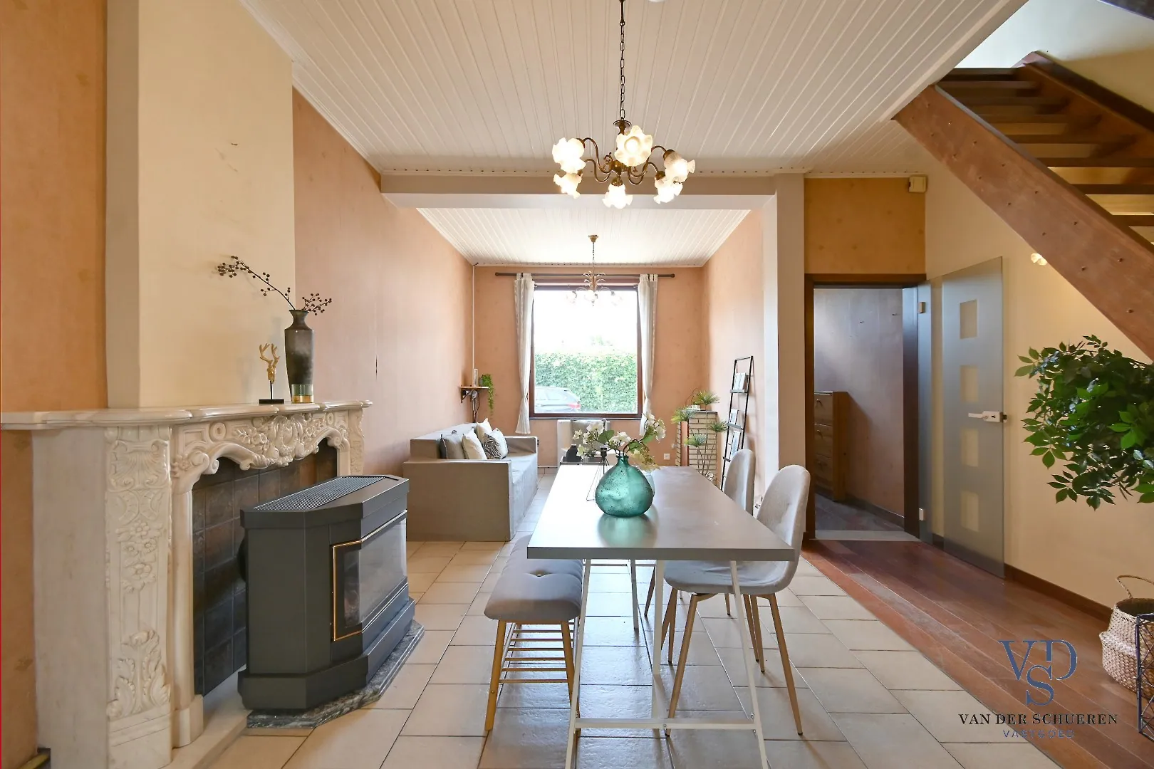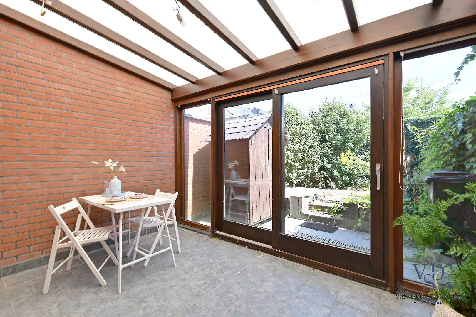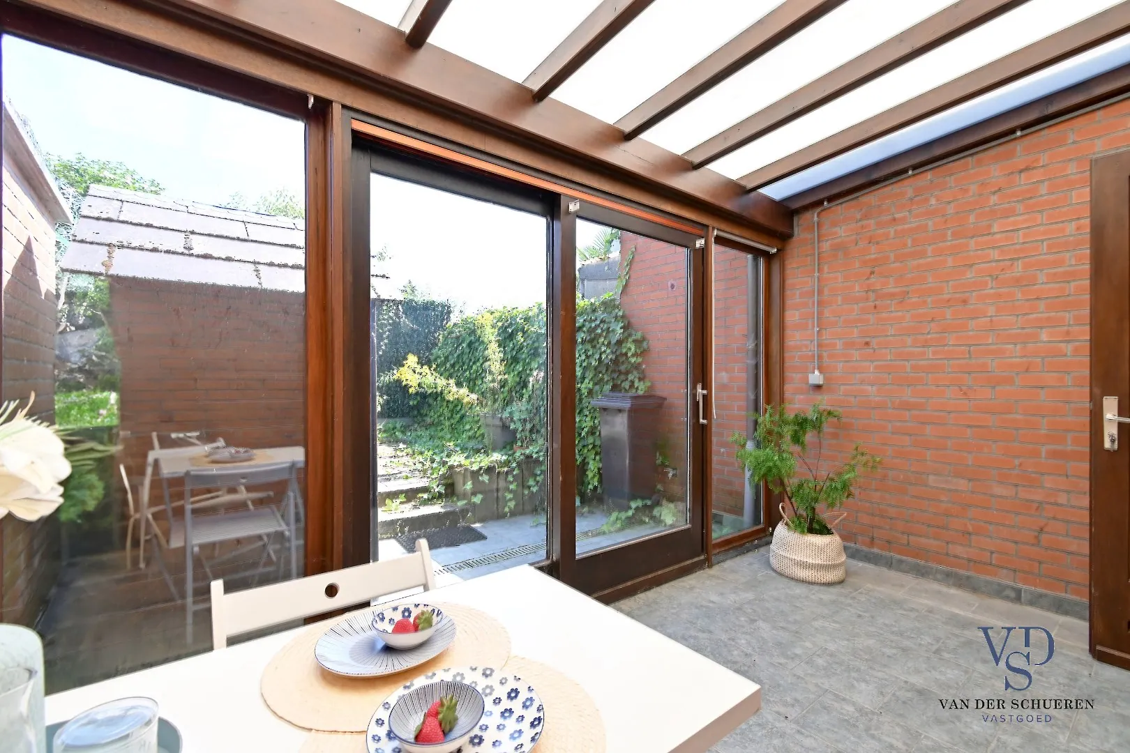 Op het gelijkvloers treffen we een functionele inkom, ruime leefruimte, keuken, badkamer en veranda. Eveneens een gezellige stadstuin.